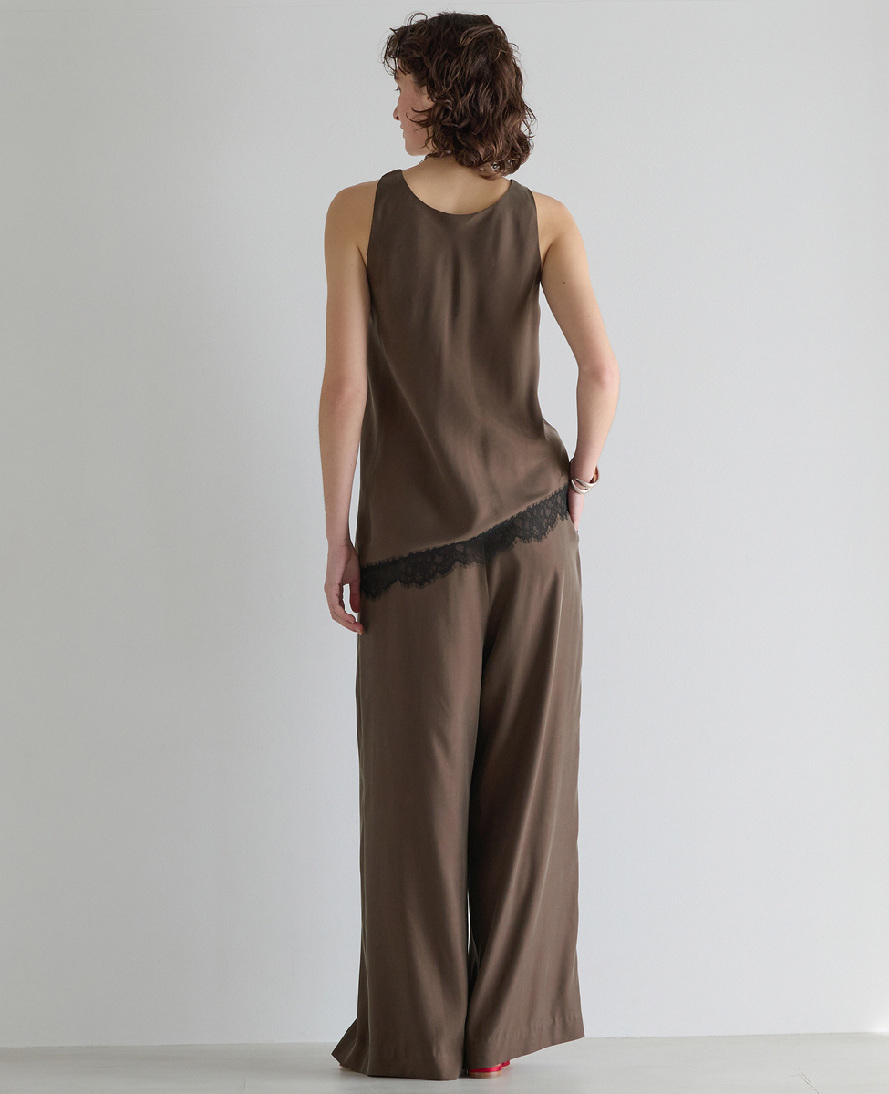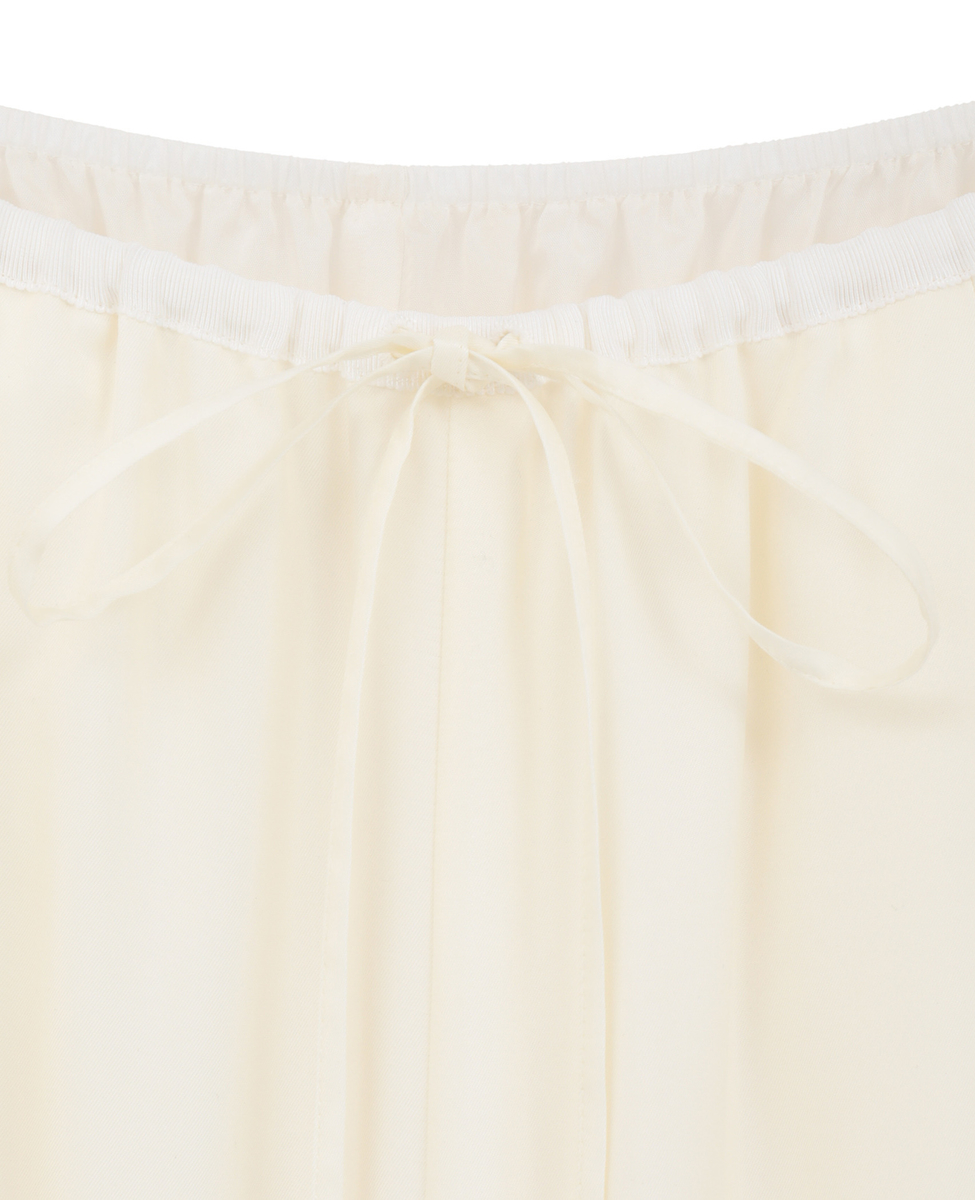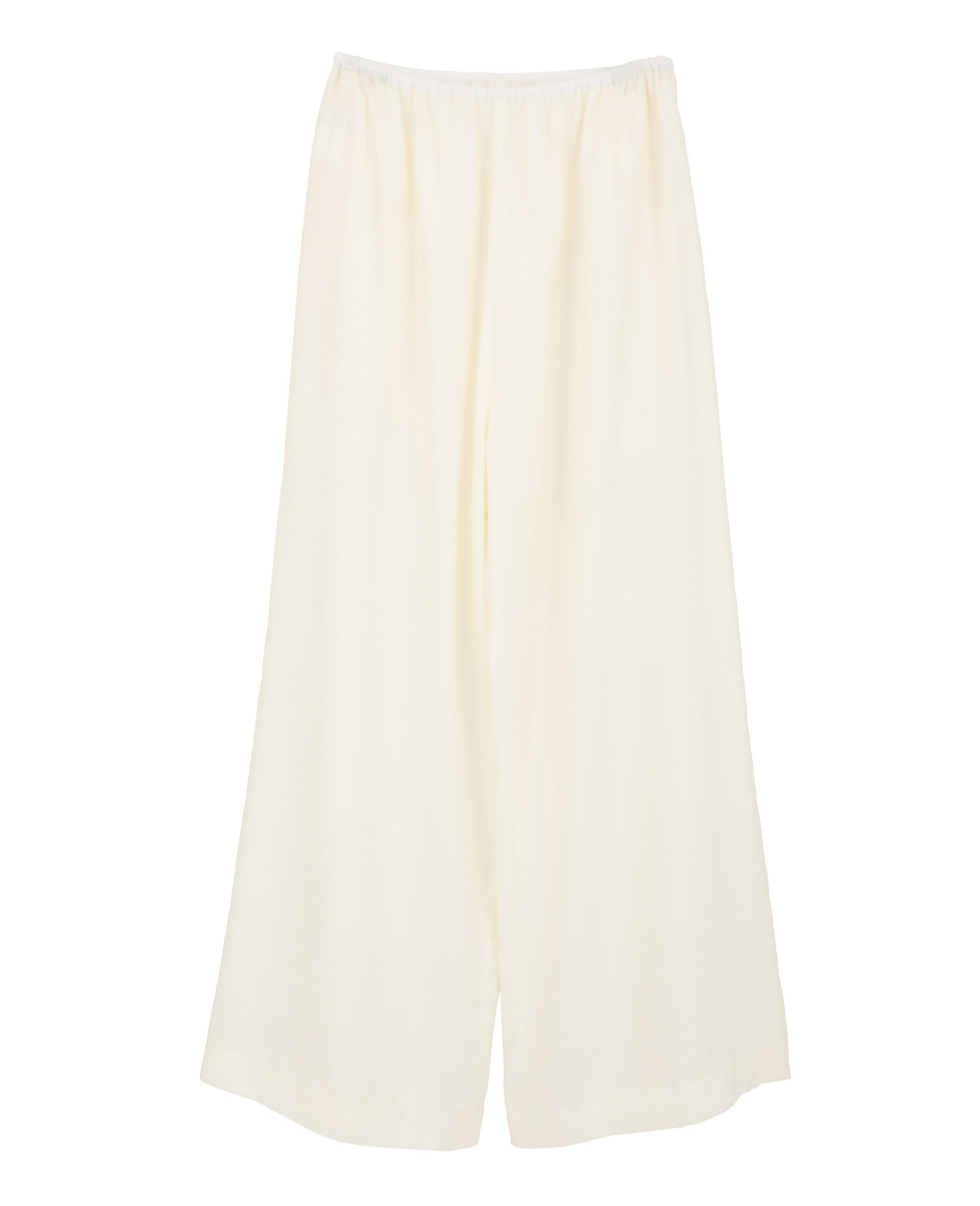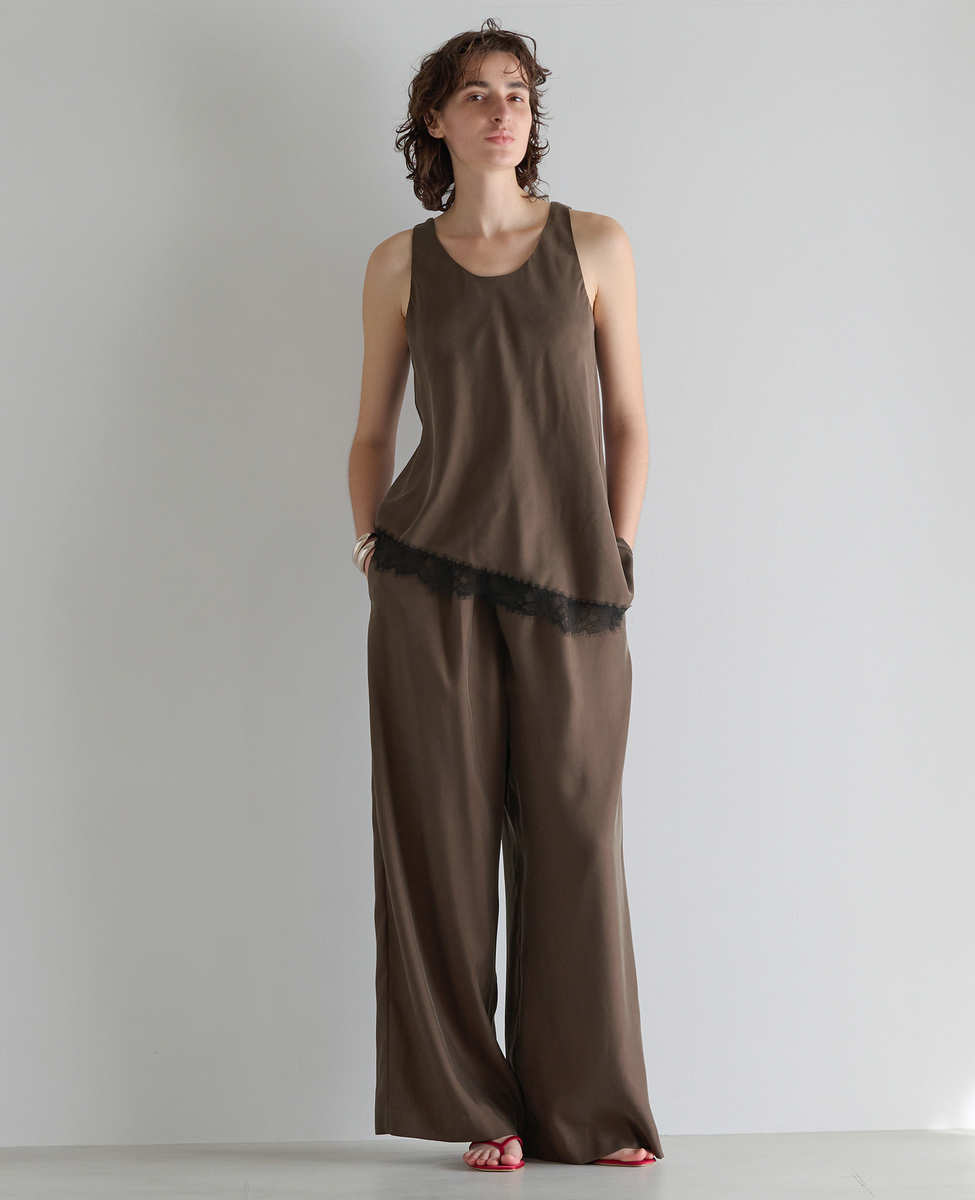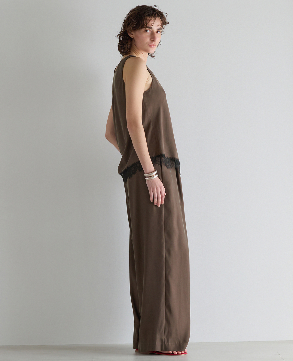 緩めのセミワイドシルエットパンツです。ウエストには華奢な共紐があしらわれているのがポイントです。