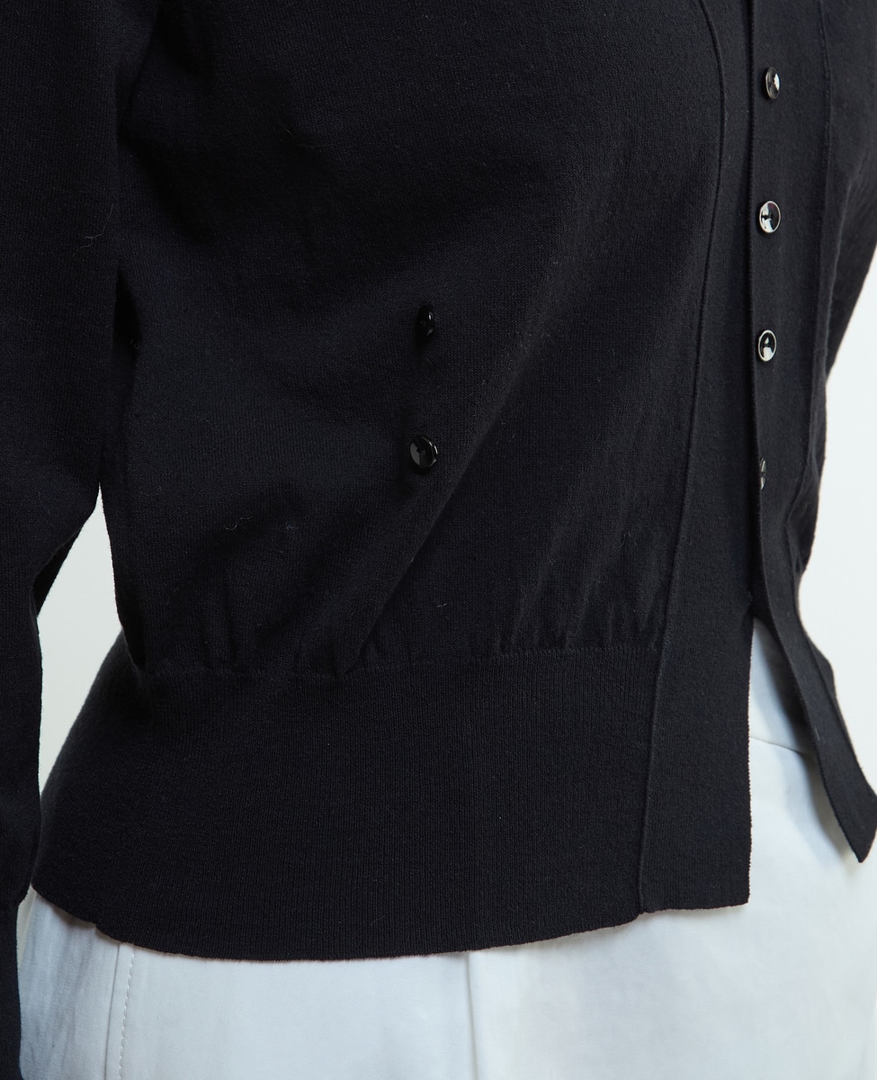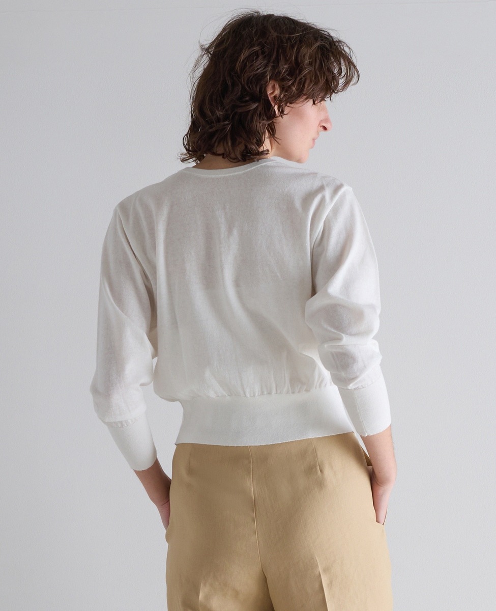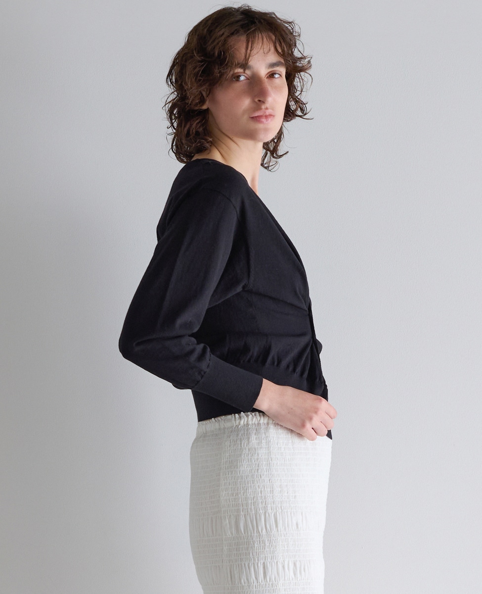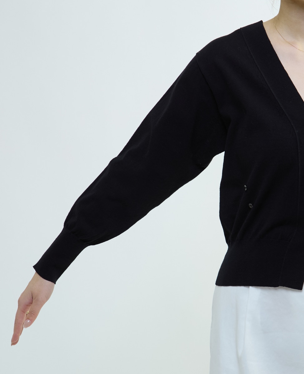 Vネックカーディガン、カシュクール、後ろVのクルーネックプルオーバーの3WAY。カシュクールにする際はボタンを使ってください。ボタンホールは編み利用のホールで、繊細な技ありになっています。