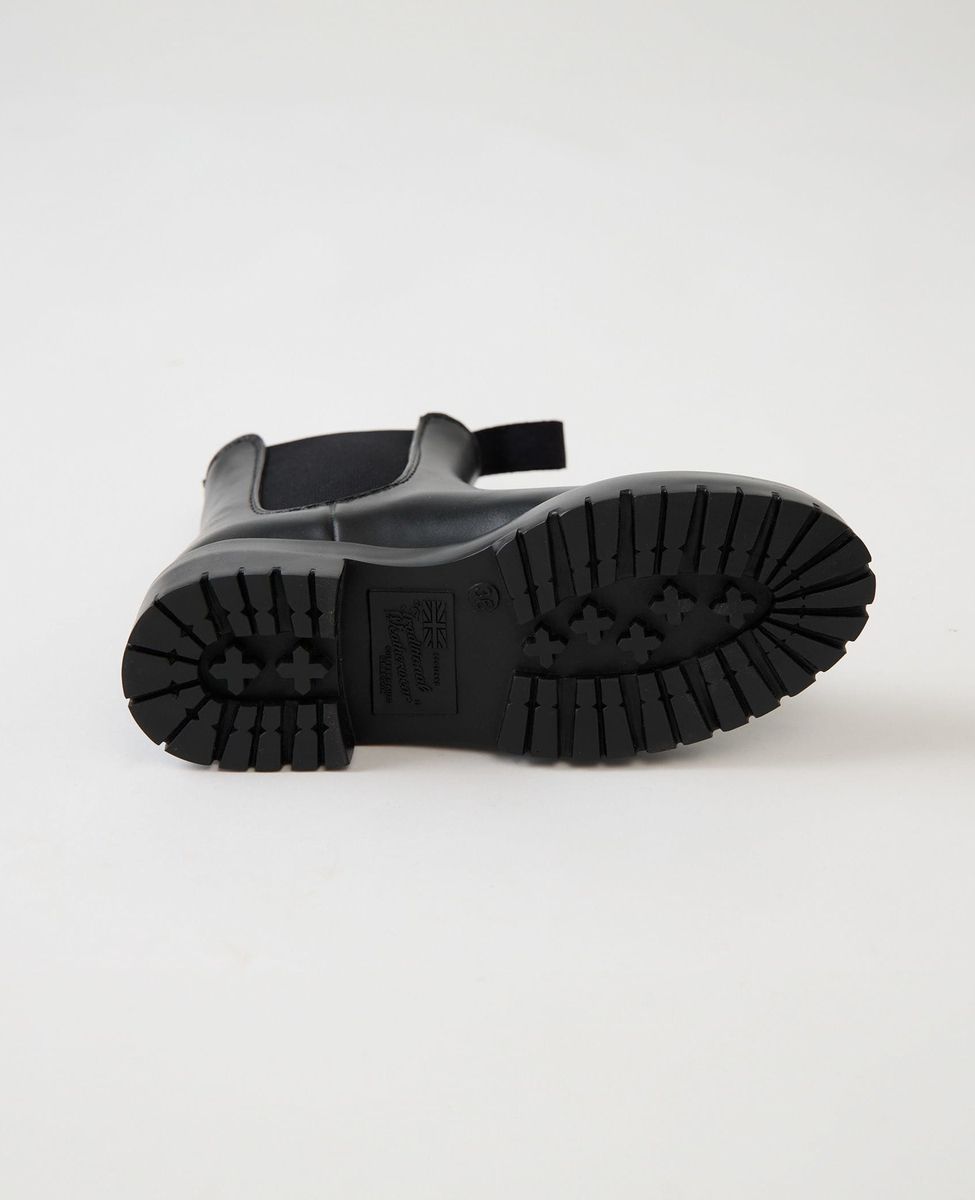 ブランドを代表するロングセラーのサイド ゴア レイン ブーツの女性らしい装いにも相性の良い厚底モデル。英国のオーセンティックなチェルシーブーツのデザインはそのままに、アッパーとソールを一体成形するスラッシュ製法を採用。アッパーとソールに継ぎ目がないため、防水性・耐久性に優れています。フルレザーのチェルシーブーツと見紛うようなこのモデルは、履き口からアッパーに至る美しい曲線と、すっきりとしたヒールカップが特長で、リュクスなドレス感のある装いから、カジュアルなデニムスタイルまで活躍する履く人を選ばない万能ブーツです。4.5cmのヒールとすっきりとしたミニマルな履き口が美しい脚線を叶えます。