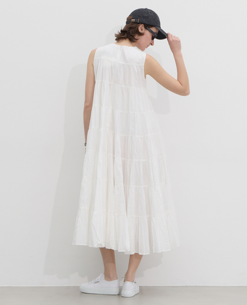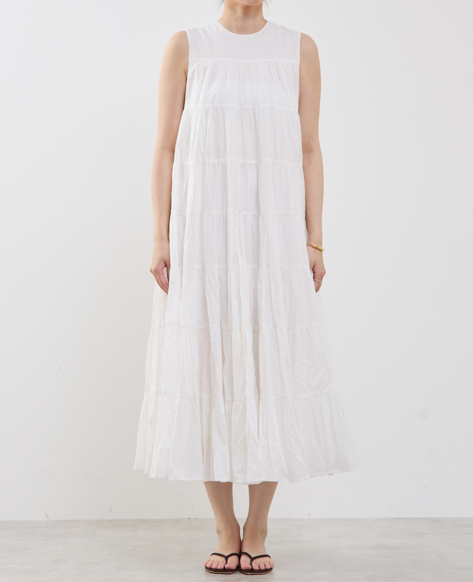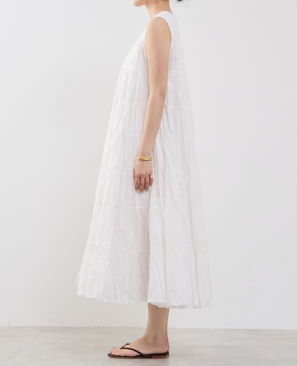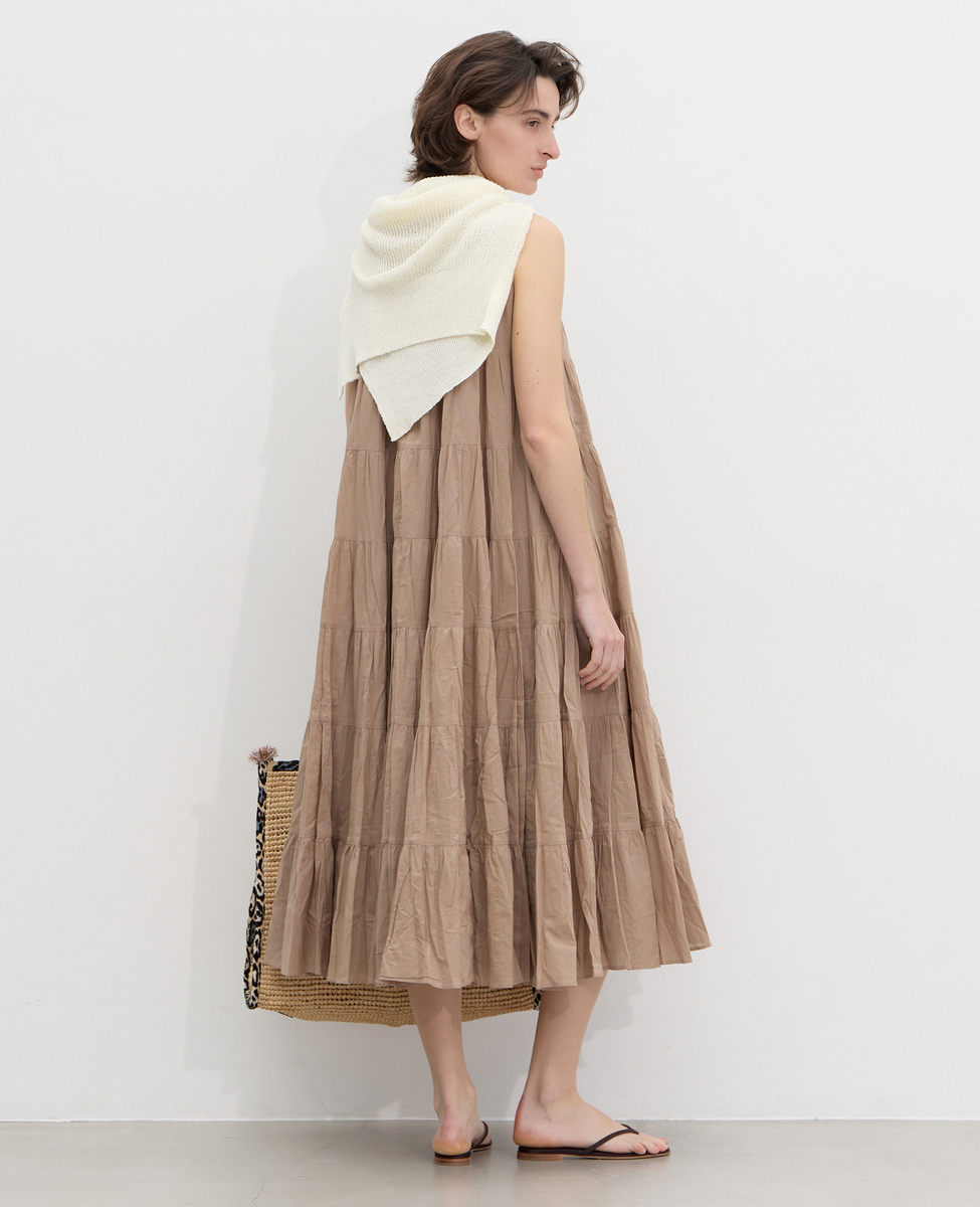 上品で華やかなロングドレス、「ミューズのドレス」。たっぷりとしたボリュームと広がるティアードは美しさと軽やかさをバランスよく兼ね備える様に細部まで計算されています。下着が見えない様に配慮されたノースリーブドレスは1枚でコーディネートが完成する、ワードローブに持っておきたい一枚。ジャケット等を合わせるとシーズンレスで来ていただけます。どんな身長の方もバランスよく着ていただける120㎝レングスに別注しました。