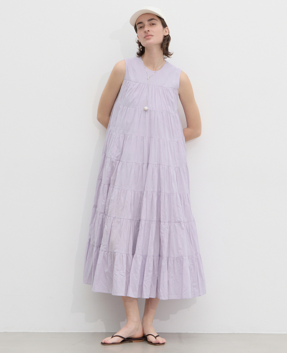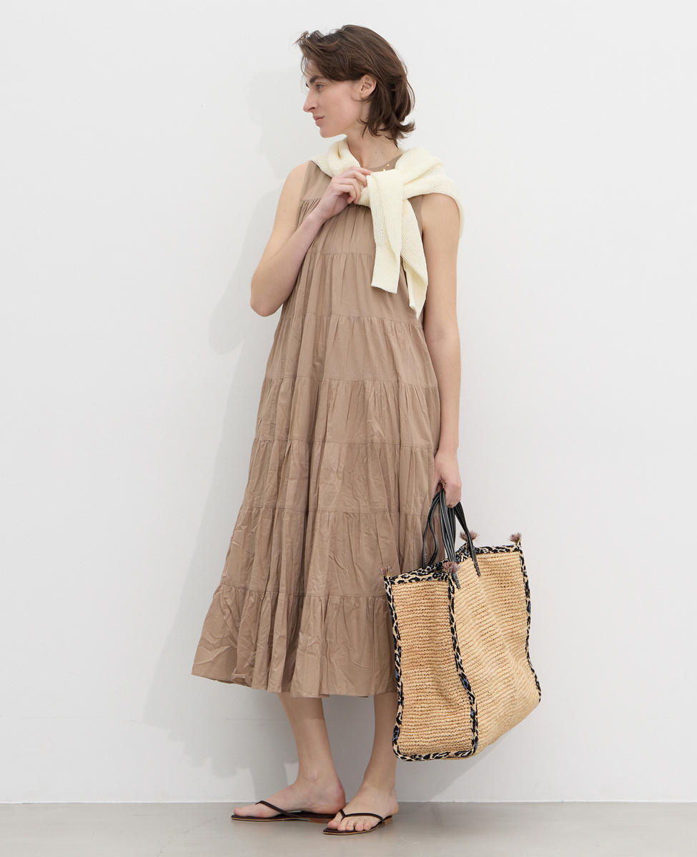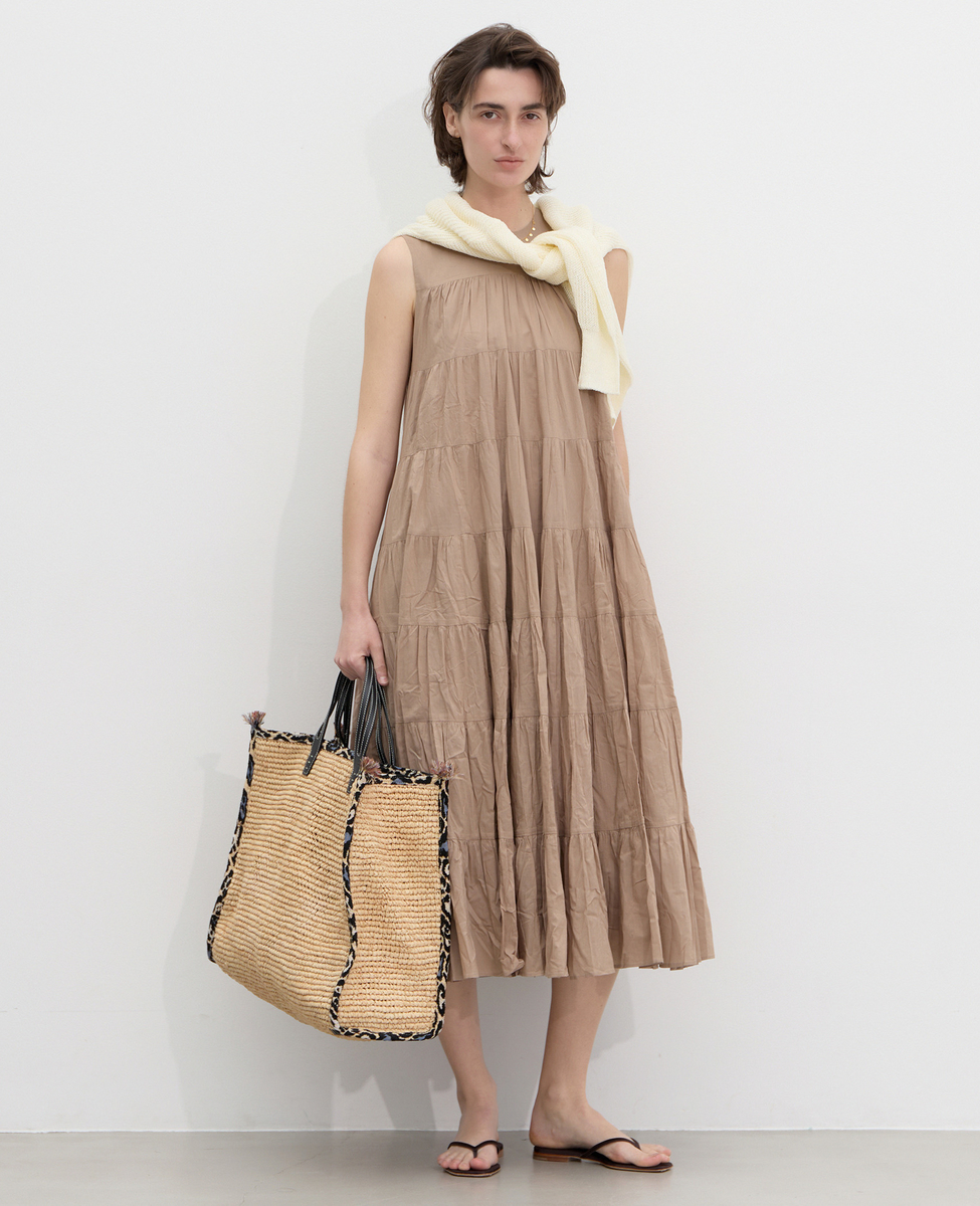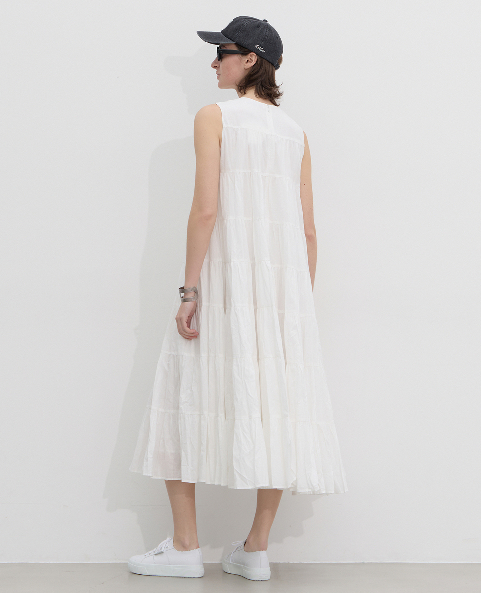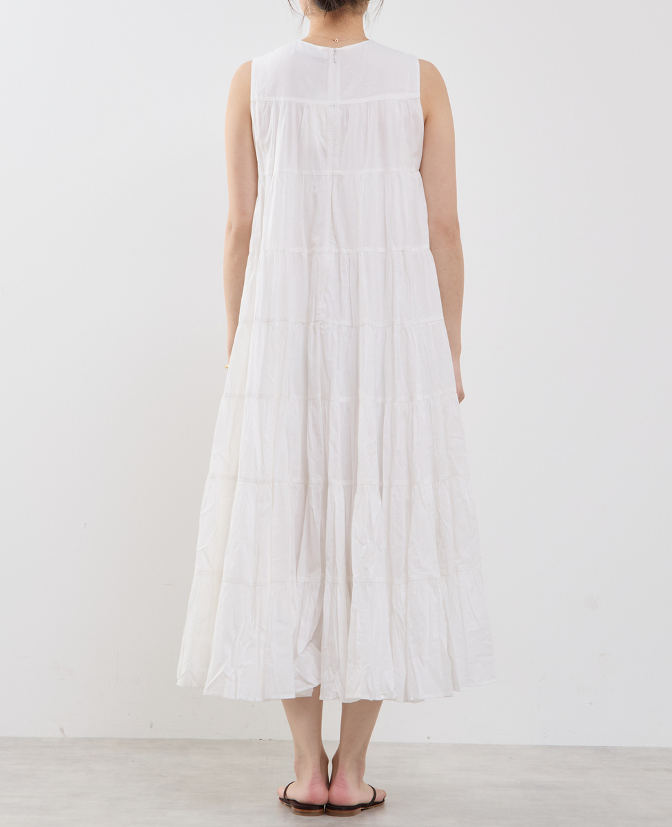 上品で華やかなロングドレス、「ミューズのドレス」。たっぷりとしたボリュームと広がるティアードは美しさと軽やかさをバランスよく兼ね備える様に細部まで計算されています。下着が見えない様に配慮されたノースリーブドレスは1枚でコーディネートが完成する、ワードローブに持っておきたい一枚。ジャケット等を合わせるとシーズンレスで来ていただけます。どんな身長の方もバランスよく着ていただける120㎝レングスに別注しました。