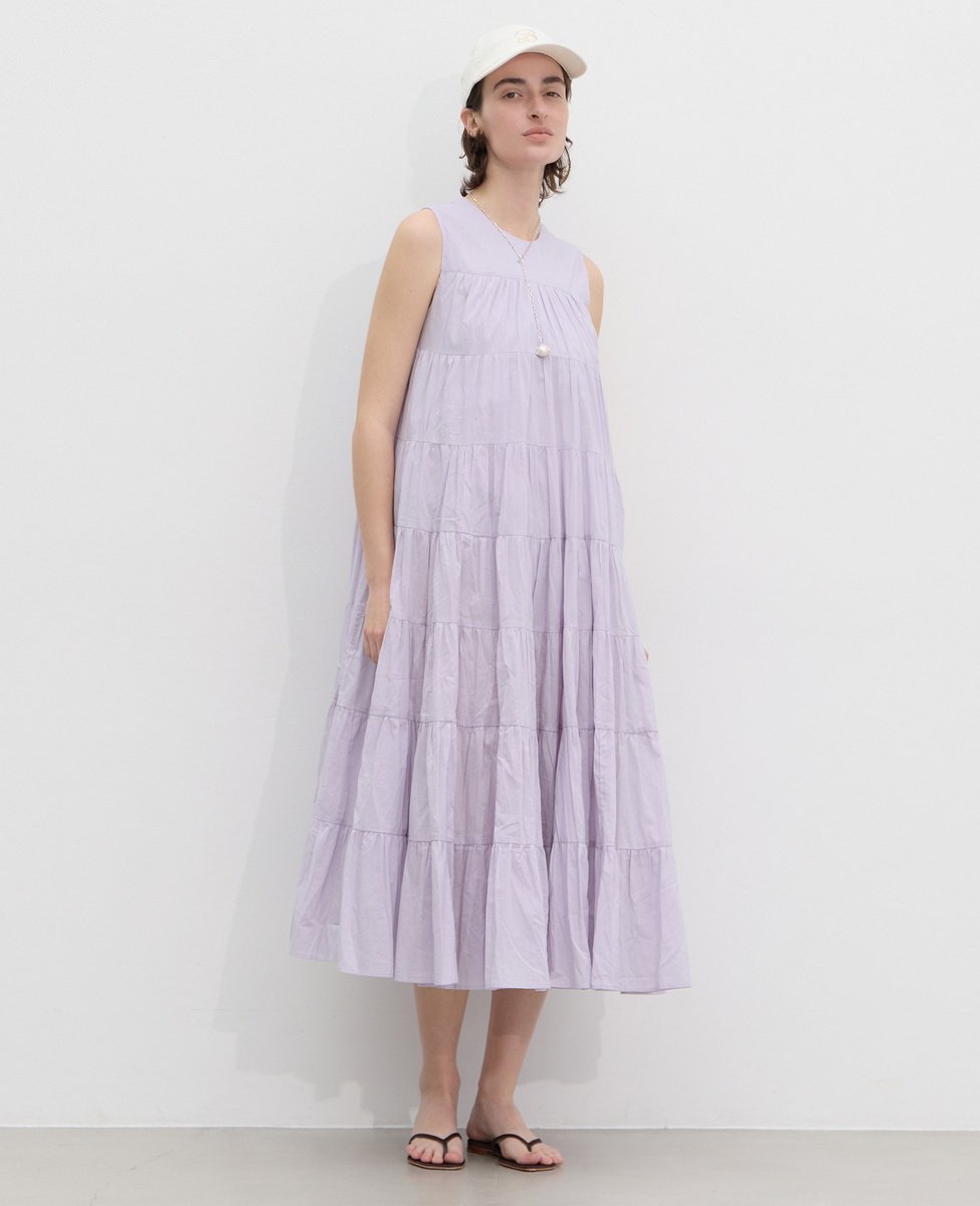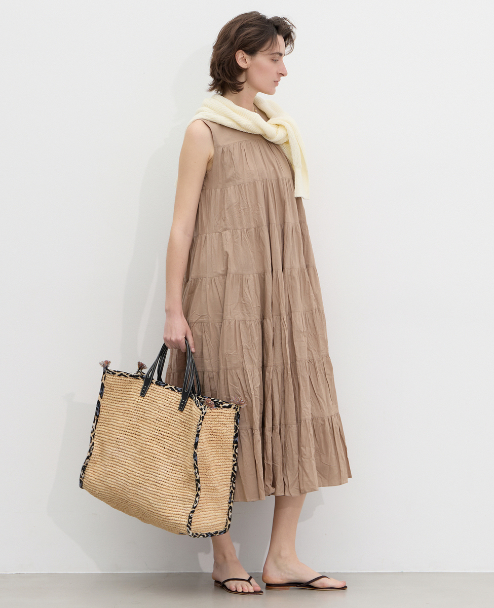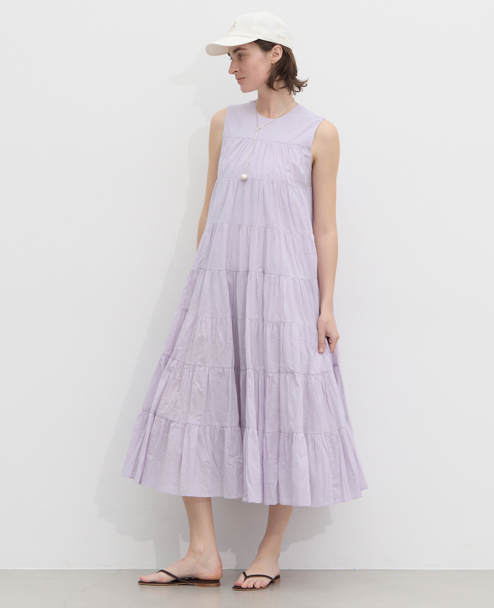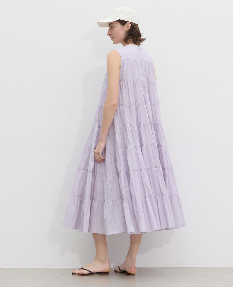 上品で華やかなロングドレス、「ミューズのドレス」。たっぷりとしたボリュームと広がるティアードは美しさと軽やかさをバランスよく兼ね備える様に細部まで計算されています。下着が見えない様に配慮されたノースリーブドレスは1枚でコーディネートが完成する、ワードローブに持っておきたい一枚。ジャケット等を合わせるとシーズンレスで来ていただけます。どんな身長の方もバランスよく着ていただける120㎝レングスに別注しました。