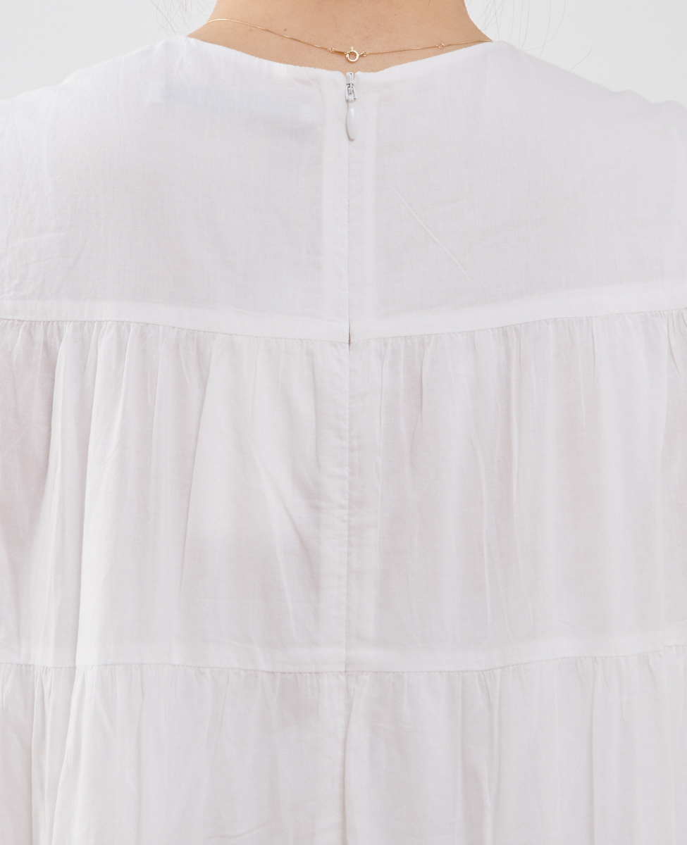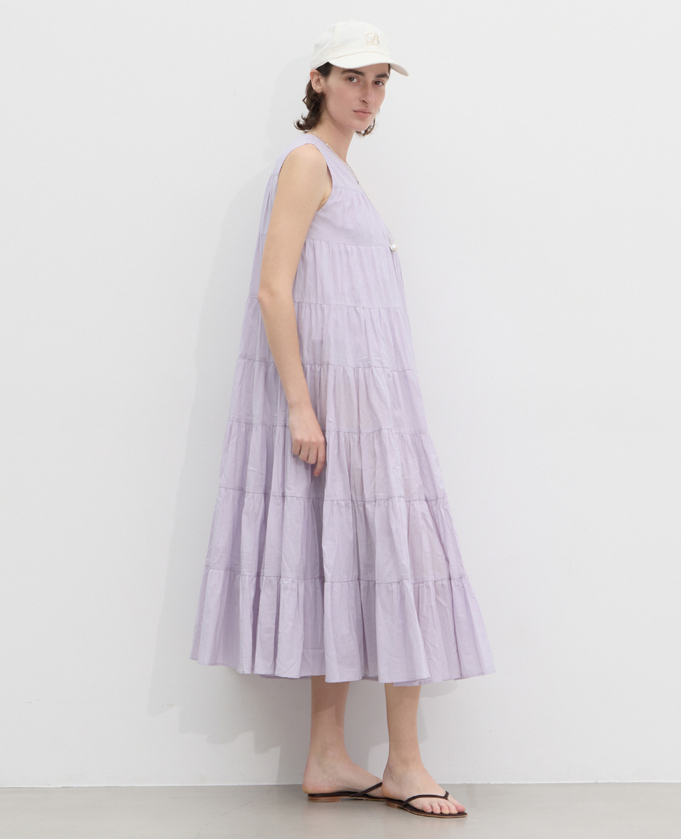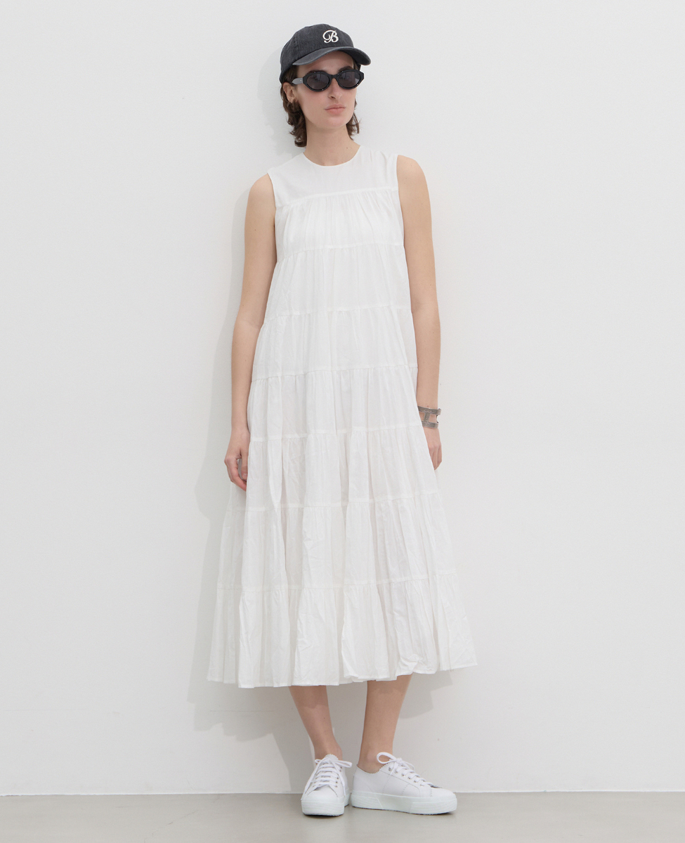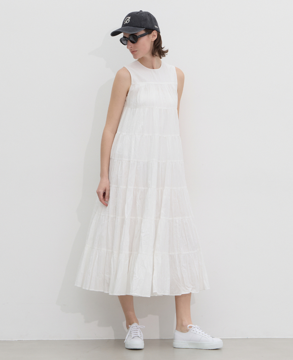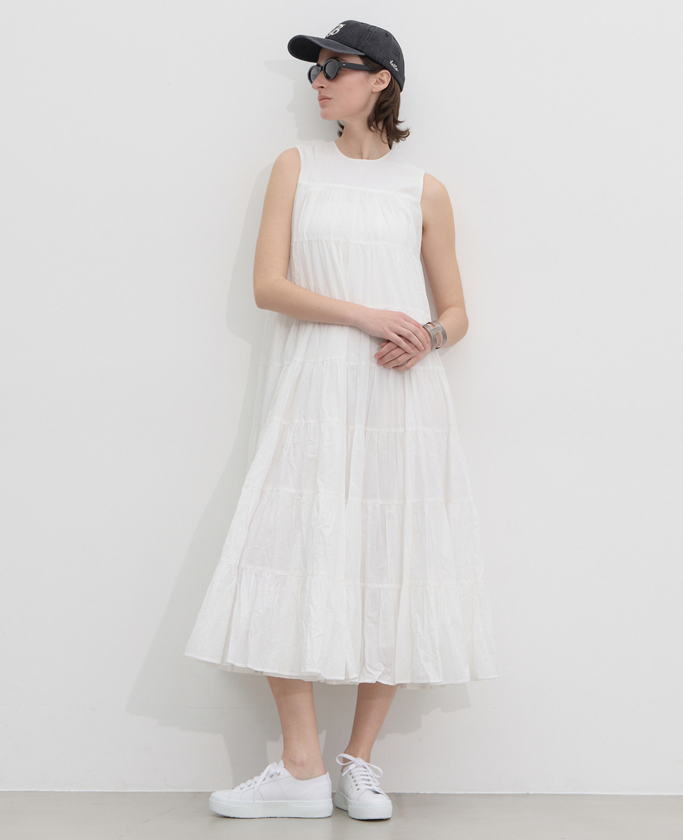 上品で華やかなロングドレス、「ミューズのドレス」。たっぷりとしたボリュームと広がるティアードは美しさと軽やかさをバランスよく兼ね備える様に細部まで計算されています。下着が見えない様に配慮されたノースリーブドレスは1枚でコーディネートが完成する、ワードローブに持っておきたい一枚。ジャケット等を合わせるとシーズンレスで来ていただけます。どんな身長の方もバランスよく着ていただける120㎝レングスに別注しました。