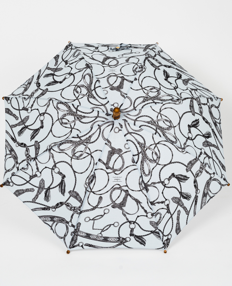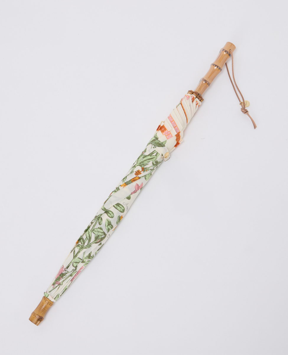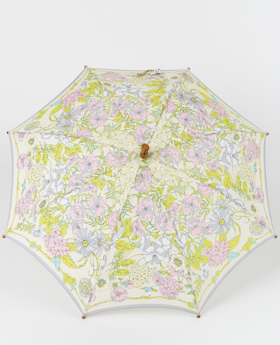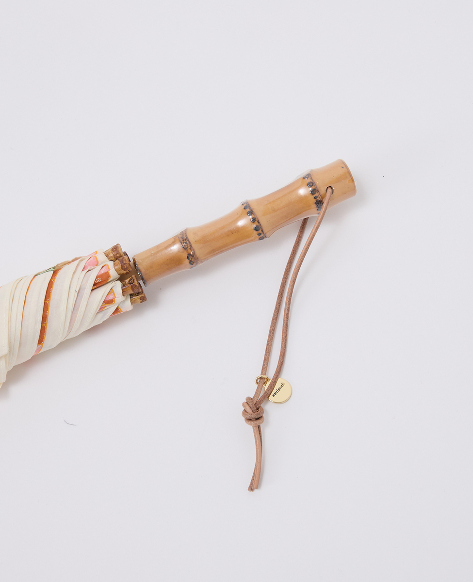 一本木のステッキ中棒傘で、ハンドルと石突にはバンブーを使用している上品なデザイン性のある日傘です。小雨であれば雨傘としても使用可能です。遮蔽率は92%~98%で、スカーフのプリント加工と同様、手捺染でプリントされた綿100%の生地に撥水・防水・UV加工を施している美しい逸品です。ナチュラルで優しい発色で夏には浴衣に合わせるのもおすすめです。