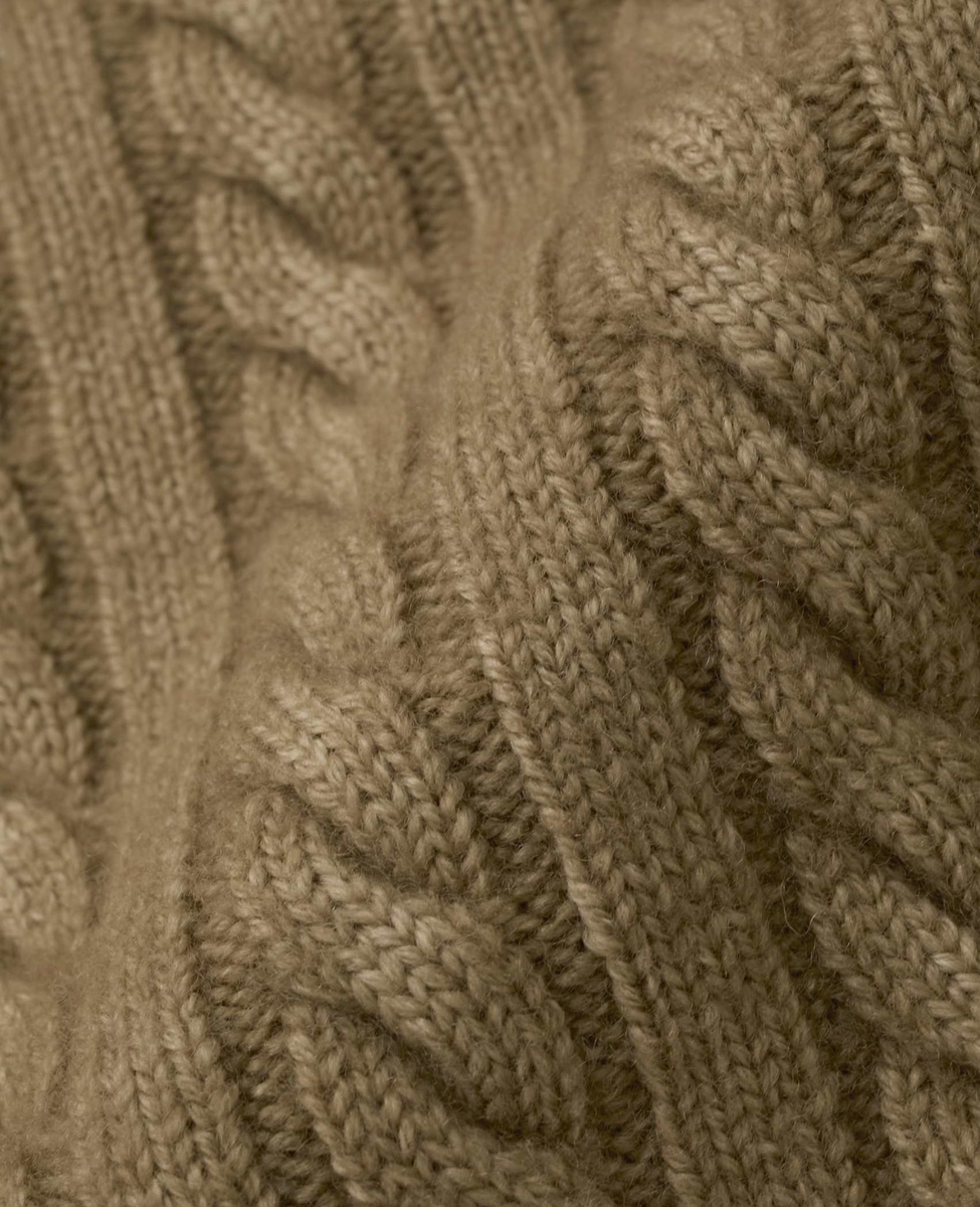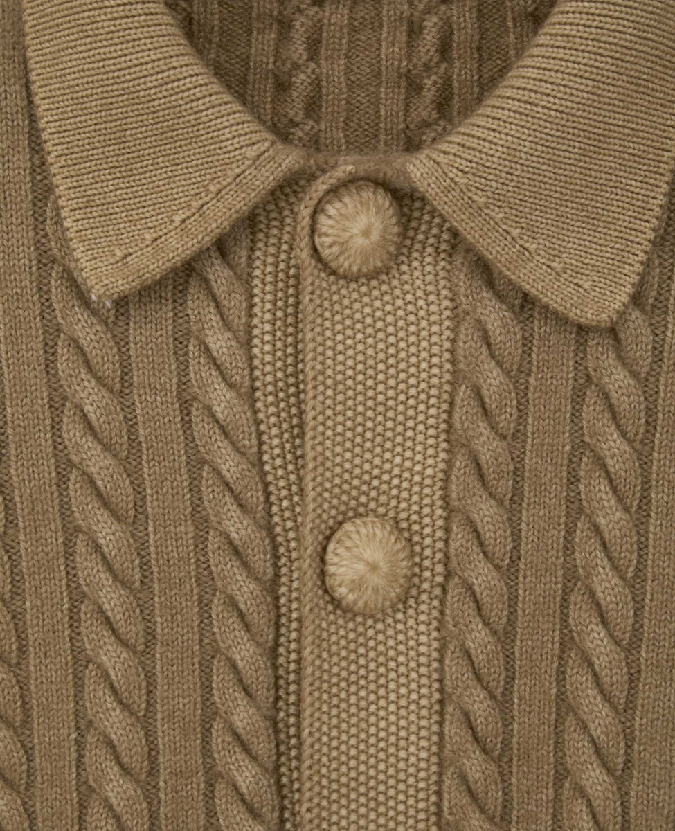 ケーブルニットを特殊な染め方で製品染めしたシリーズ。マットに染まり切らない凹凸感のある表情が独特。また染める際に縮絨されることで目の詰まった風合いに仕上げています。着丈の極端に短い襟つきのカーディガン。ボタン部分はかぎ針編みで1点1点ハンドメイドされたボタンをつけています。