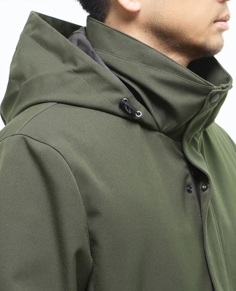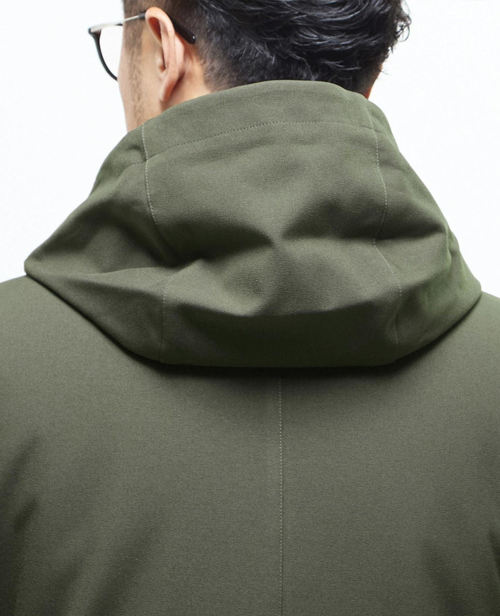 衿に収納されたフードを出すと、また違った雰囲気でスタイリングが可能です。