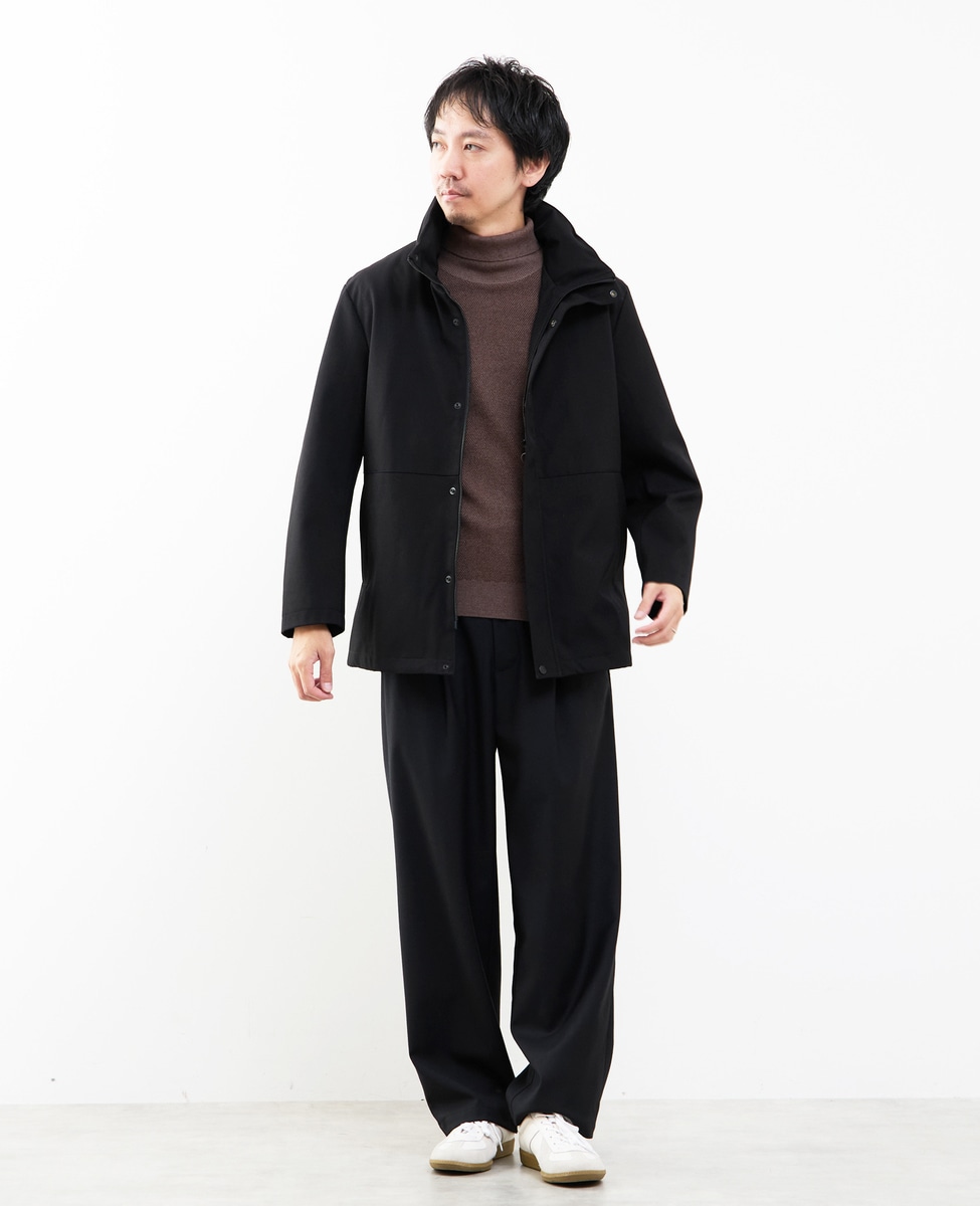 上品な表面感のウーリーなツイル素材をベースに、裏側にボンディング加工を施しました。