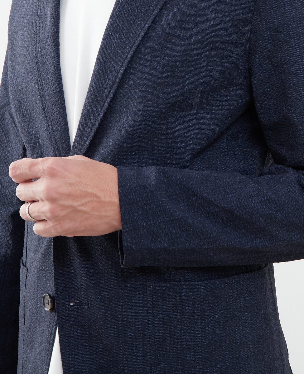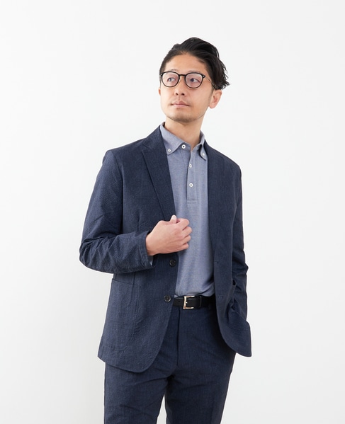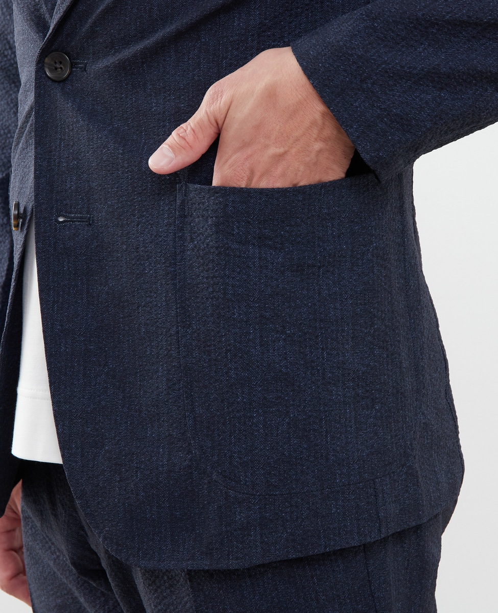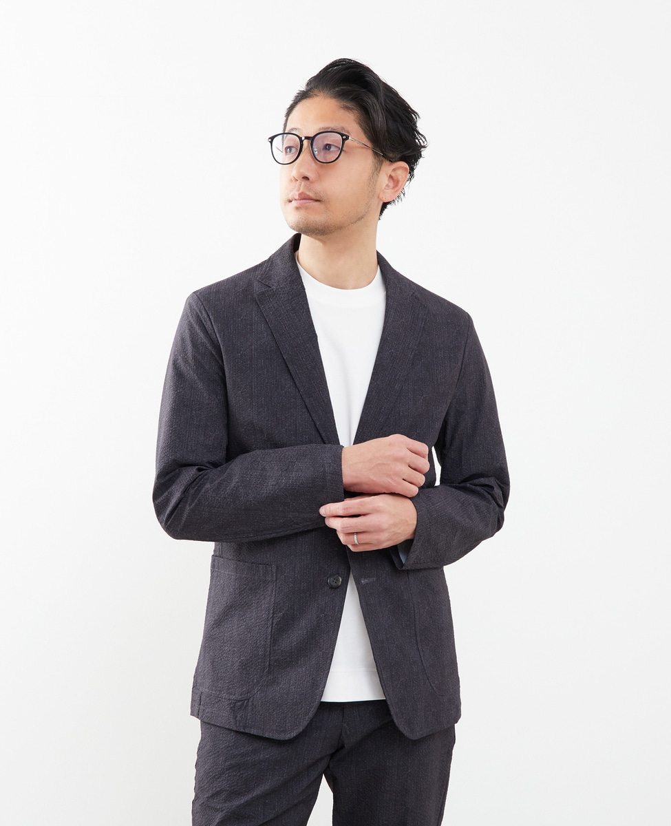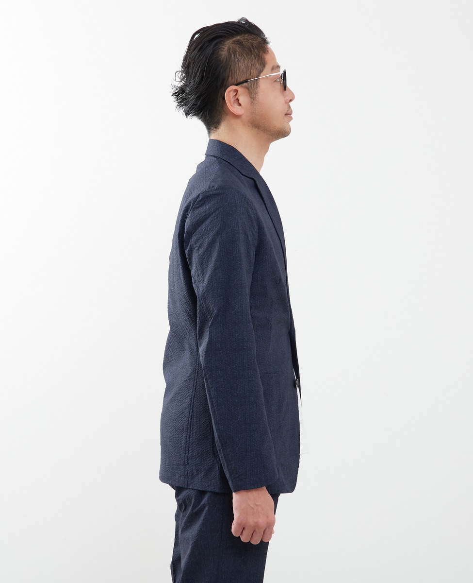 ウール調マテリアルプリントを施した清涼感抜群なサッカー素材は、カジュアル過ぎない見た目の上品な雰囲気が加わり、シンプルなカットジャケットも良い塩梅にキマってくれるという副産物をもたらせてくれます。