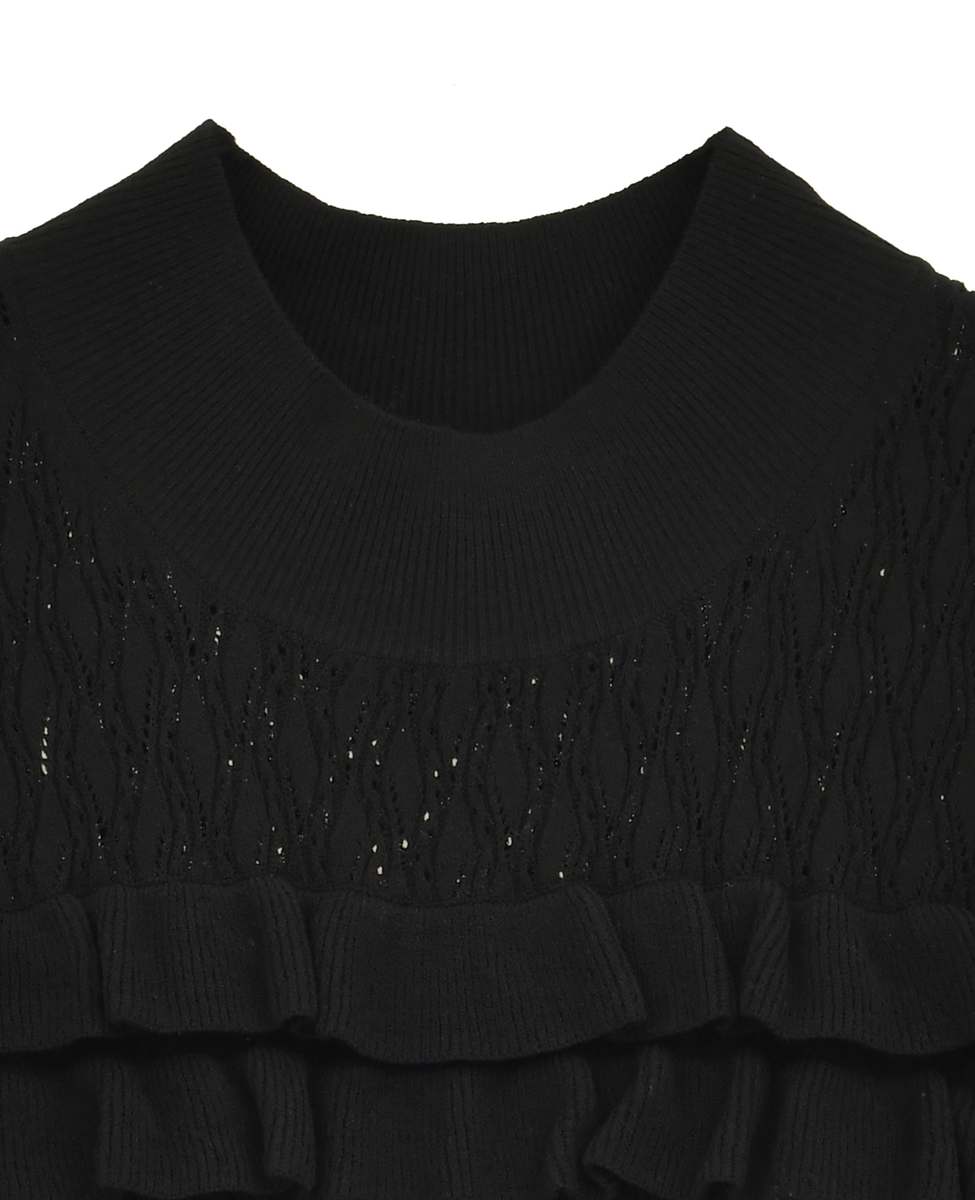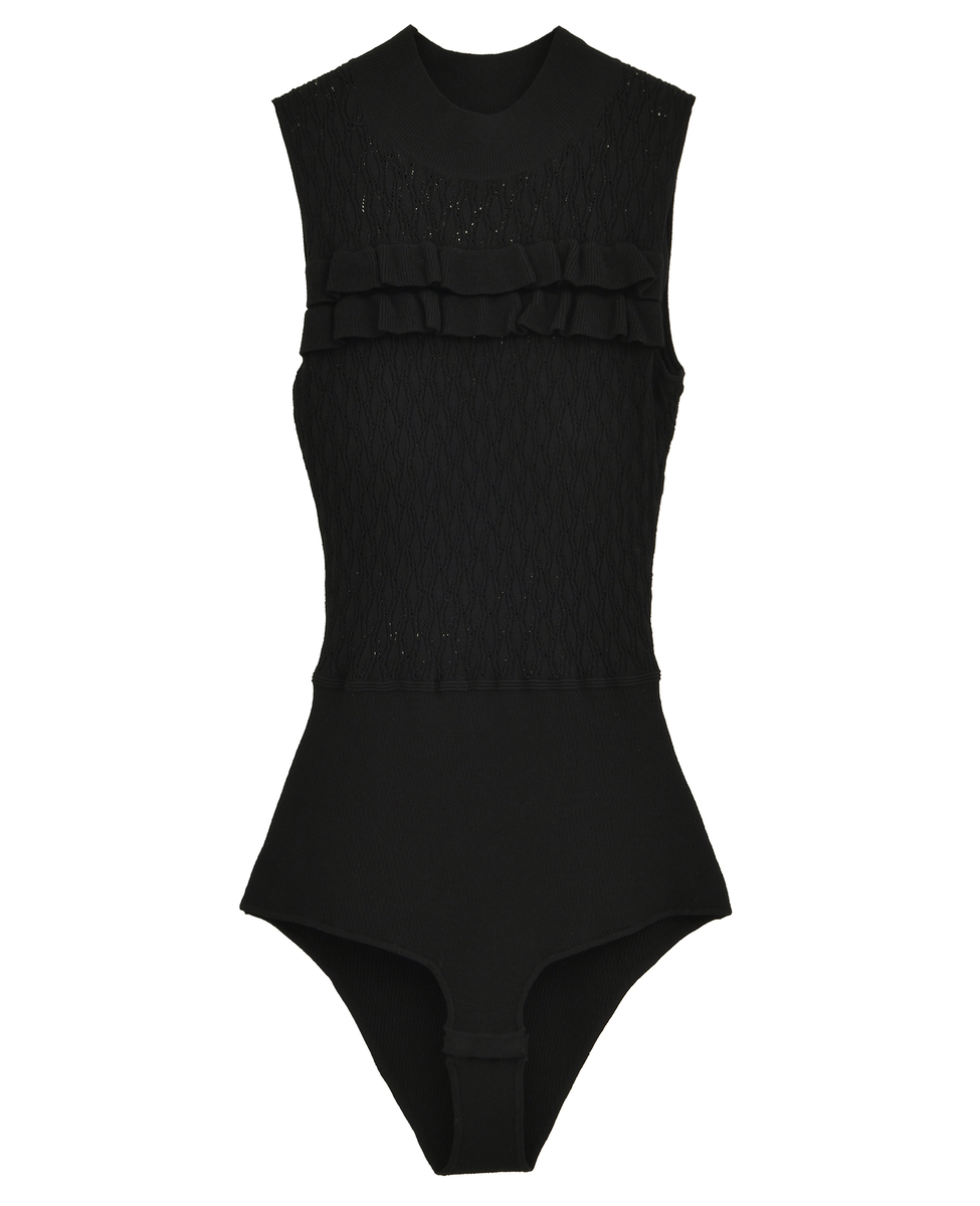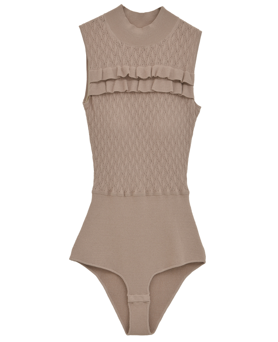 繊細なダイヤ柄ニットと胸元のフリルディテールが女性らしさを引き立てる、エレガントなニットボディスーツ。