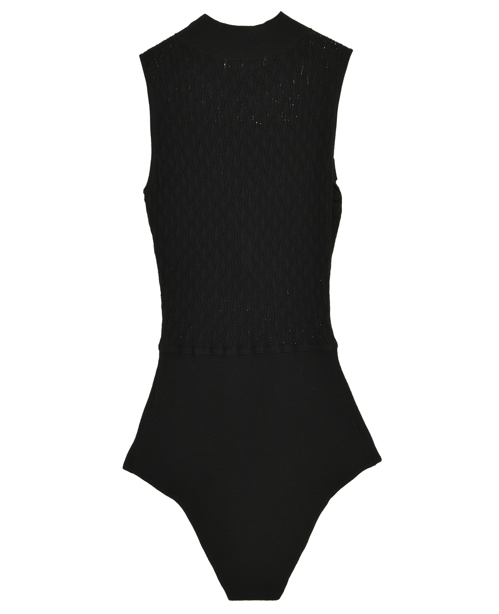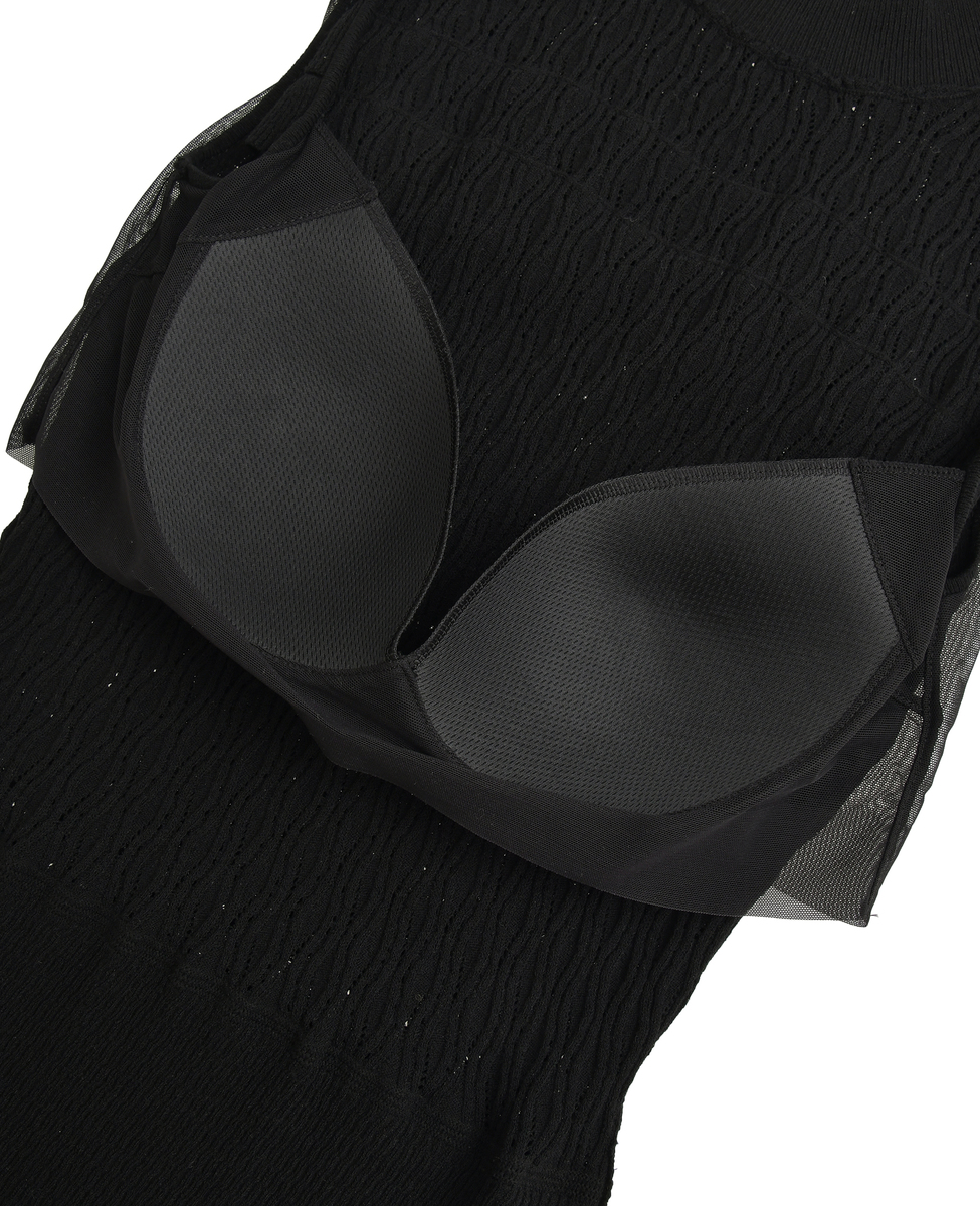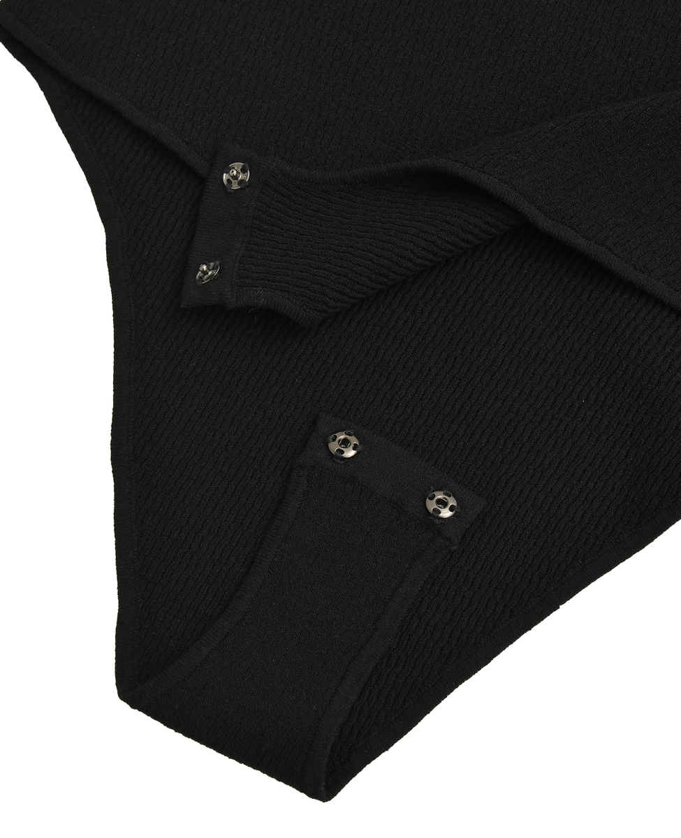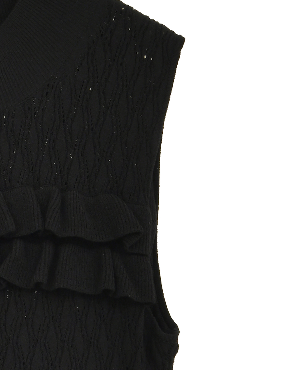 繊細なダイヤ柄ニットと胸元のフリルディテールが女性らしさを引き立てる、エレガントなニットボディスーツ。