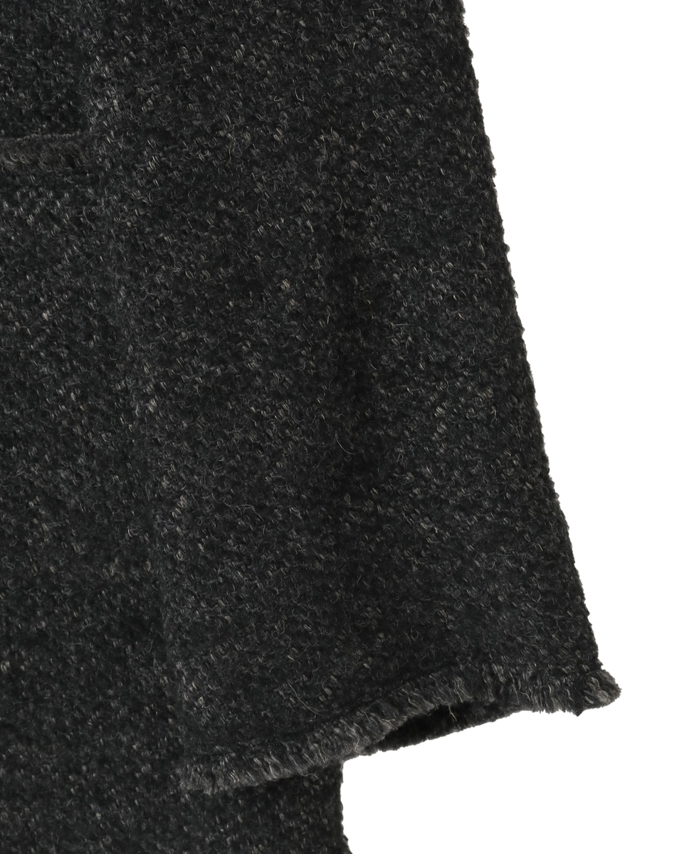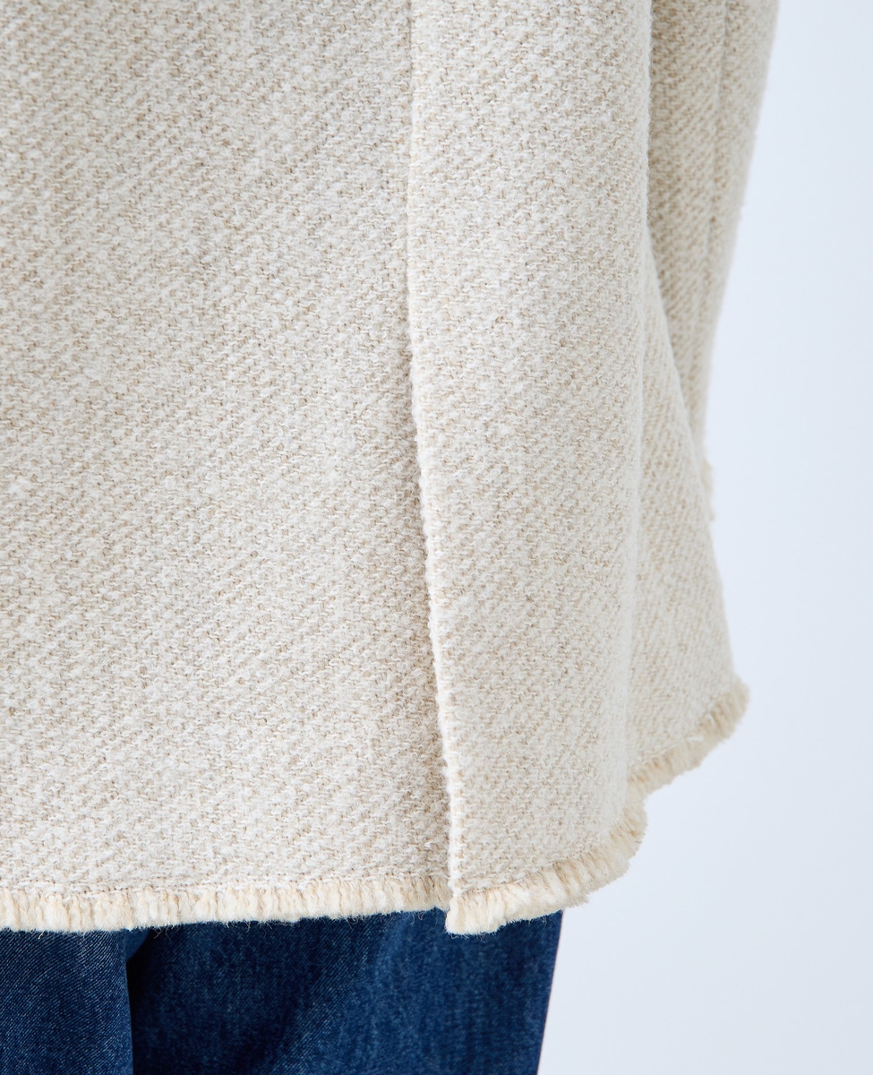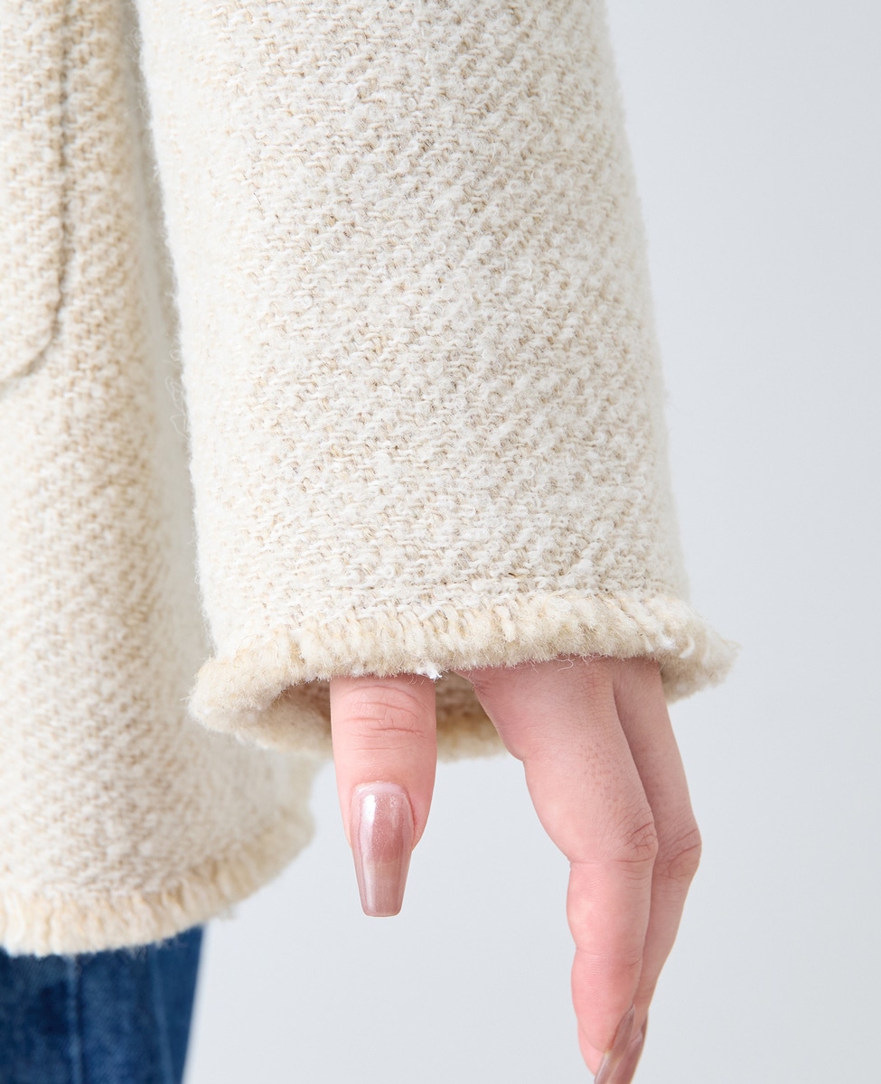 ファンシーヤーンの特徴を生かして、端をフリンジ仕様にしています。大人っぽいデザインですが、カジュアルなスタイリングがお勧めです。
