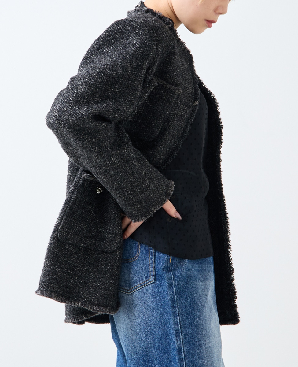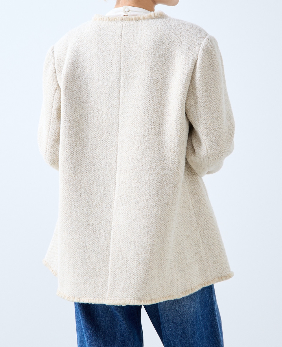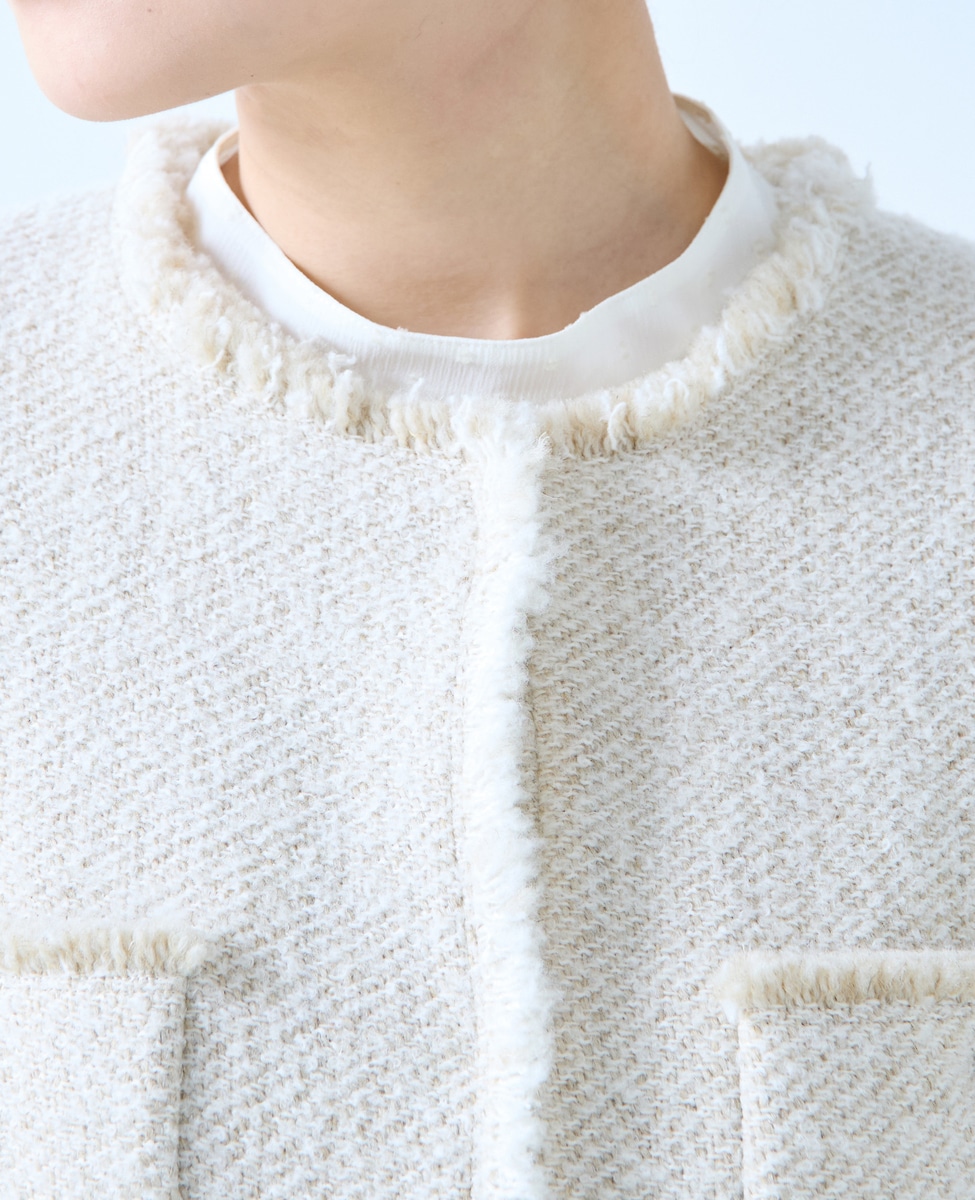 ファンシーヤーンの特徴を生かして、端をフリンジ仕様にしています。大人っぽいデザインですが、カジュアルなスタイリングがお勧めです。