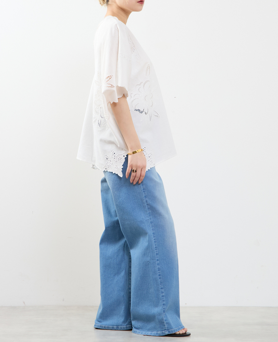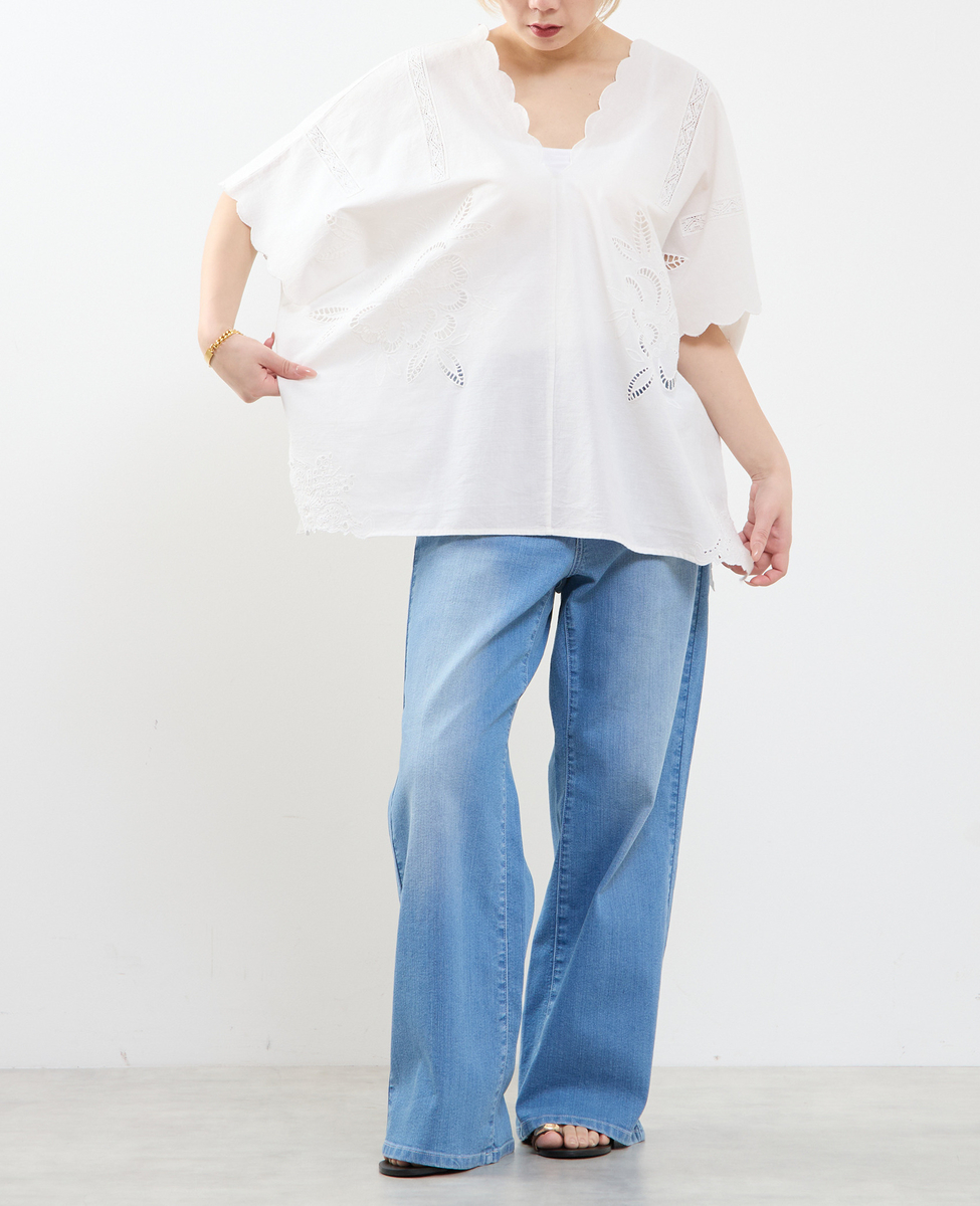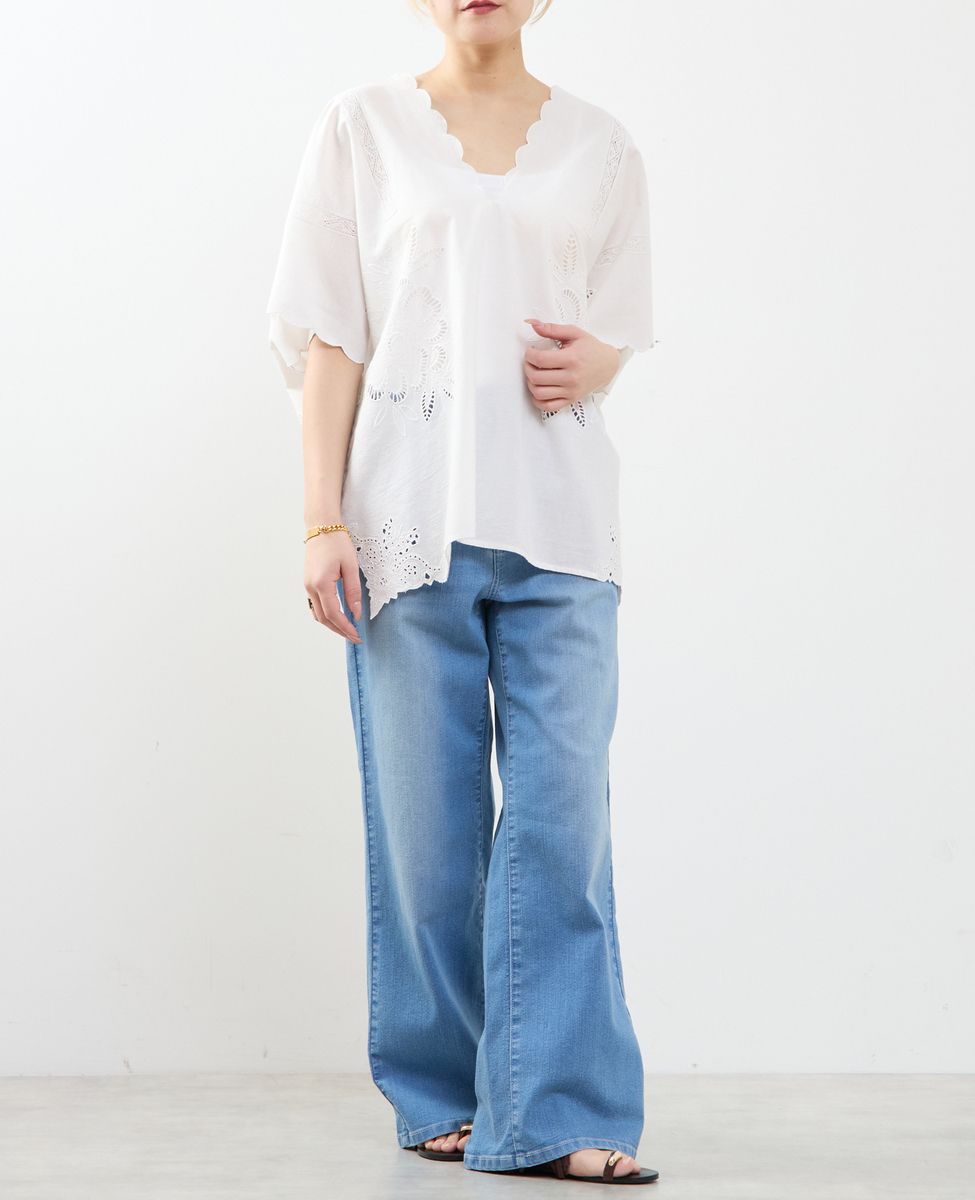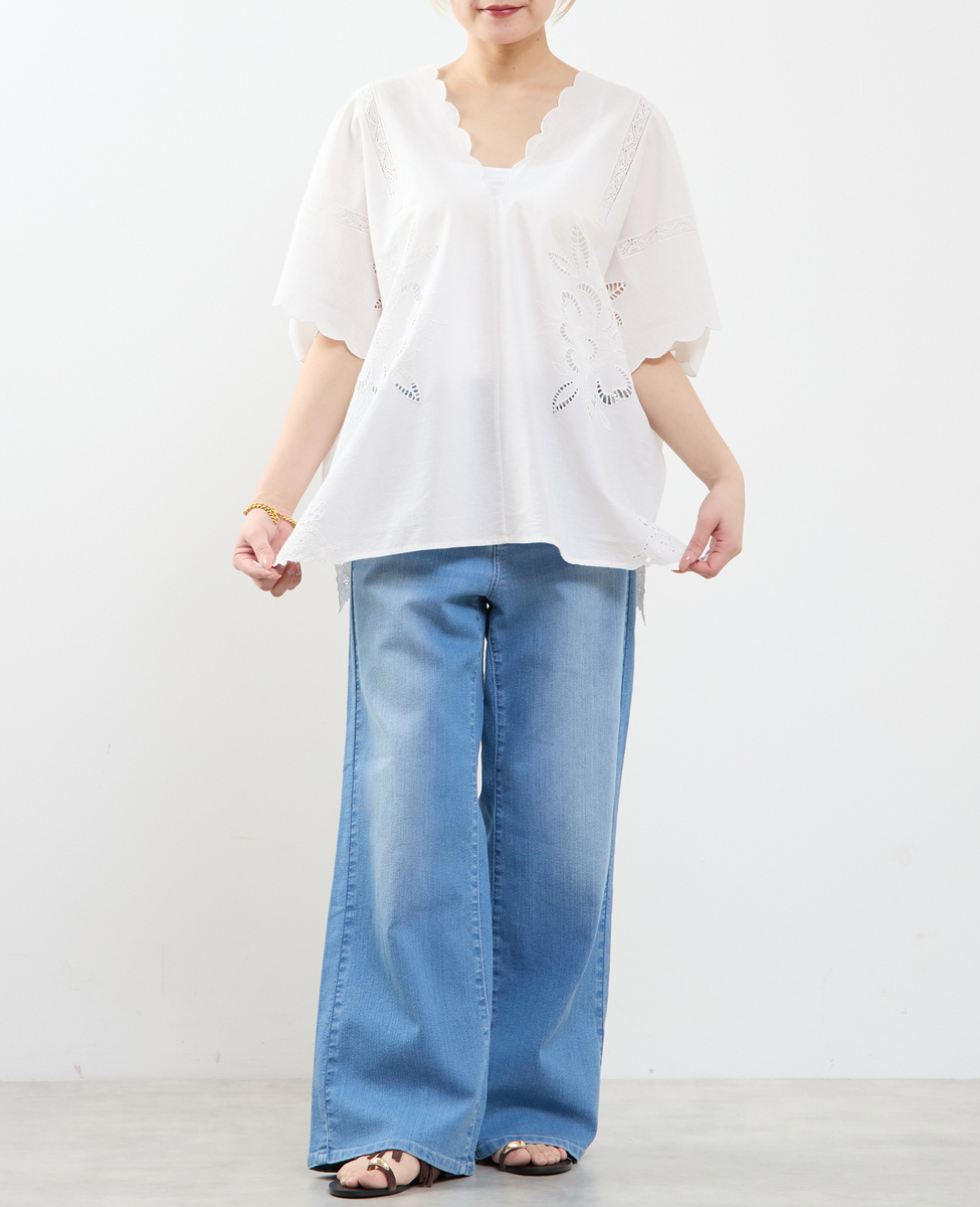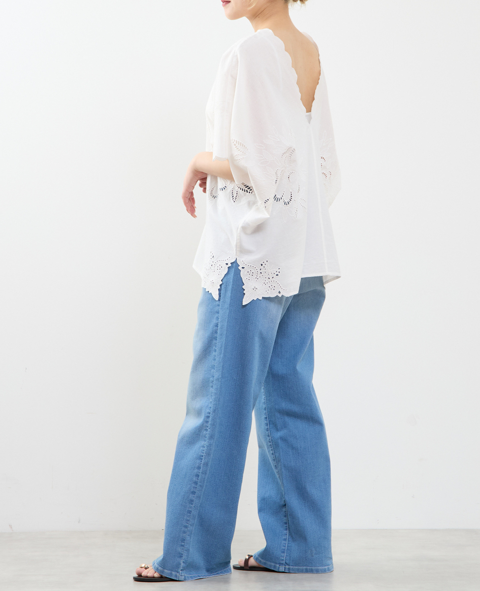 ヒップを覆うゆったりシルエットで、体型を美しくカバーしつつ、リラックス感のある着心地。左右対称に施したカットワーク刺繍が、控えめながら上品な華やかさを添え、一枚で着映えするデザインに仕上げました。