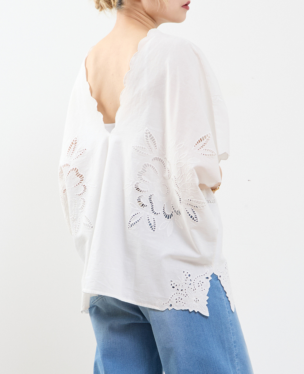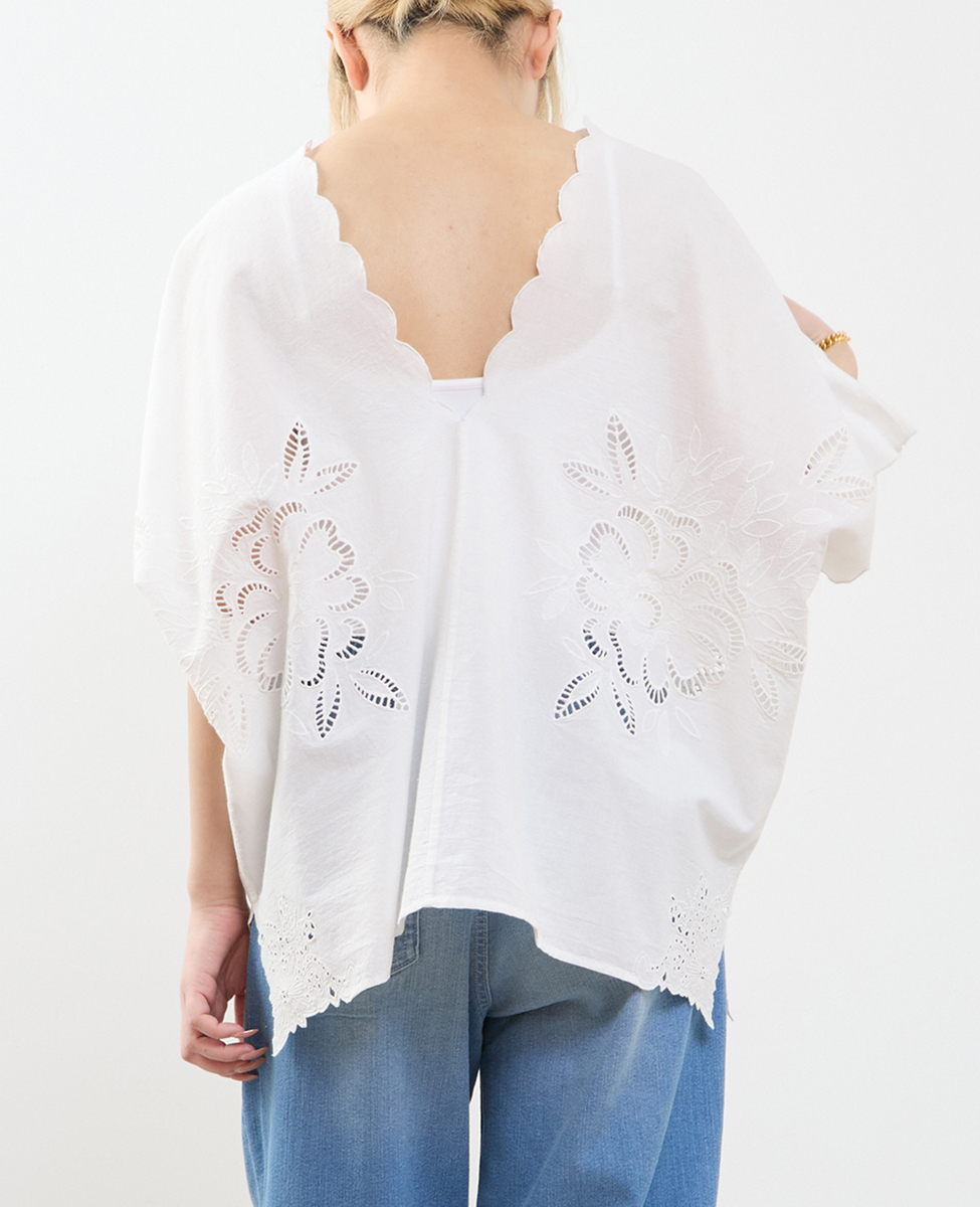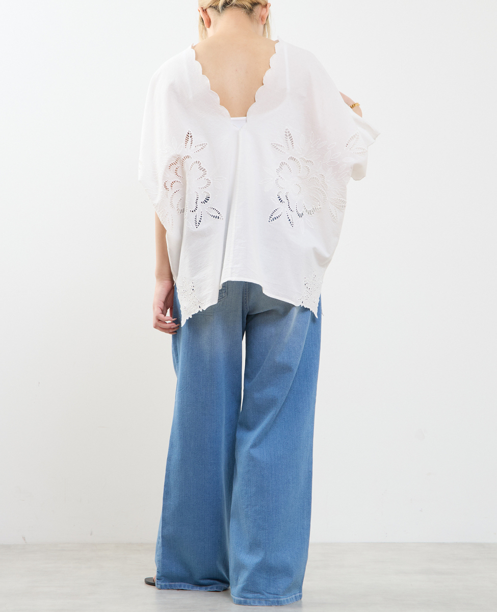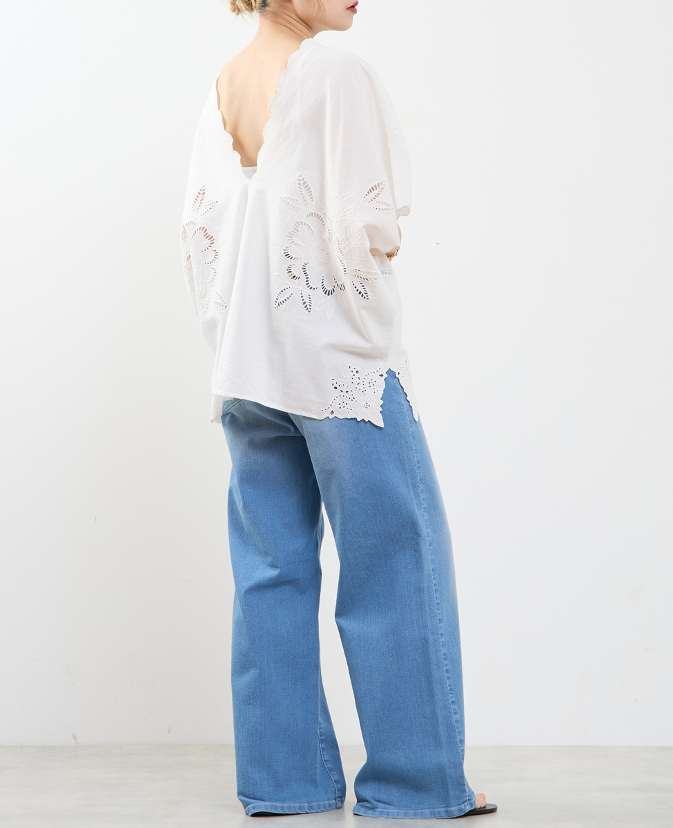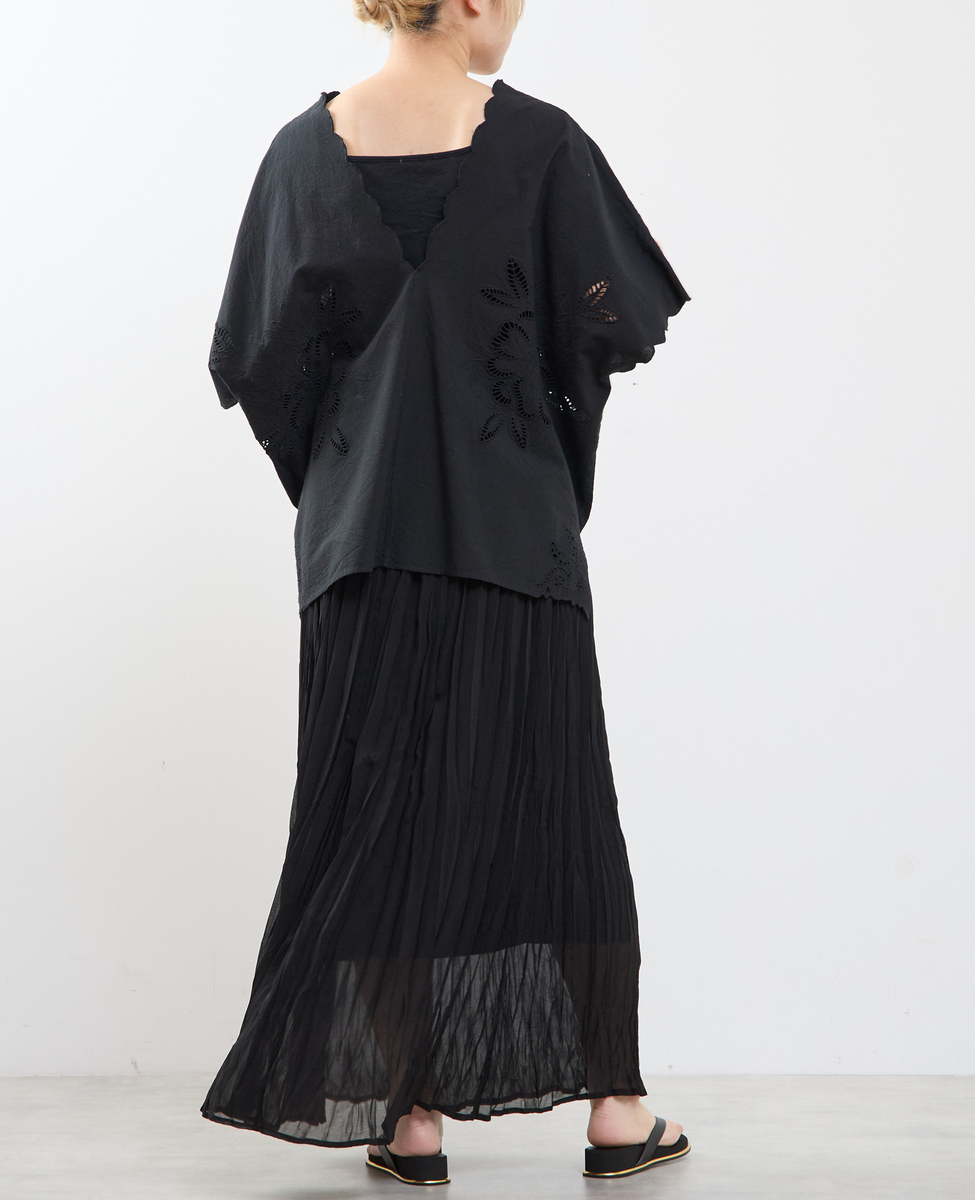 ヒップを覆うゆったりシルエットで、体型を美しくカバーしつつ、リラックス感のある着心地。左右対称に施したカットワーク刺繍が、控えめながら上品な華やかさを添え、一枚で着映えするデザインに仕上げました。