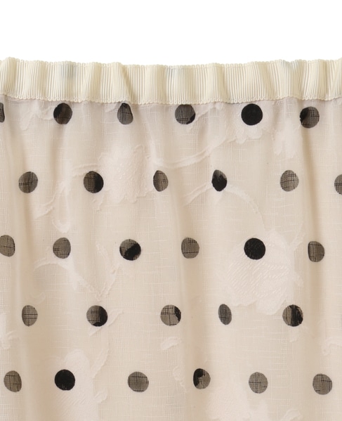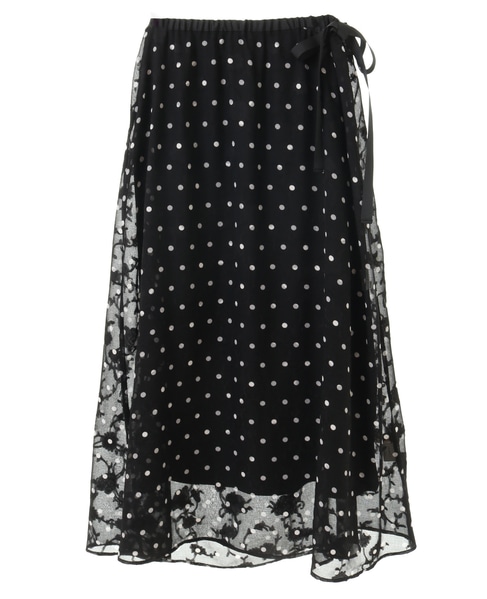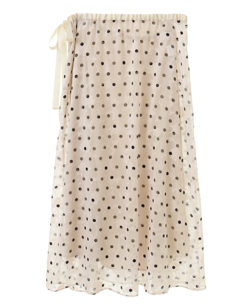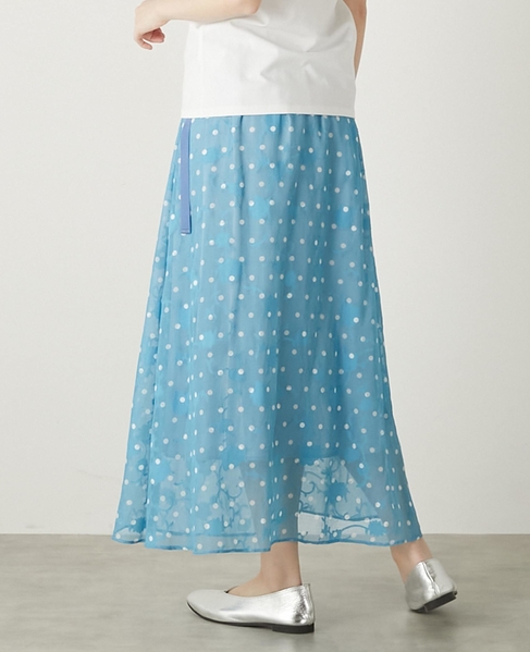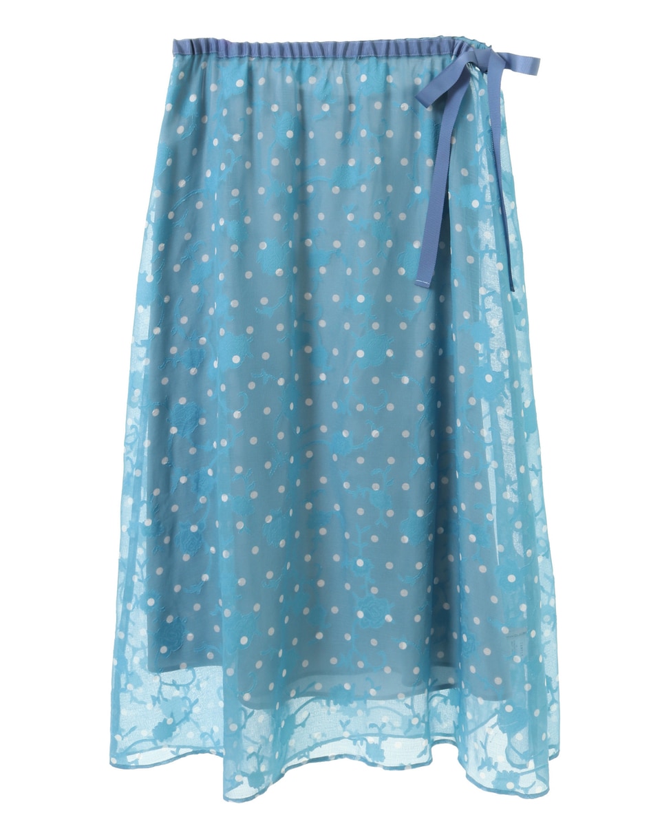 ボタニカル柄のカットジャガード素材にドットプリントを乗せたインパクトのある素材で作ったスカート。上品な透け感と落ち感が大人っぽく、一気に季節感を更新してくれます。透け感を活かしてペチスカートなしでパンツとレイヤードしたラップ風の着こなしや、同素材のブラウスと合わせたセットアップコーデもおすすめです。ウエストゴムから延長したグログランリボンを結んで着用します。
