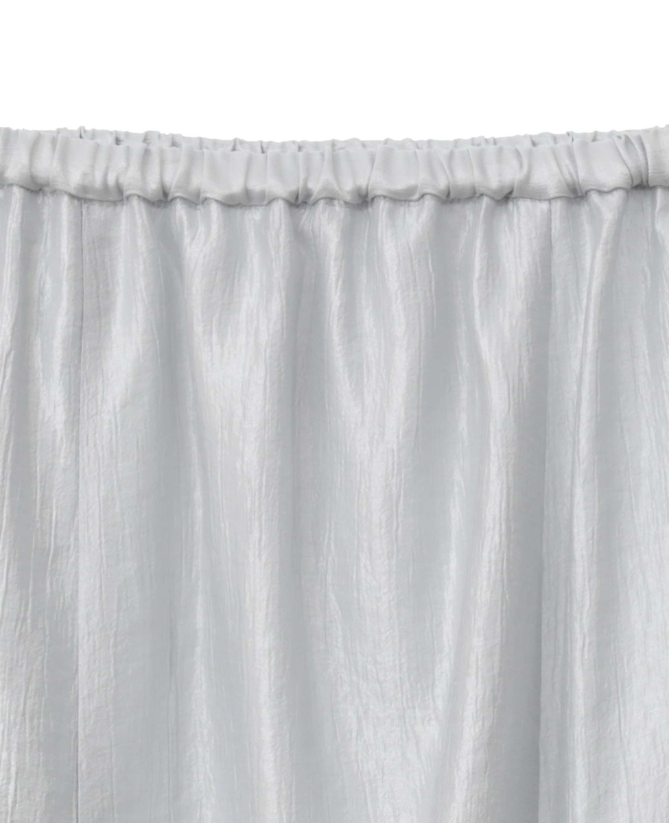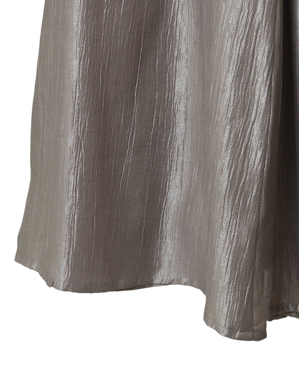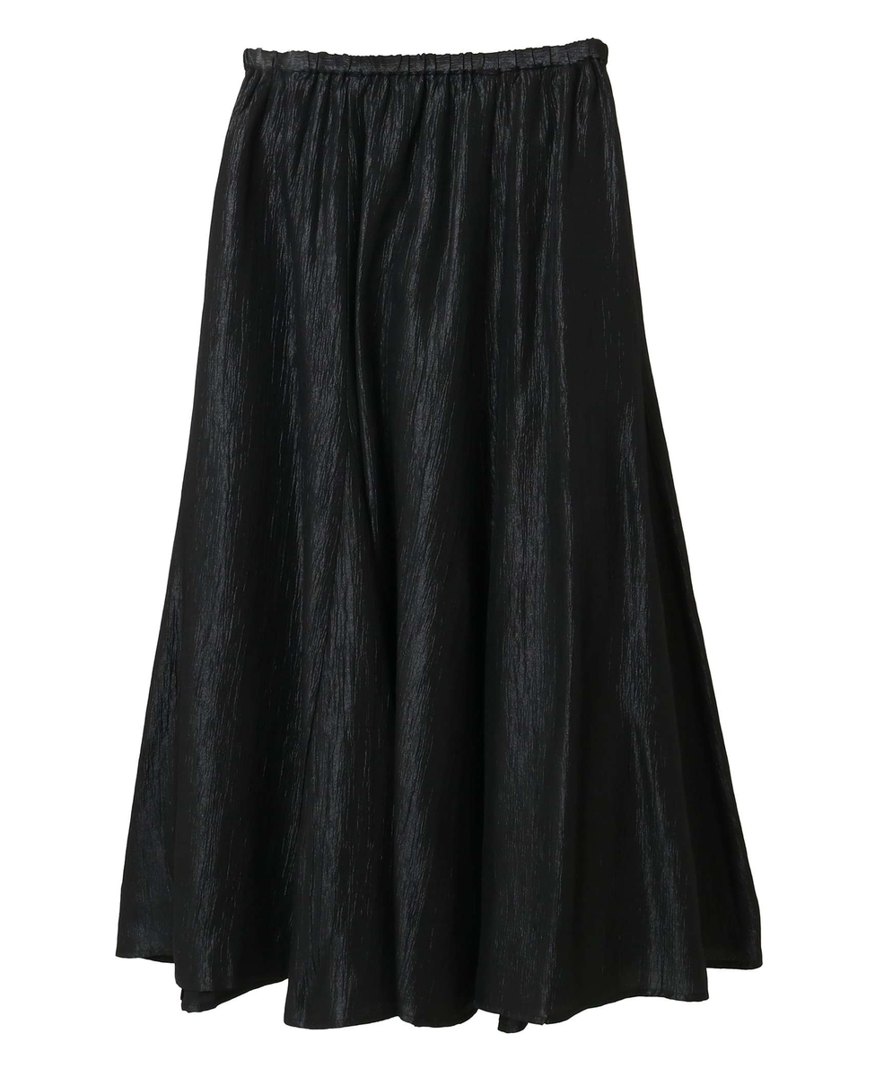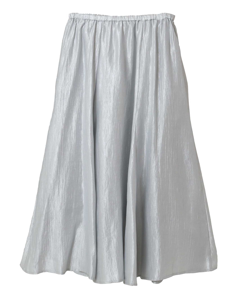 ピカピカしすぎない鈍い光沢のある素材で作ったスカート。ワッシャー加工を施してあり緩やかに凹凸のある表面感が着用しやすい、大人のための1枚です。シンプルなTシャツ合わせでもコーディネートが決まる存在感のあるおすすめアイテム。ウエストフルゴム+共地のリボンを通してあるのでサイズの調整が可能です。両サイドにポケットあり。シルバーのみペチコート付き。