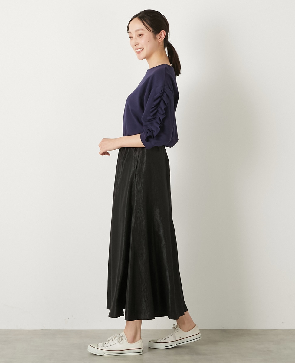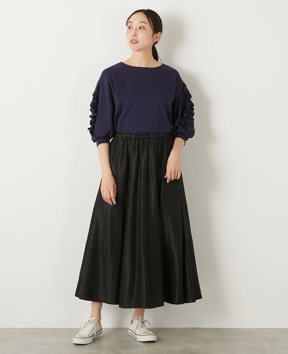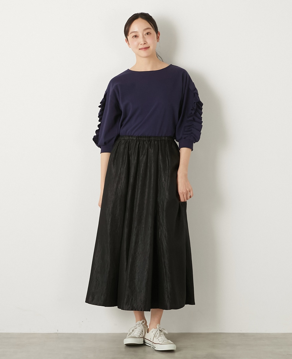 ピカピカしすぎない鈍い光沢のある素材で作ったスカート。ワッシャー加工を施してあり緩やかに凹凸のある表面感が着用しやすい、大人のための1枚です。シンプルなTシャツ合わせでもコーディネートが決まる存在感のあるおすすめアイテム。ウエストフルゴム+共地のリボンを通してあるのでサイズの調整が可能です。両サイドにポケットあり。シルバーのみペチコート付き。