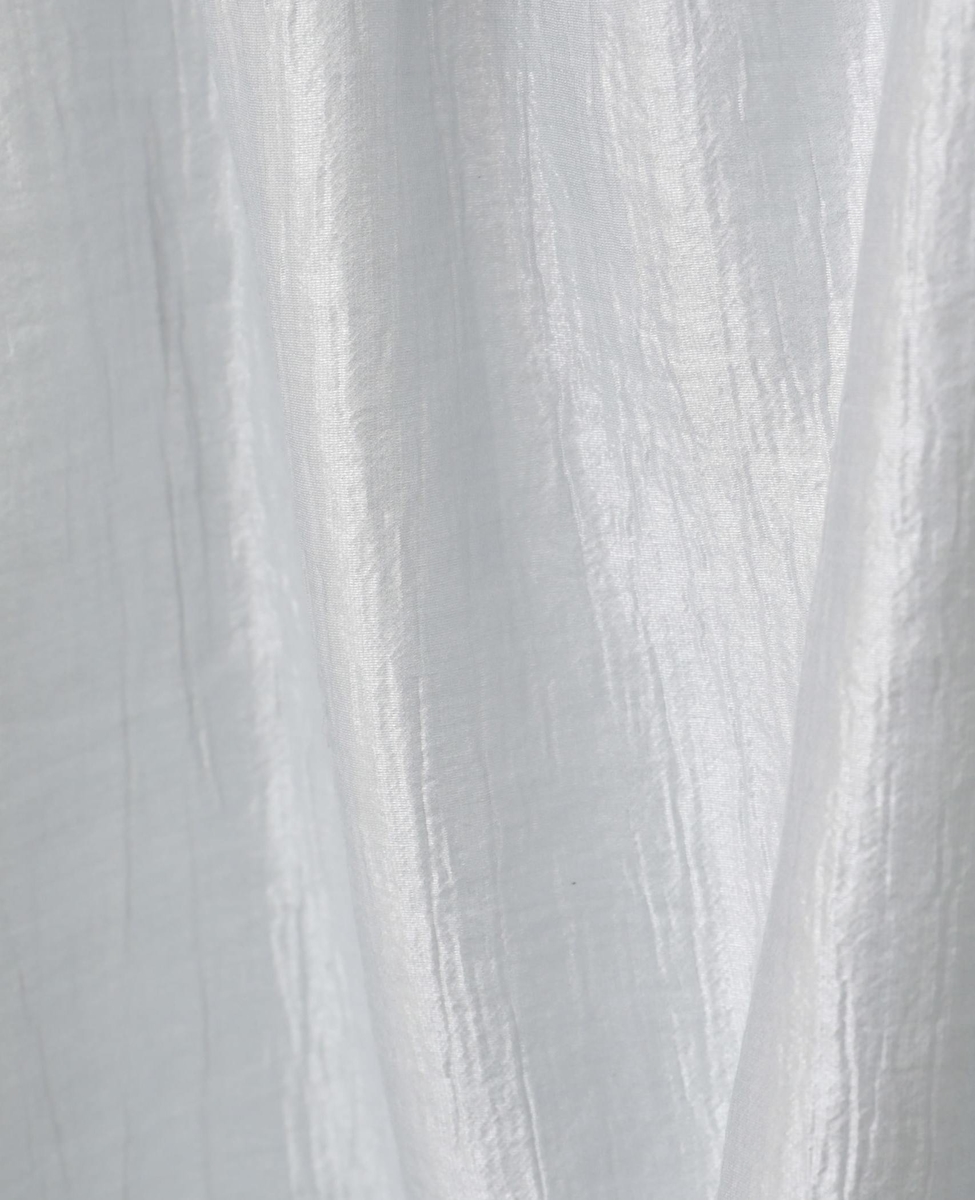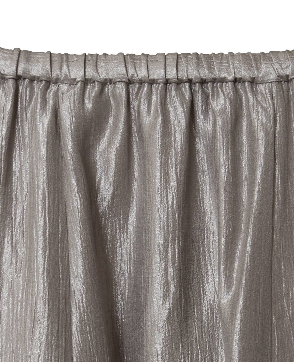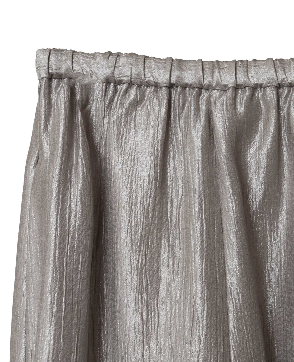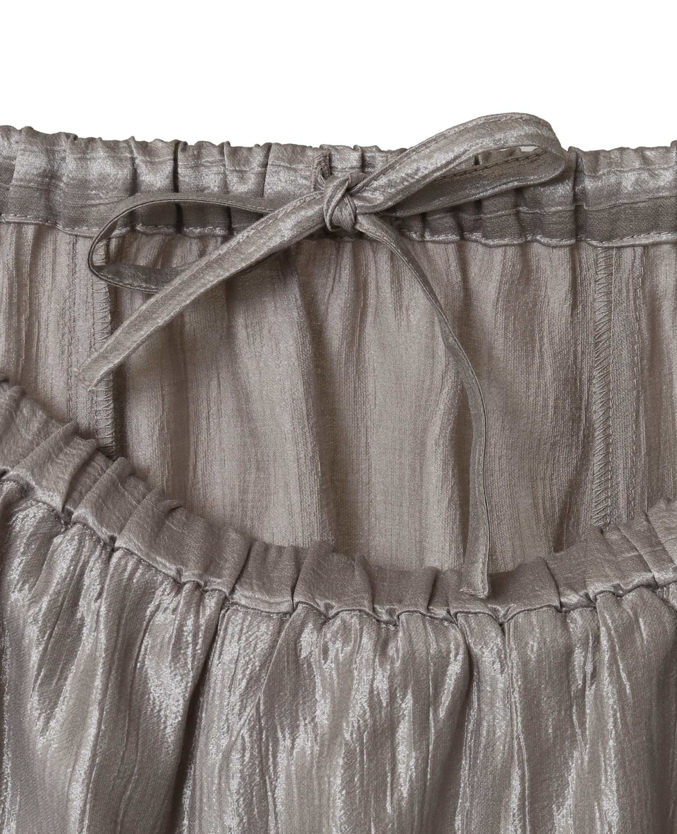 ピカピカしすぎない鈍い光沢のある素材で作ったスカート。ワッシャー加工を施してあり緩やかに凹凸のある表面感が着用しやすい、大人のための1枚です。シンプルなTシャツ合わせでもコーディネートが決まる存在感のあるおすすめアイテム。ウエストフルゴム+共地のリボンを通してあるのでサイズの調整が可能です。両サイドにポケットあり。シルバーのみペチコート付き。