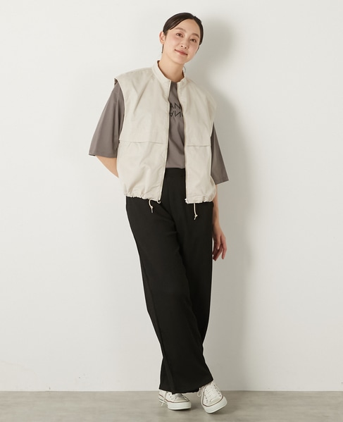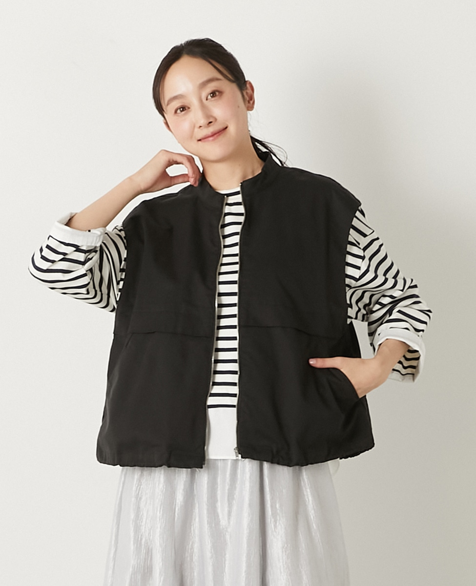 コットン×ポリエステルのギャバジン素材のジップベスト。カジュアルになりすぎないきれいな表面感でコーディネートのプラスワンアイテムとして活躍します。裾にはぐるりとドローコードを通してあり、ドロストさせるとふんわりと、よりスポーティーなシルエットに変化します。パンツ合わせはもちろん、スカートコーデの外しアイテムとしても◎