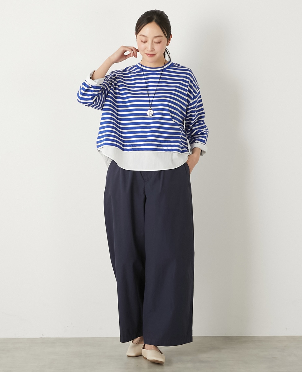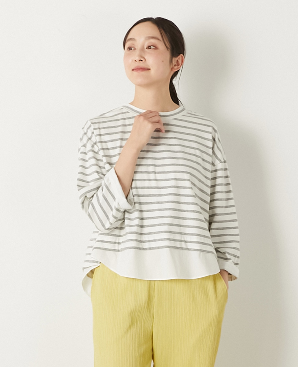 シンプルな辛口ボーダーにファブリックのオフホワイトを裾と袖口から覗かせたレイヤード風アイテム。ボディラインを拾い難いので一枚でデイリーなスタイルに活躍するカットソーです。ほんのり今の気分でボーダーの身頃部分をクロプド丈にしたバランス。パンツもスカートも合わせ易く着回して頂けます。