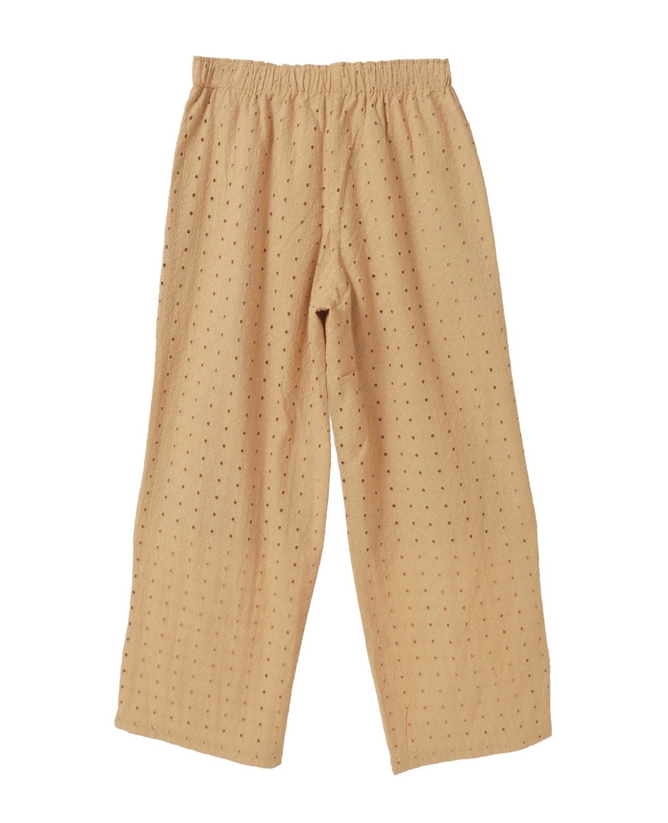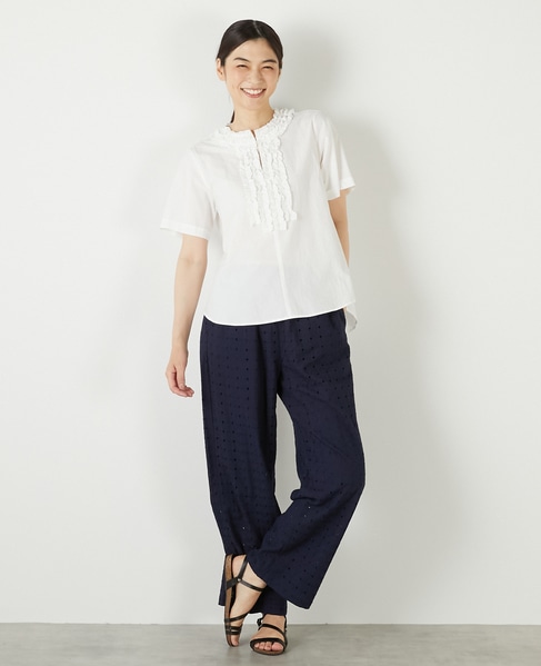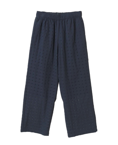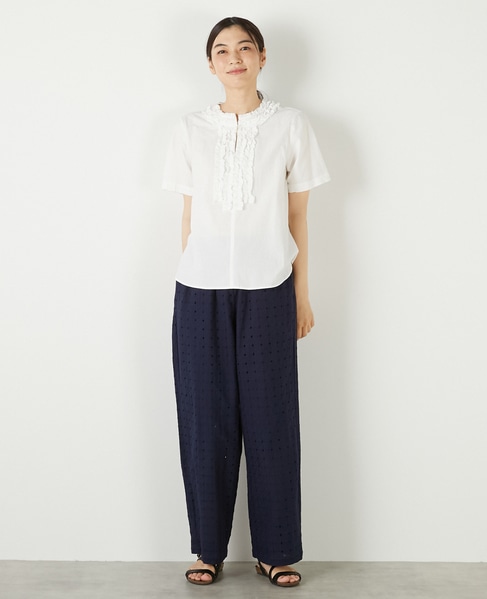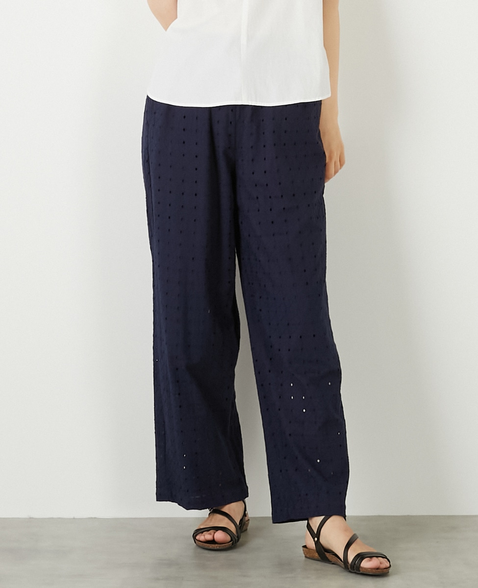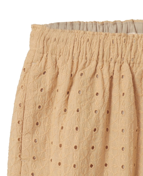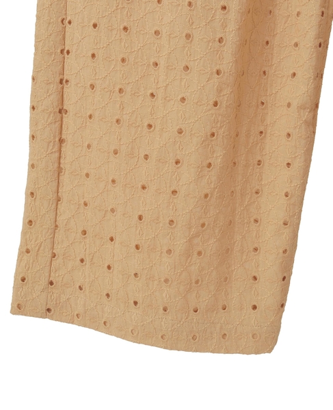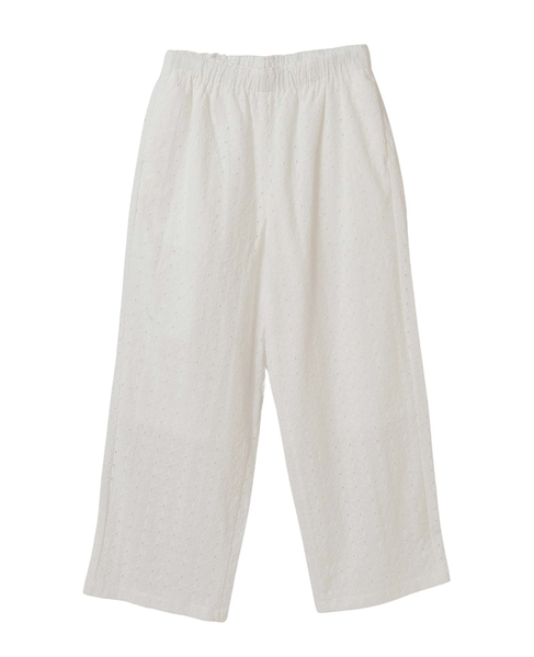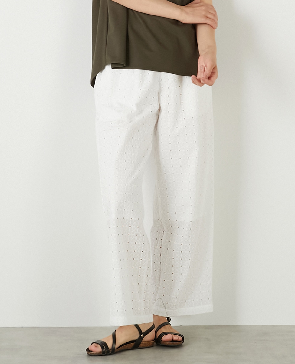 コットン100%のローンをベースに総刺しゅうを施した素材を贅沢に使ったパンツ。