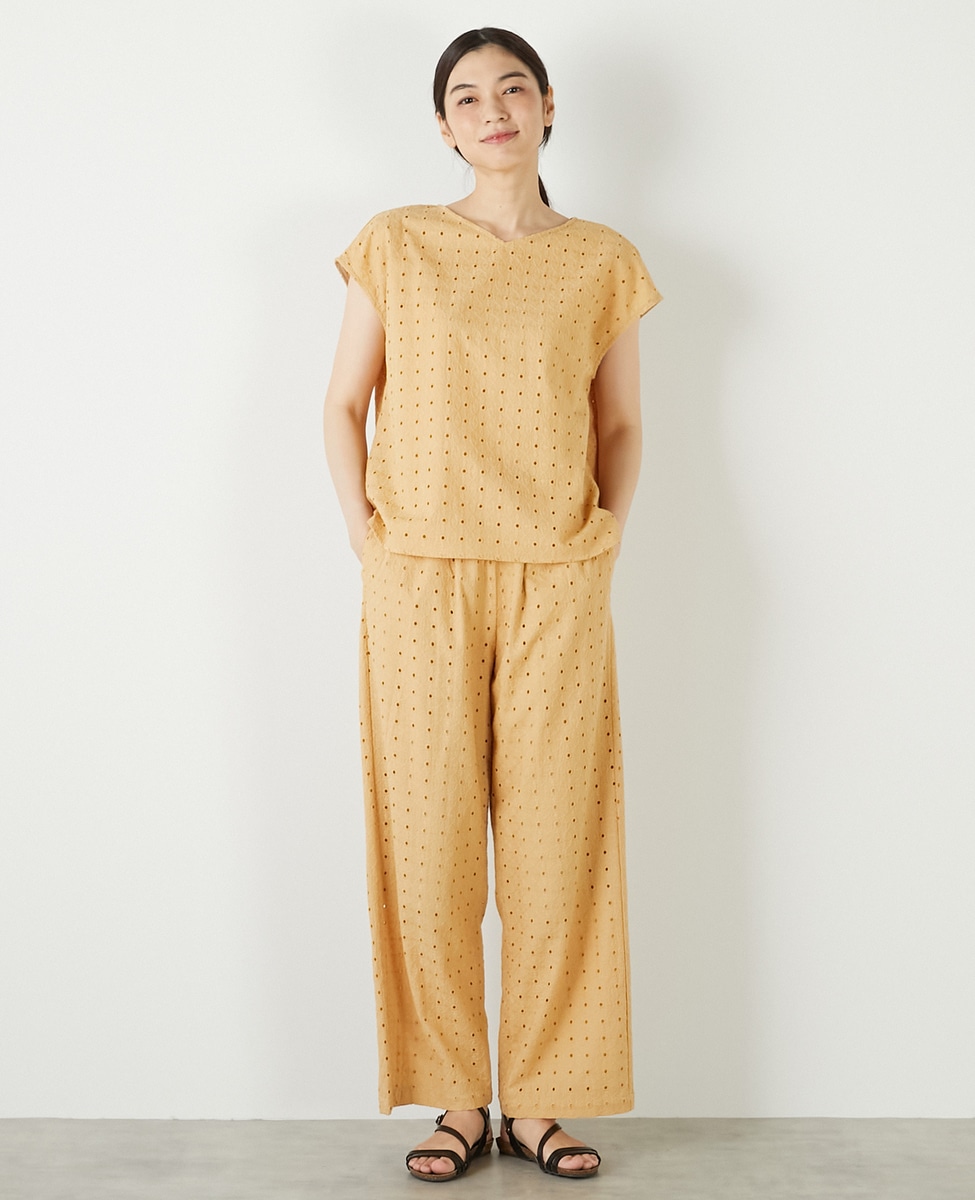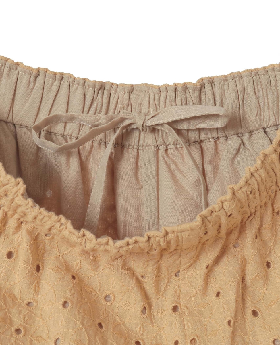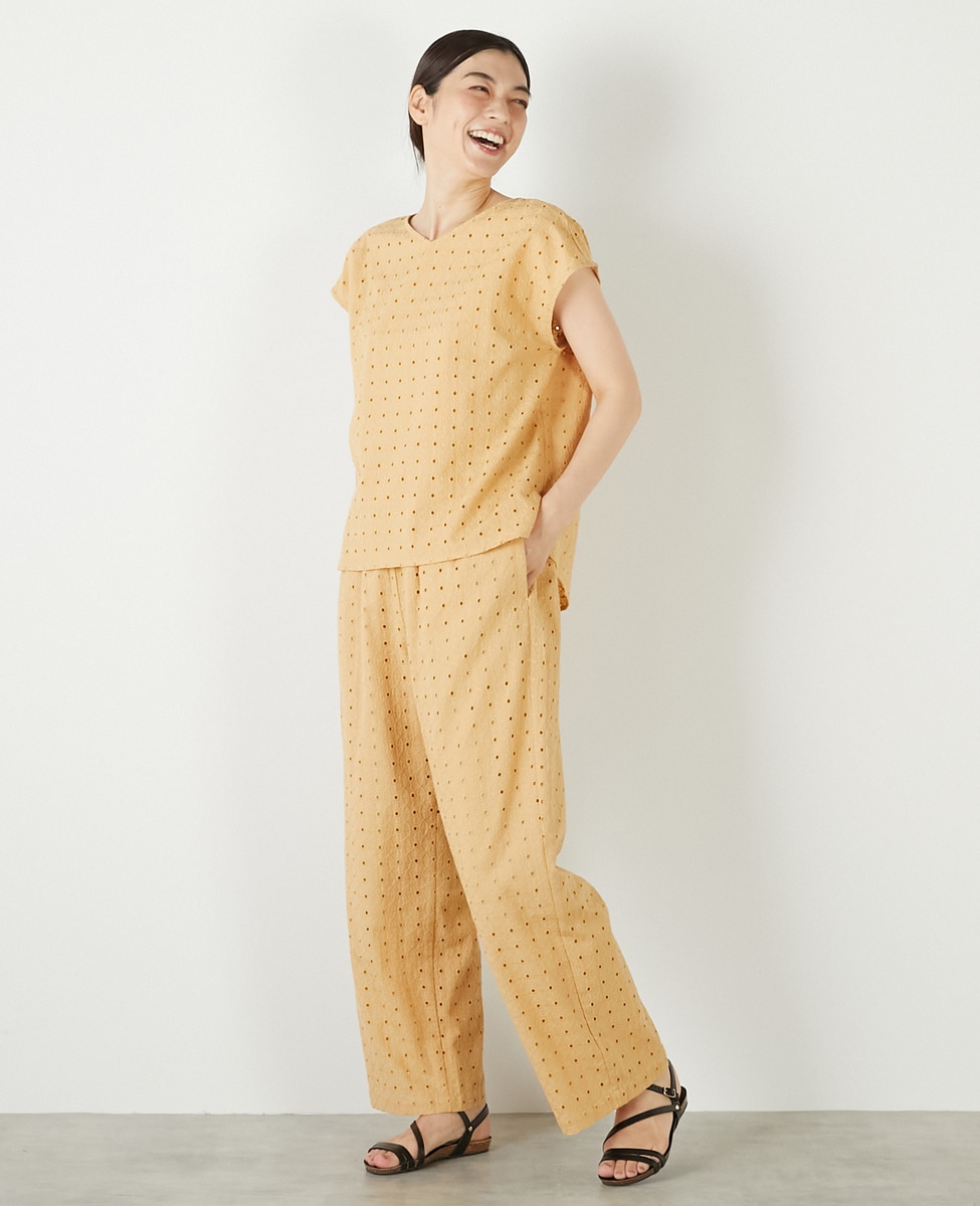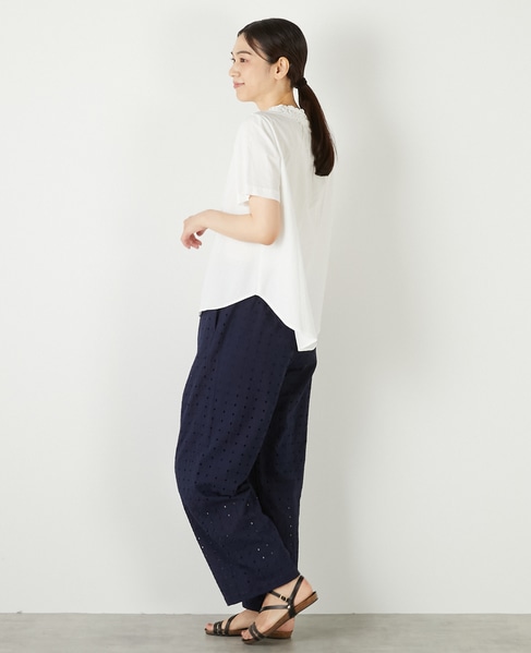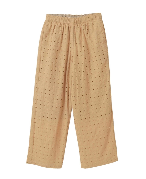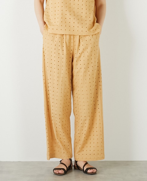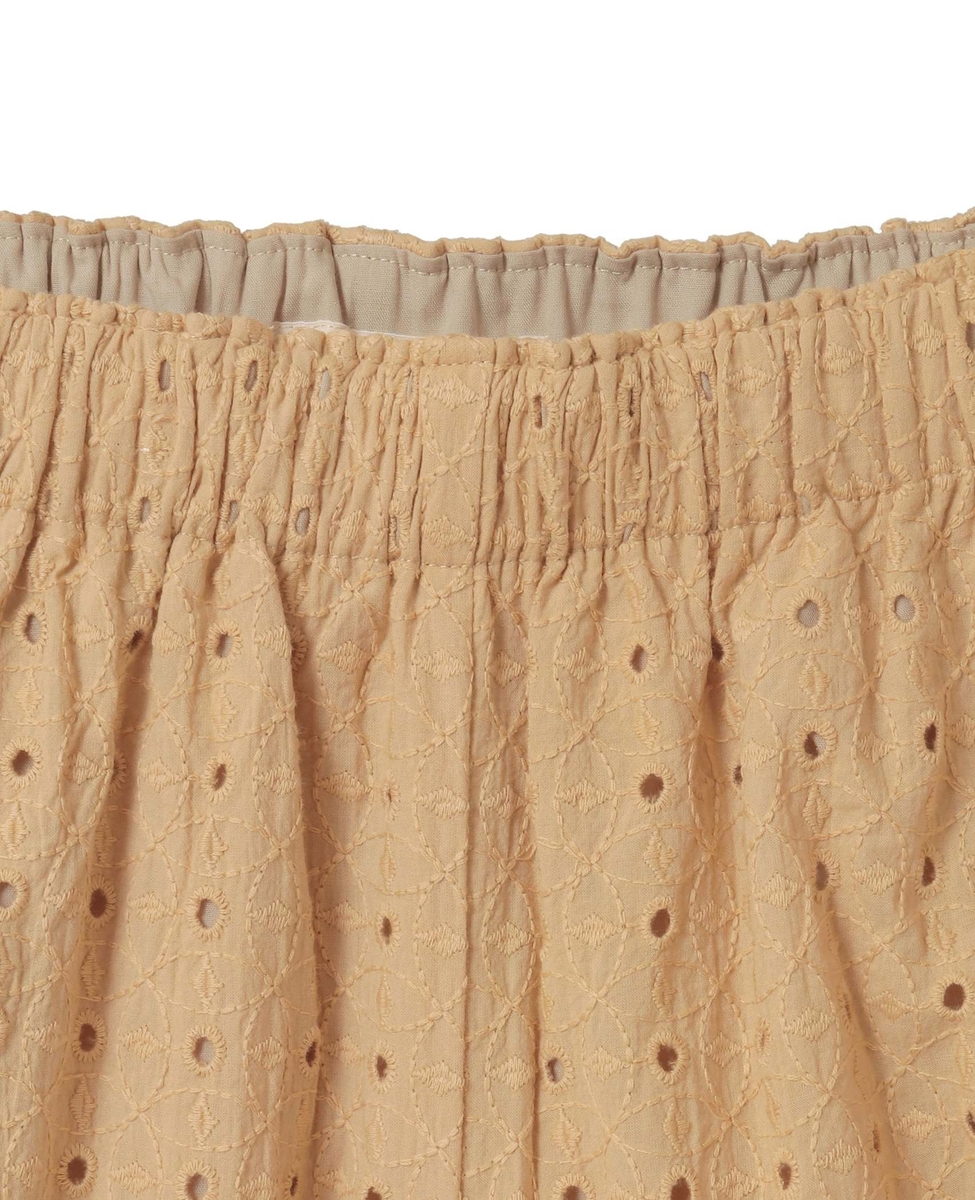 コットン100%のローンをベースに総刺しゅうを施した素材を贅沢に使ったパンツ。