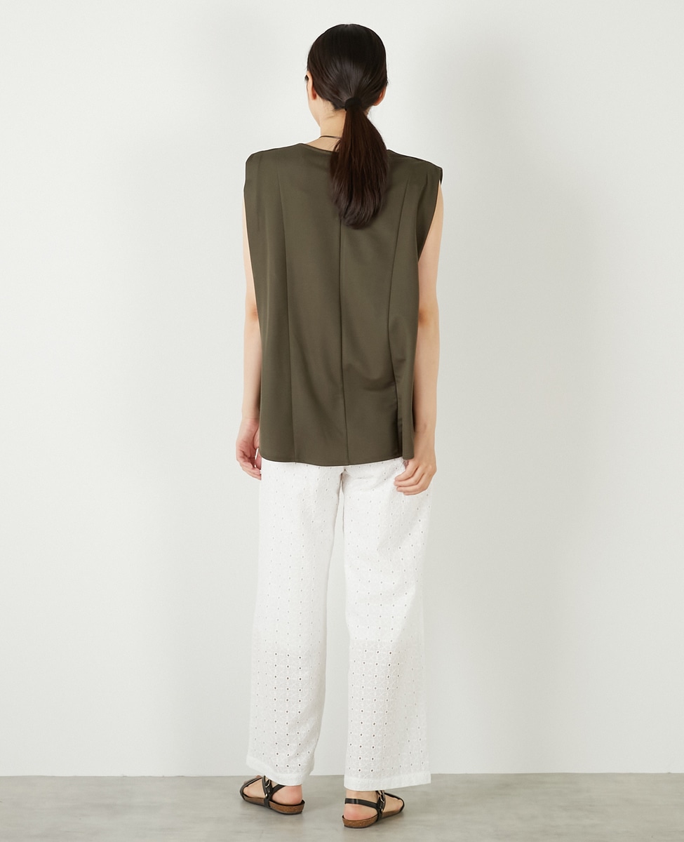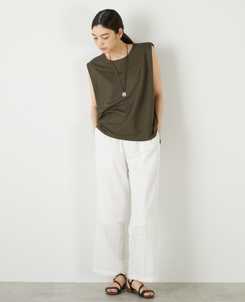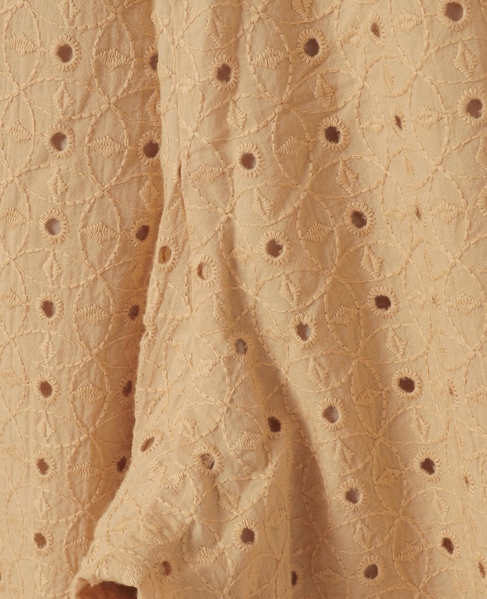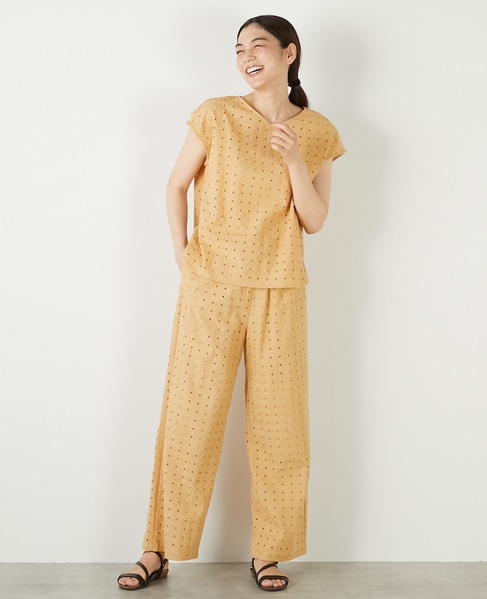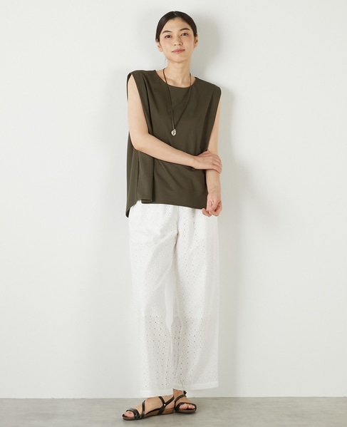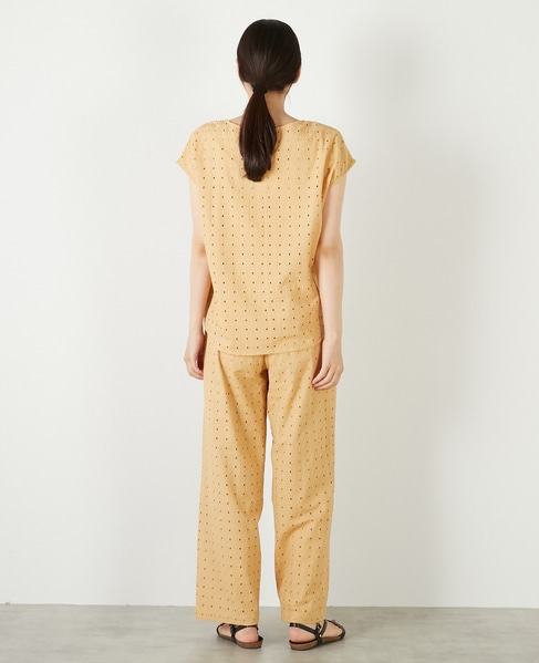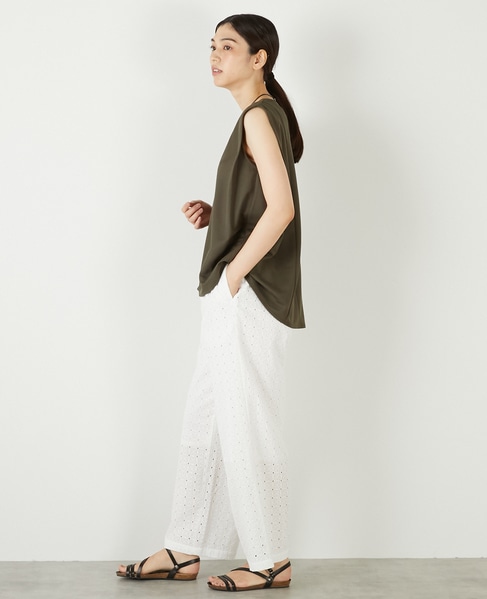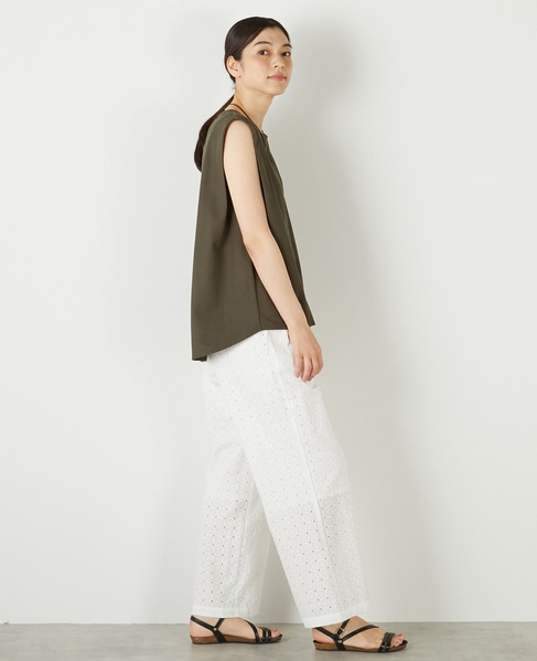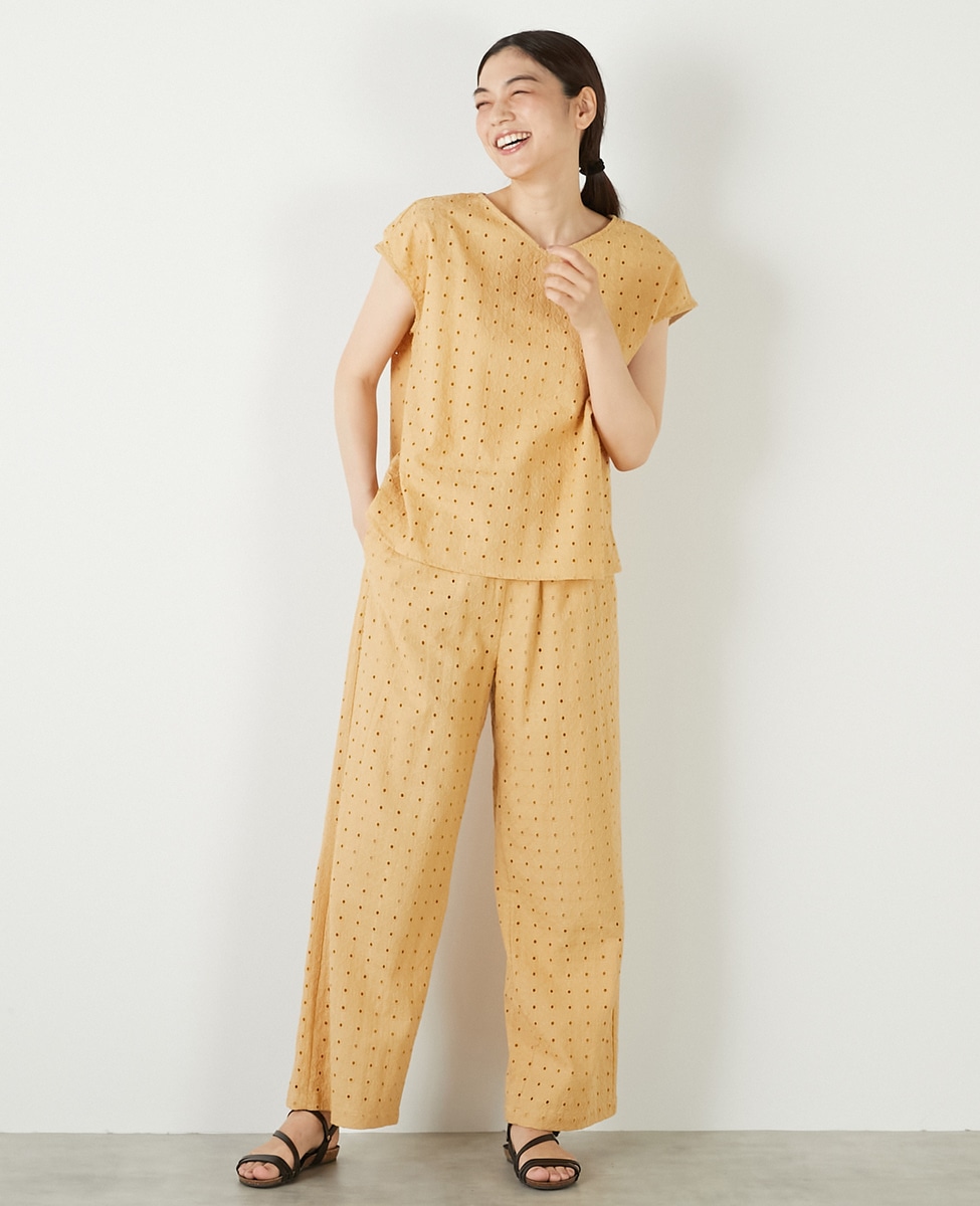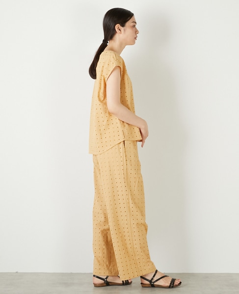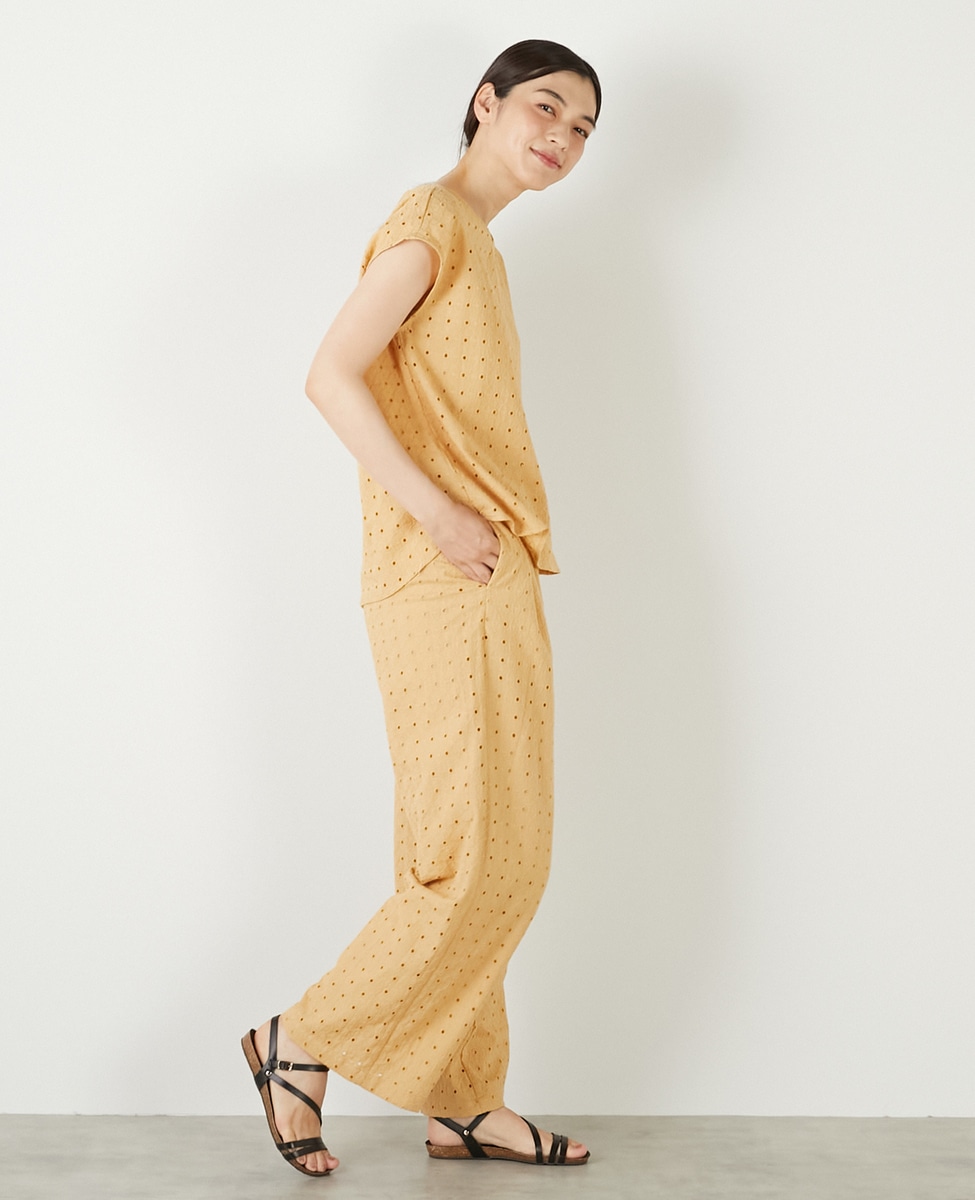 コットン100%のローンをベースに総刺しゅうを施した素材を贅沢に使ったパンツ。