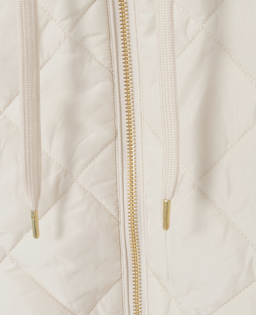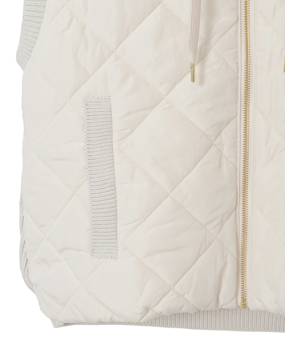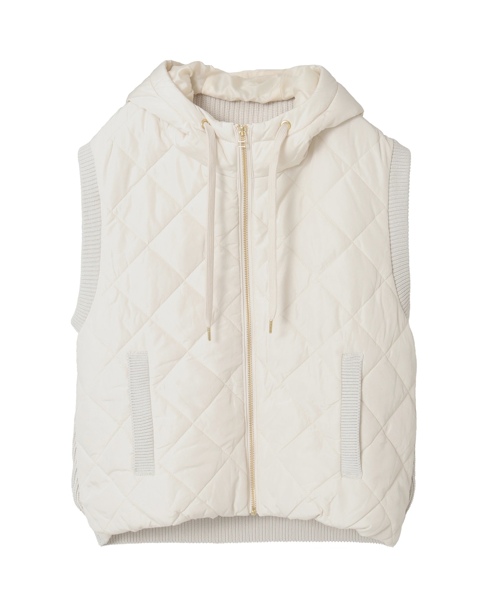 異素材切り替えのジップフードベスト。前身ごろとフードは中綿キルティング、後ろ身ごろはニットで仕上げた遊び心のあるデザインです。シンプルなコーディネートのプラスワンアイテムとして暑い時期から活躍します。