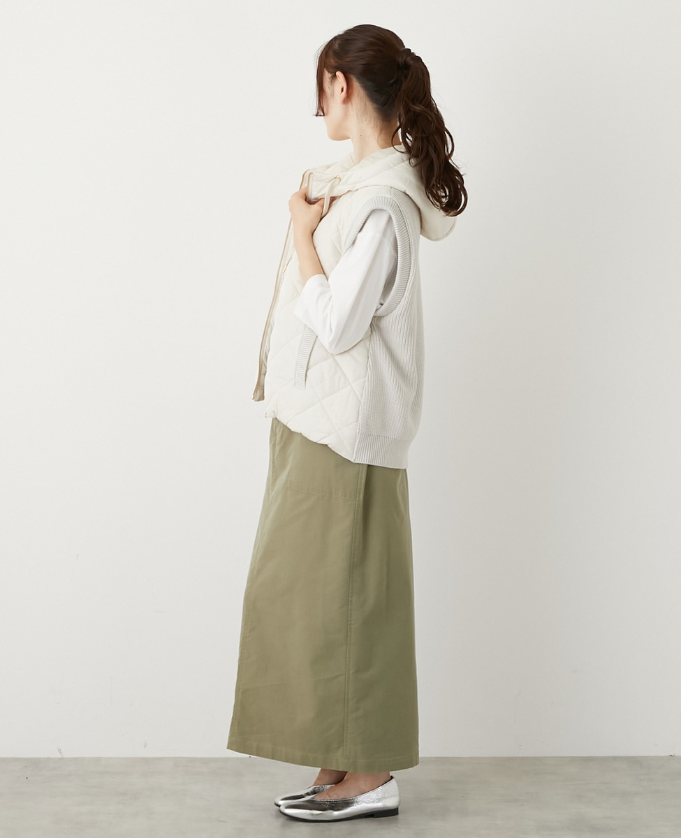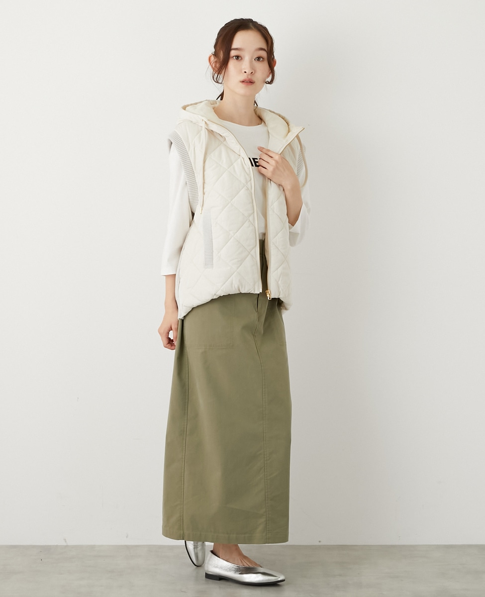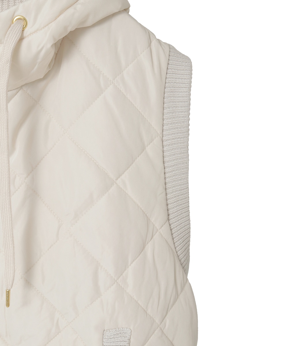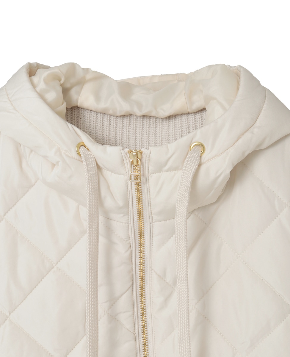 異素材切り替えのジップフードベスト。前身ごろとフードは中綿キルティング、後ろ身ごろはニットで仕上げた遊び心のあるデザインです。シンプルなコーディネートのプラスワンアイテムとして暑い時期から活躍します。