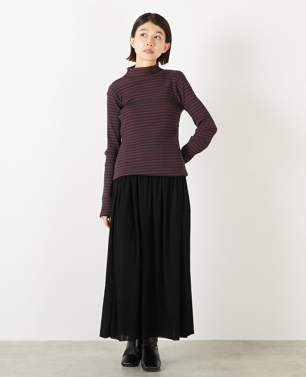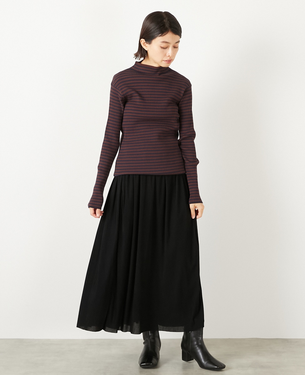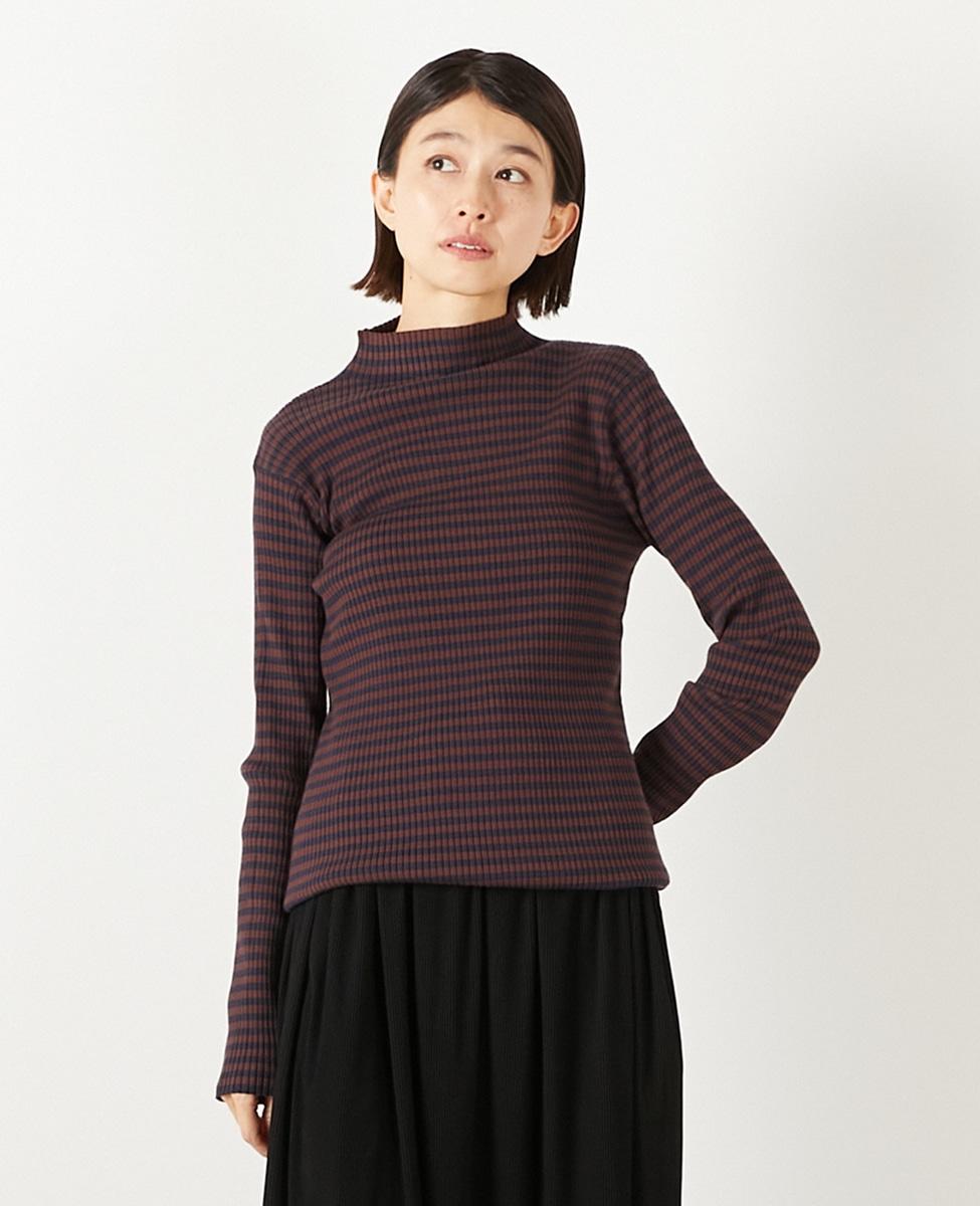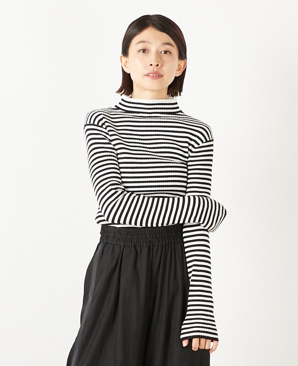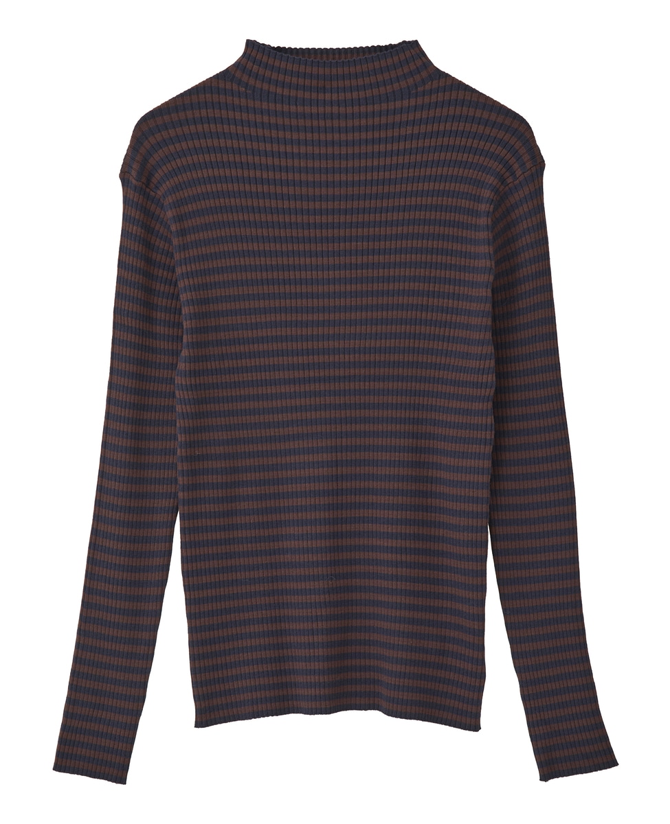 綺麗めにもカジュアルにも使える万能ワイドリブ。襟元が綺麗に見えるボトルネックプルオーバー。肌触りよくチクチク感のない編地、インナーとして重宝するニット。無地と単色プレーンなボーダーのアソートです。