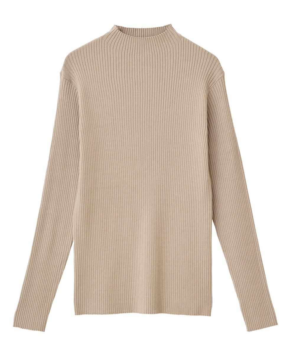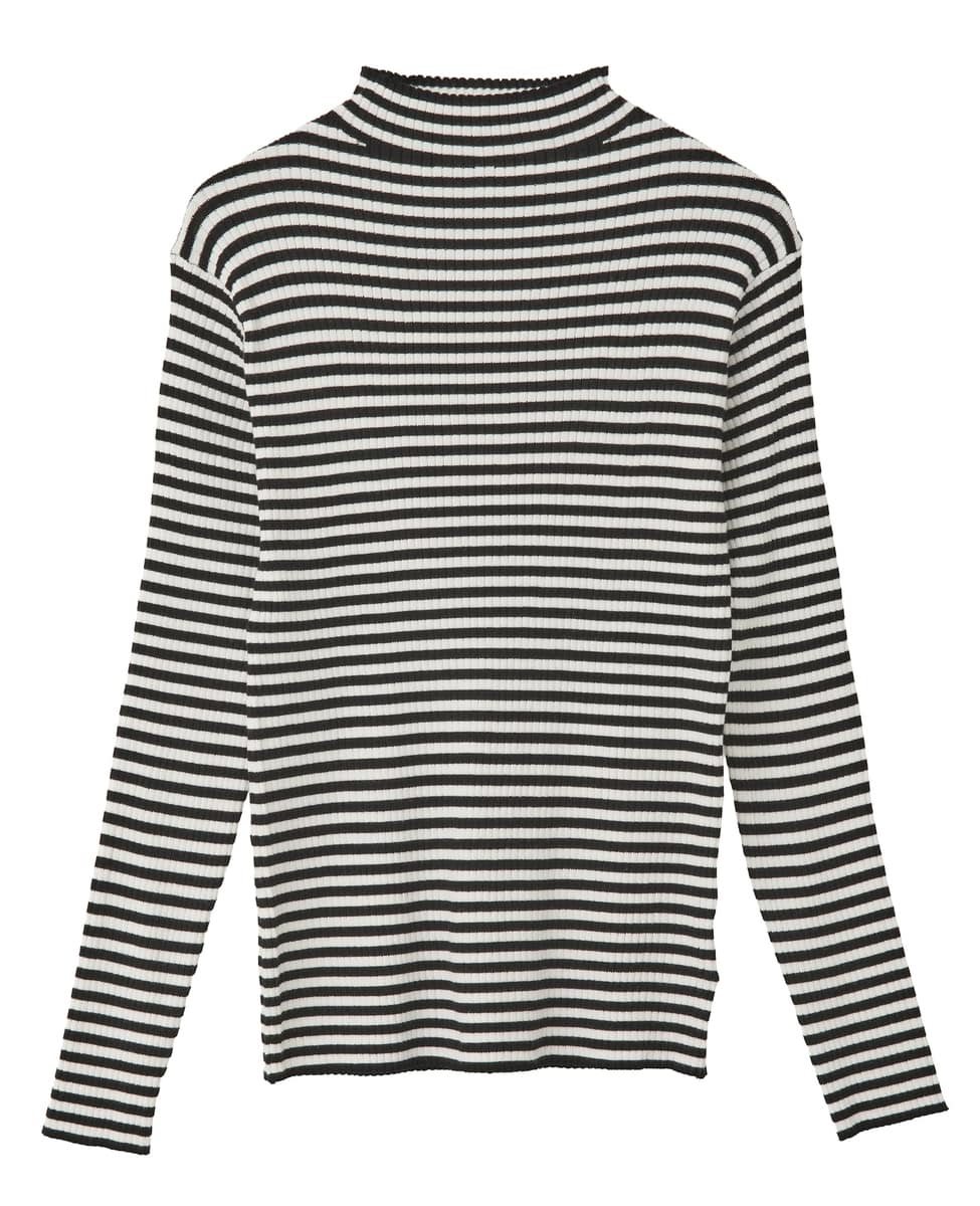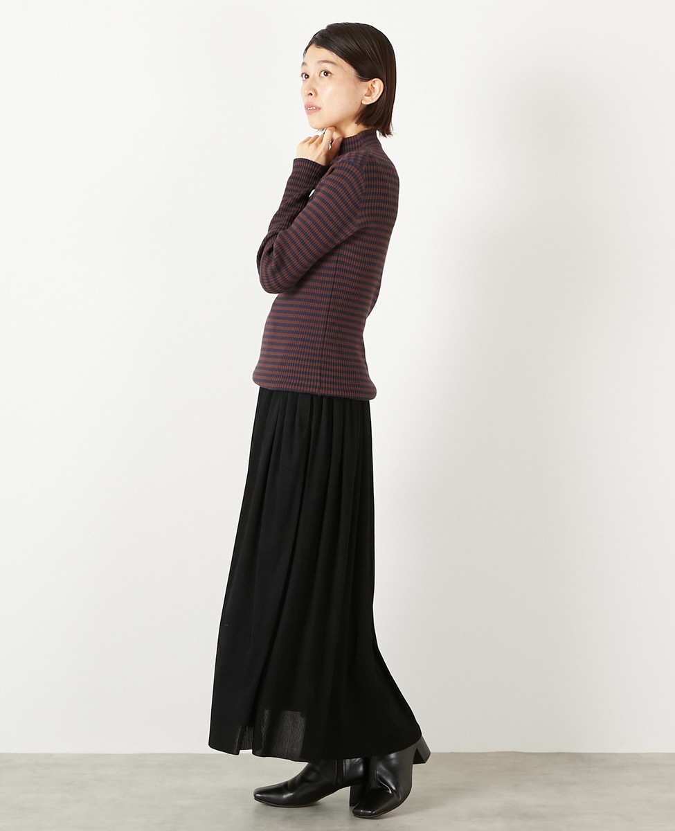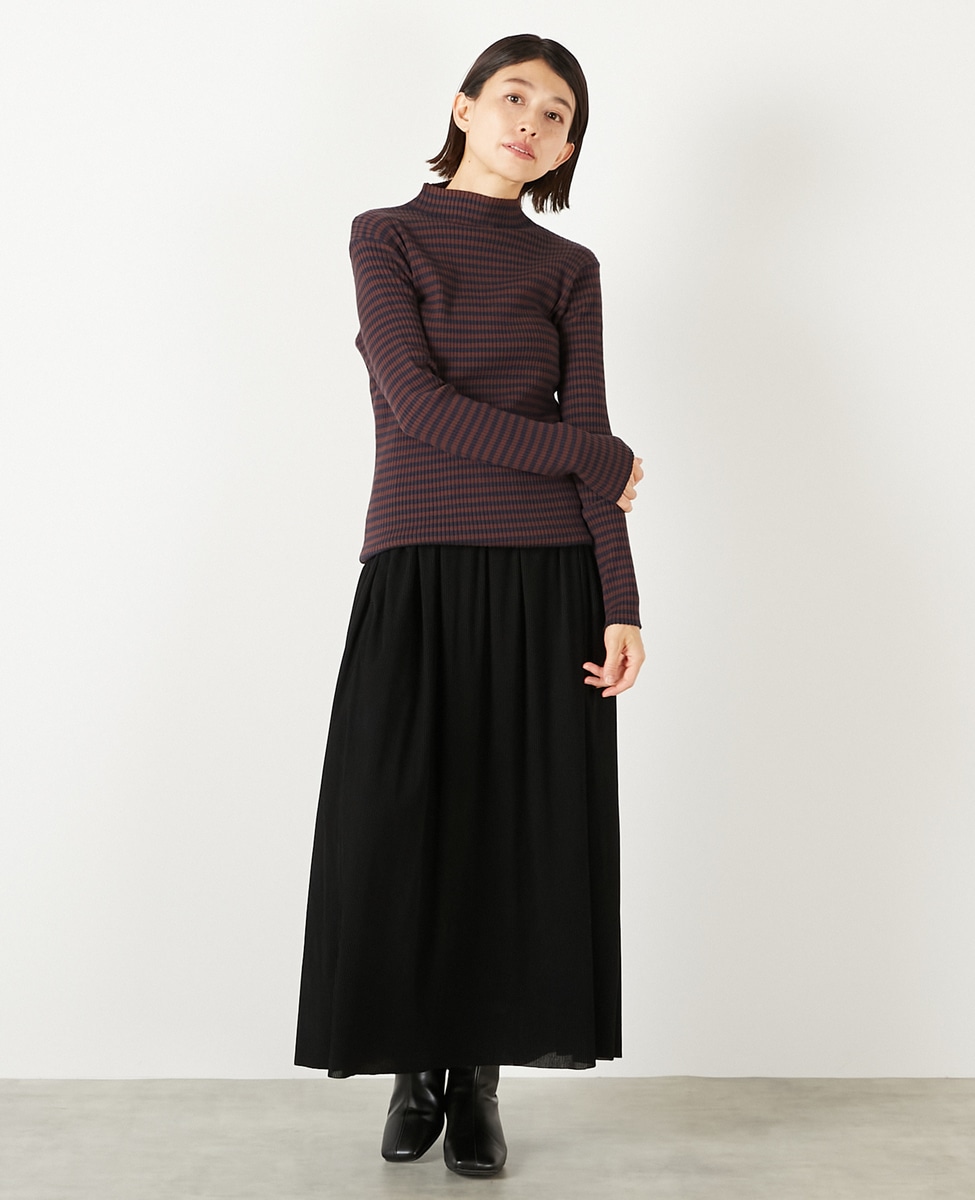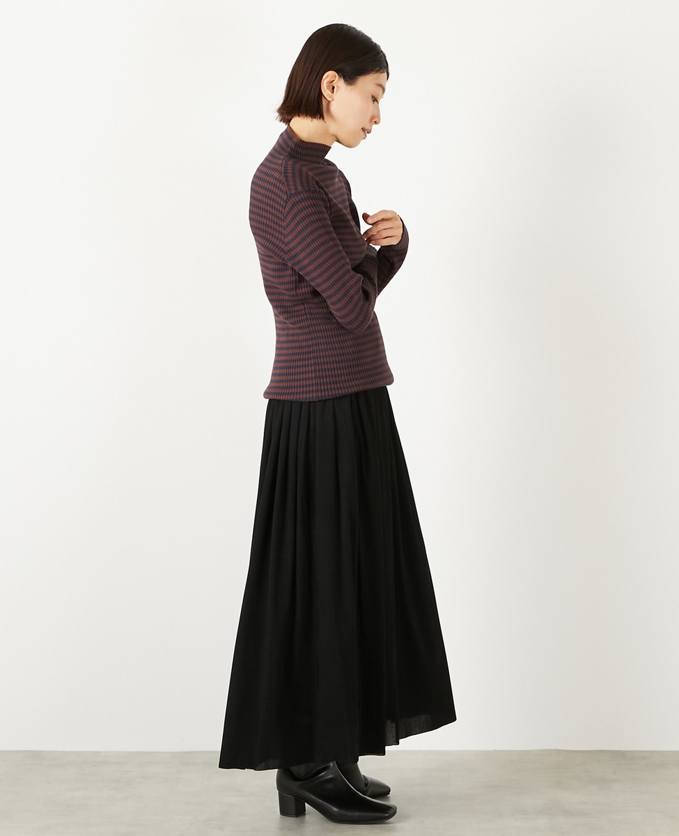 綺麗めにもカジュアルにも使える万能ワイドリブ。襟元が綺麗に見えるボトルネックプルオーバー。肌触りよくチクチク感のない編地、インナーとして重宝するニット。無地と単色プレーンなボーダーのアソートです。