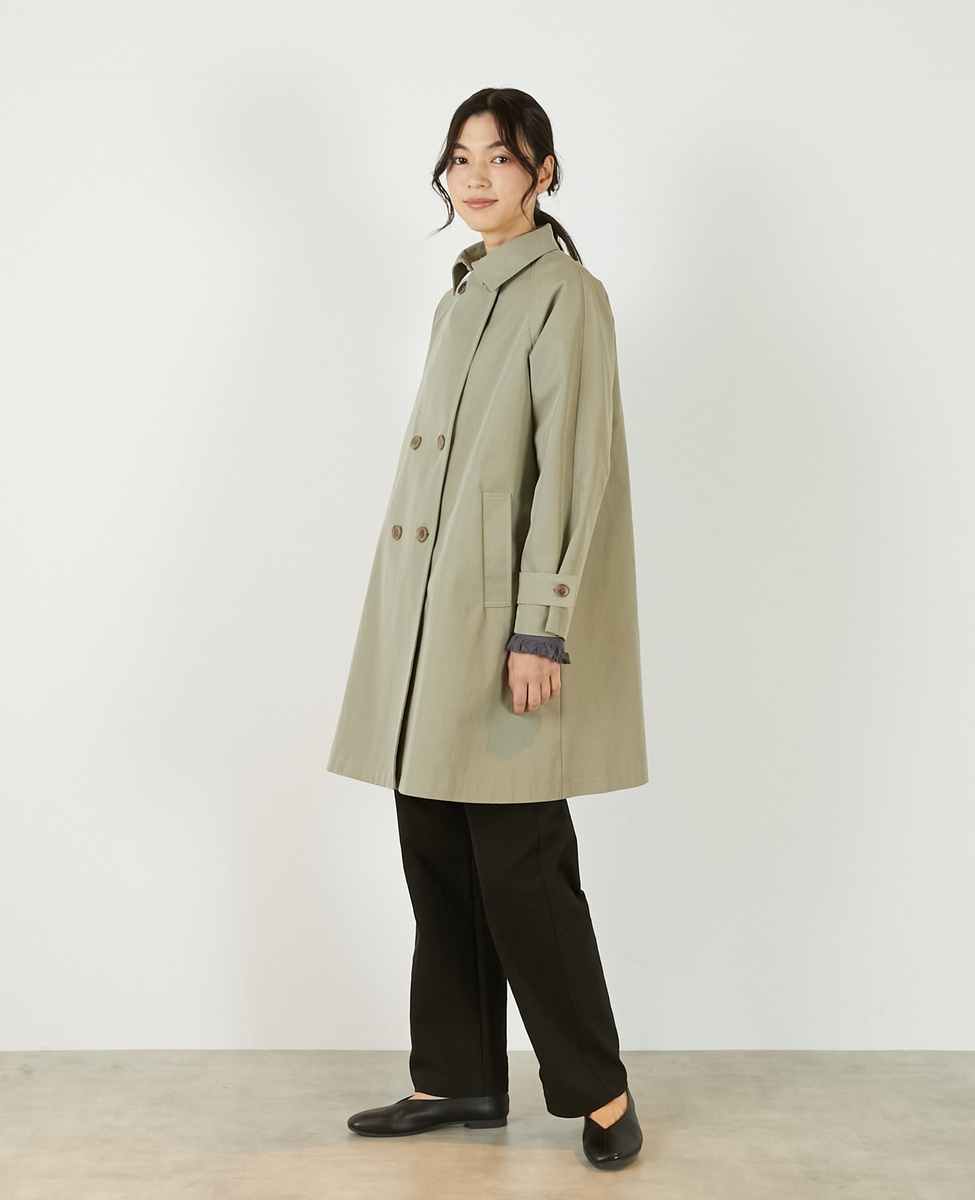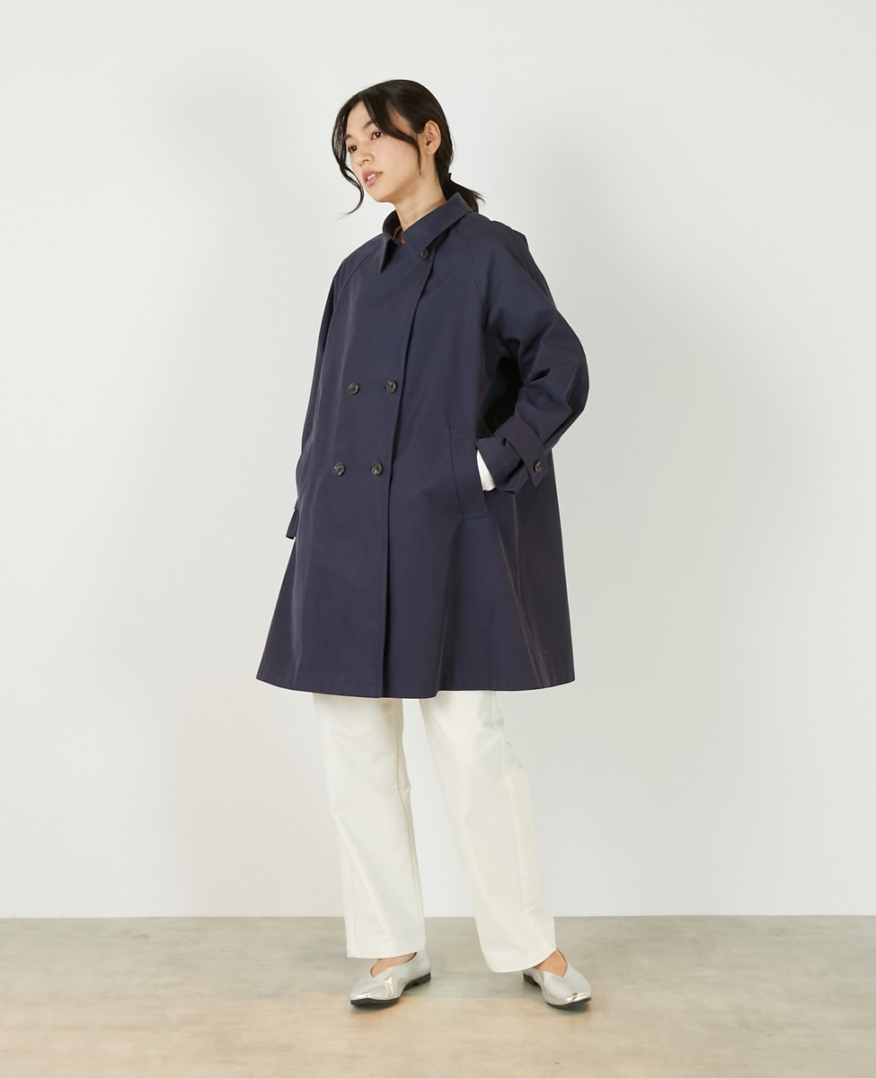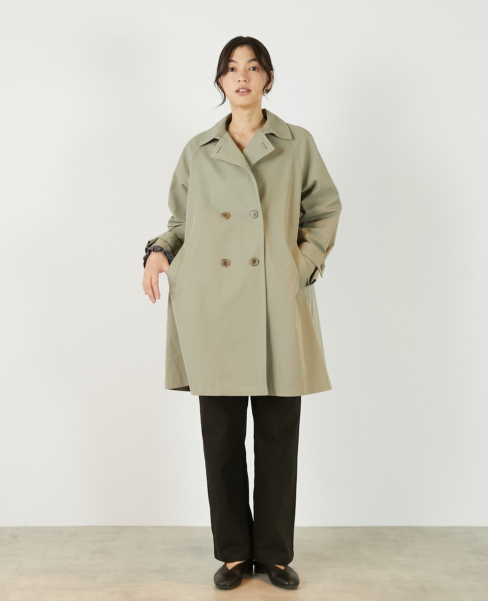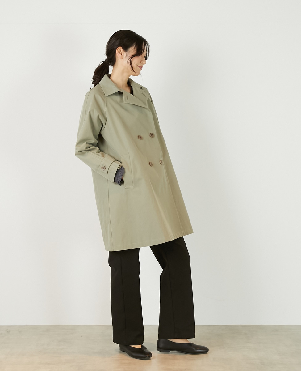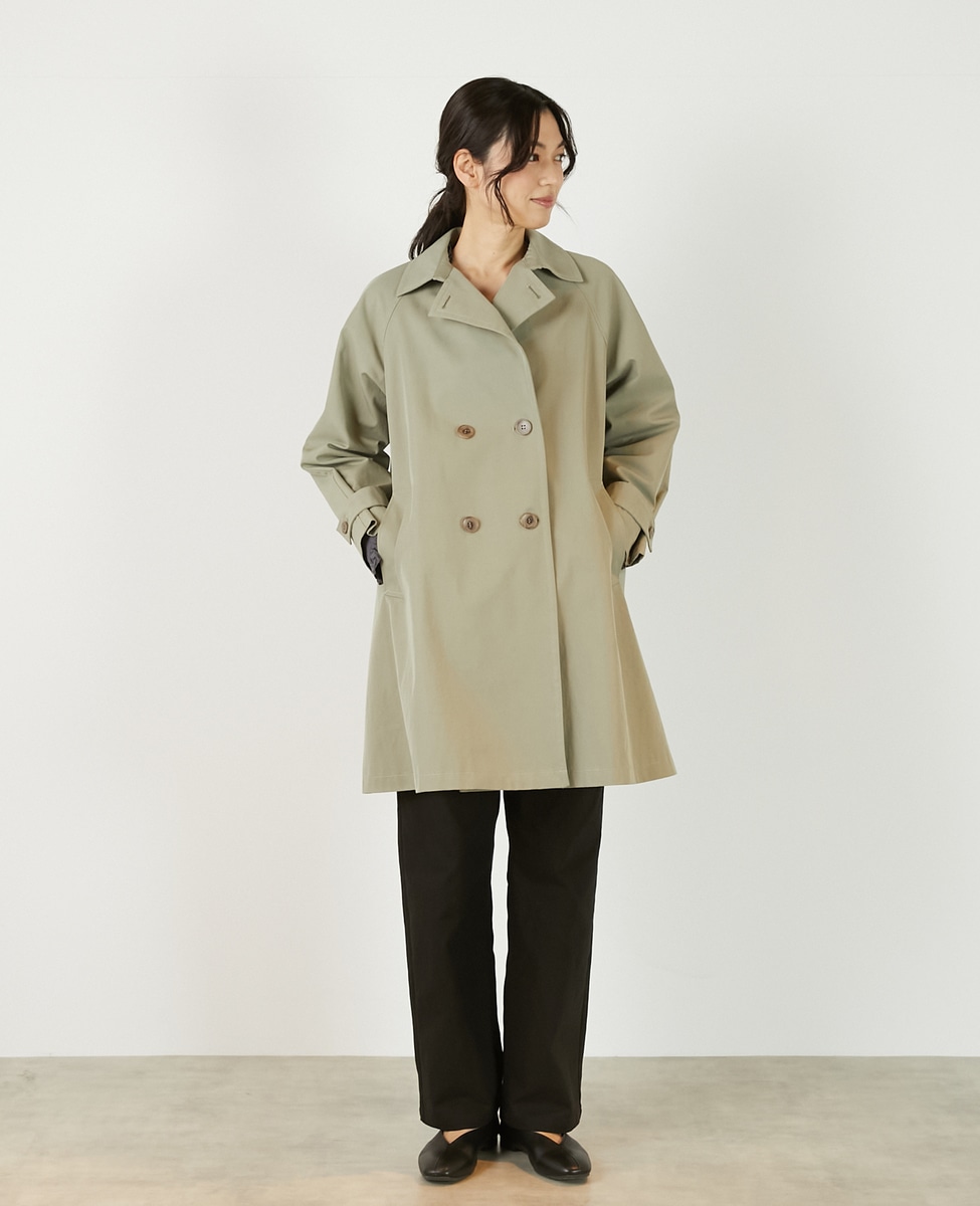 上品でさりげない光沢感のあるコットン×ポリエステルギャバジン素材で作ったトレンチ風のダブルのコート。着こなしやすいミドル丈と裾にむかって広がりのあるテントシルエットでカジュアルにもきれい目にもすっと馴染んでくれる魅力的な1枚です。袖口のタブの向きを変えることでアレンジ可能。総裏仕立て。