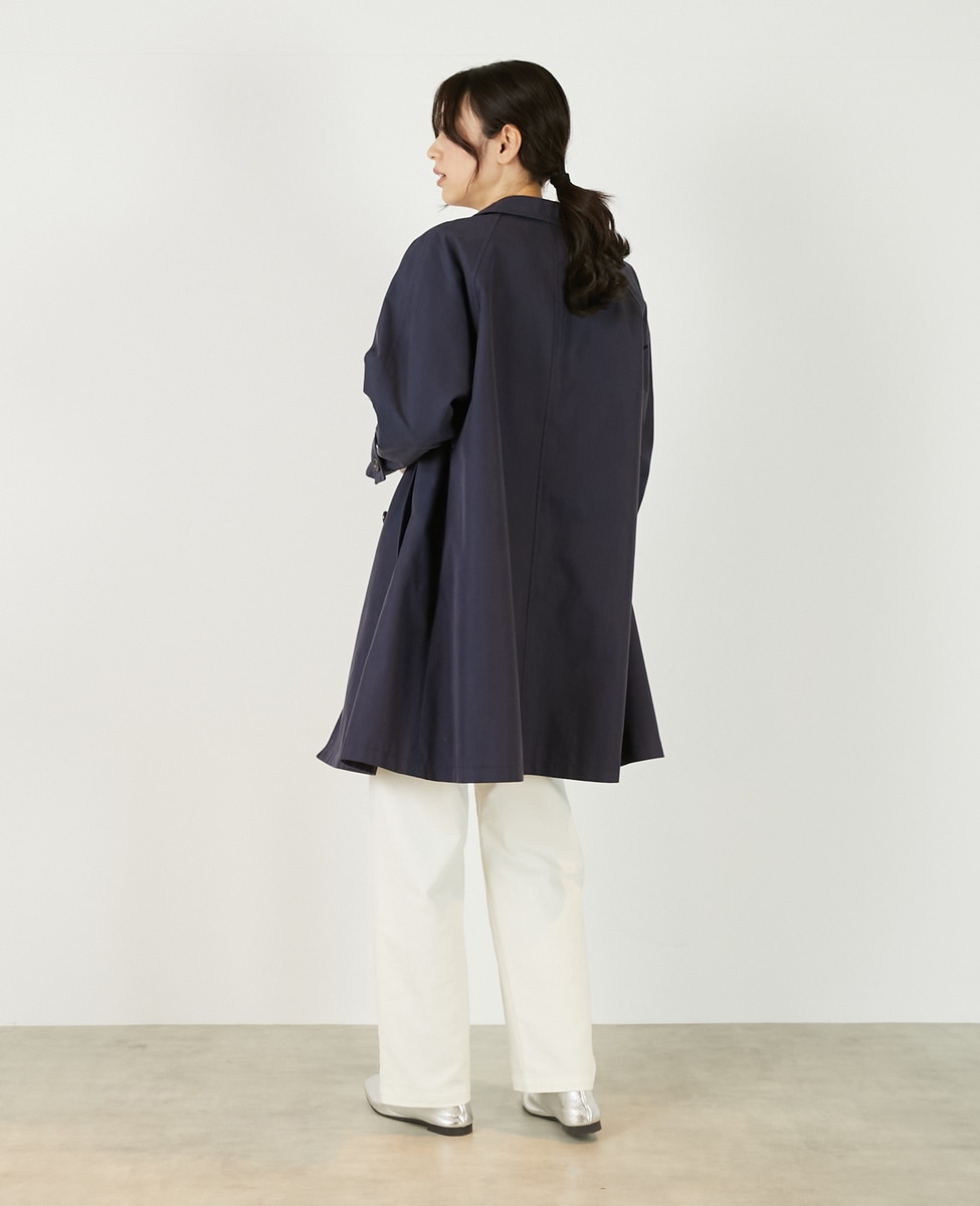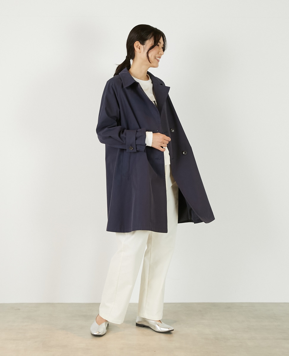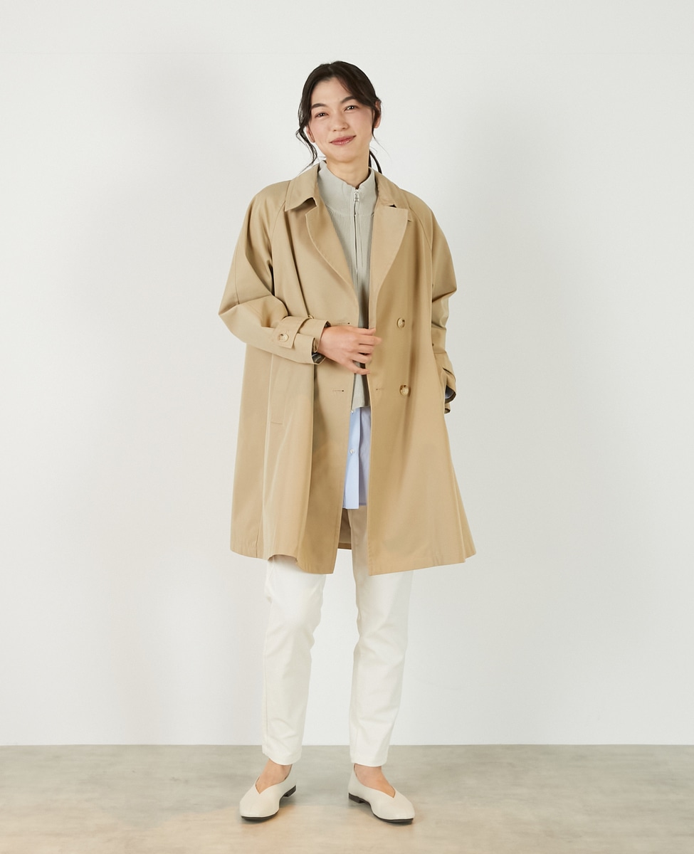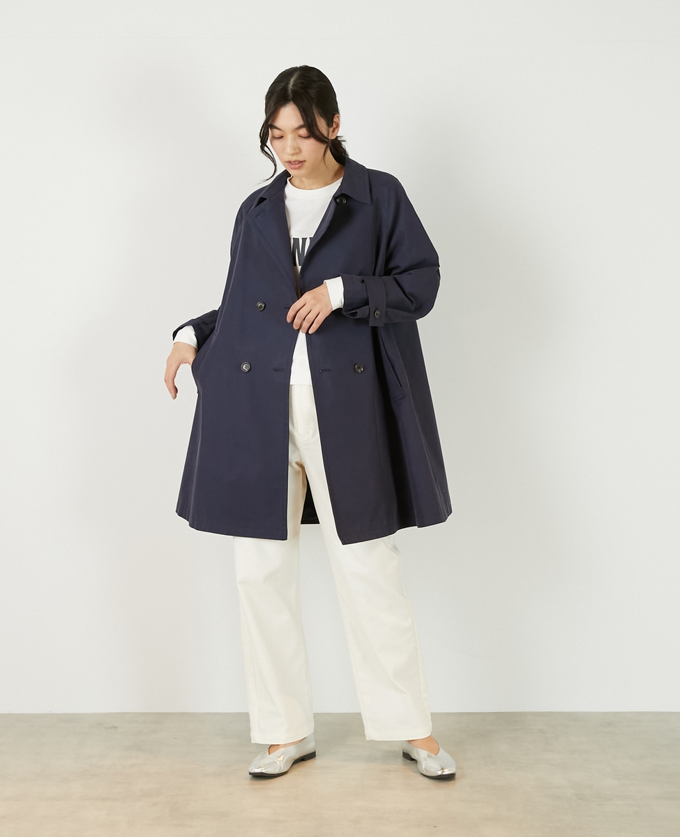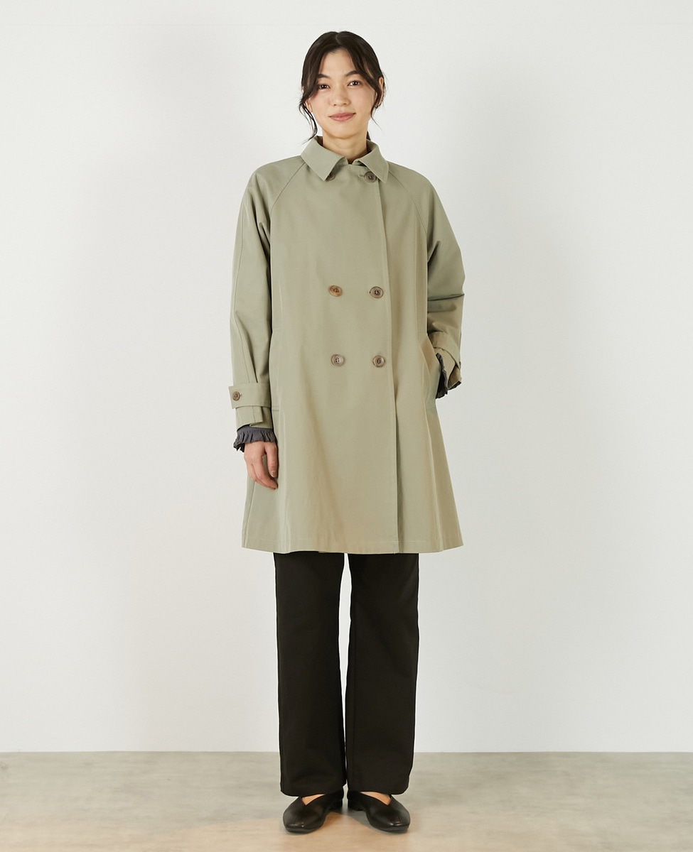 上品でさりげない光沢感のあるコットン×ポリエステルギャバジン素材で作ったトレンチ風のダブルのコート。着こなしやすいミドル丈と裾にむかって広がりのあるテントシルエットでカジュアルにもきれい目にもすっと馴染んでくれる魅力的な1枚です。袖口のタブの向きを変えることでアレンジ可能。総裏仕立て。
