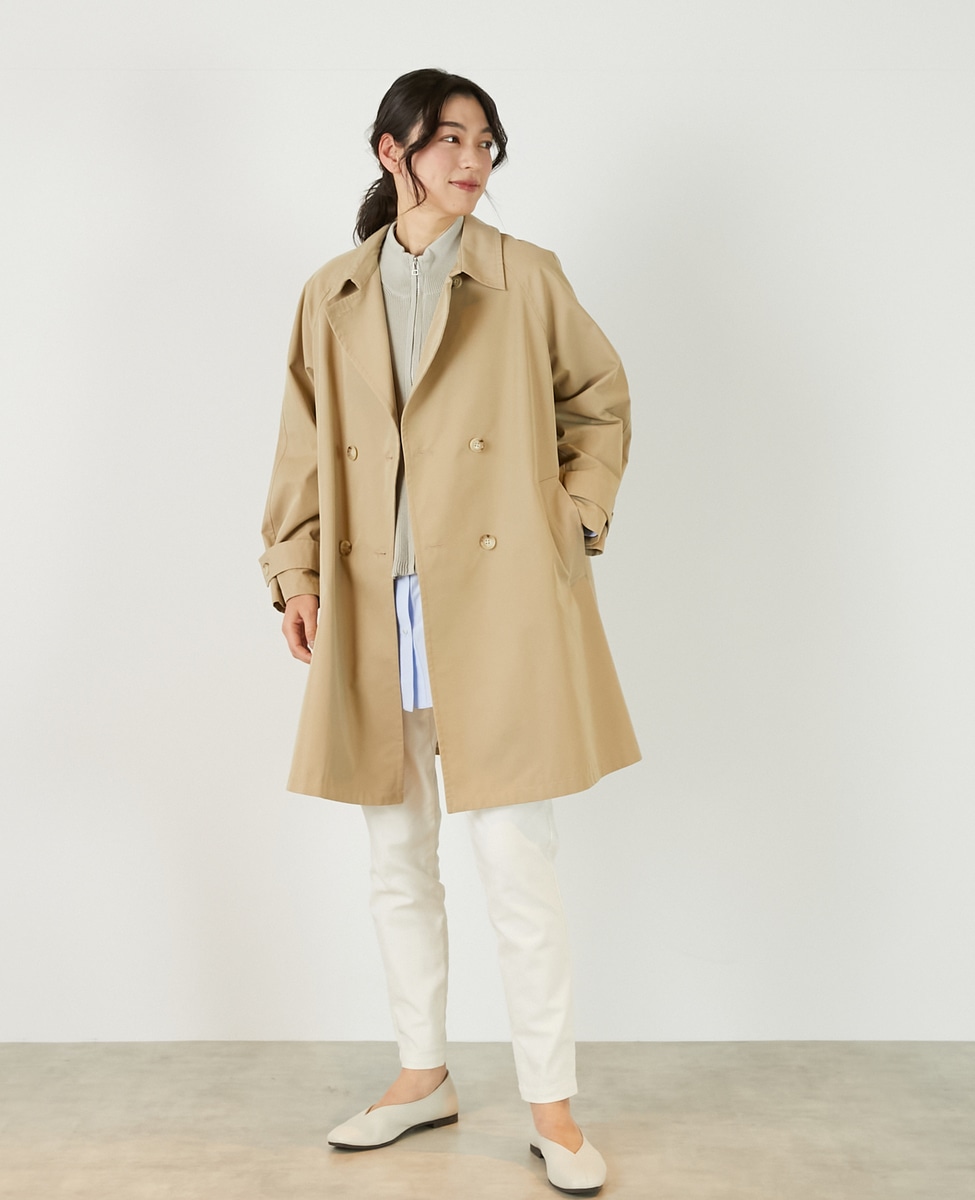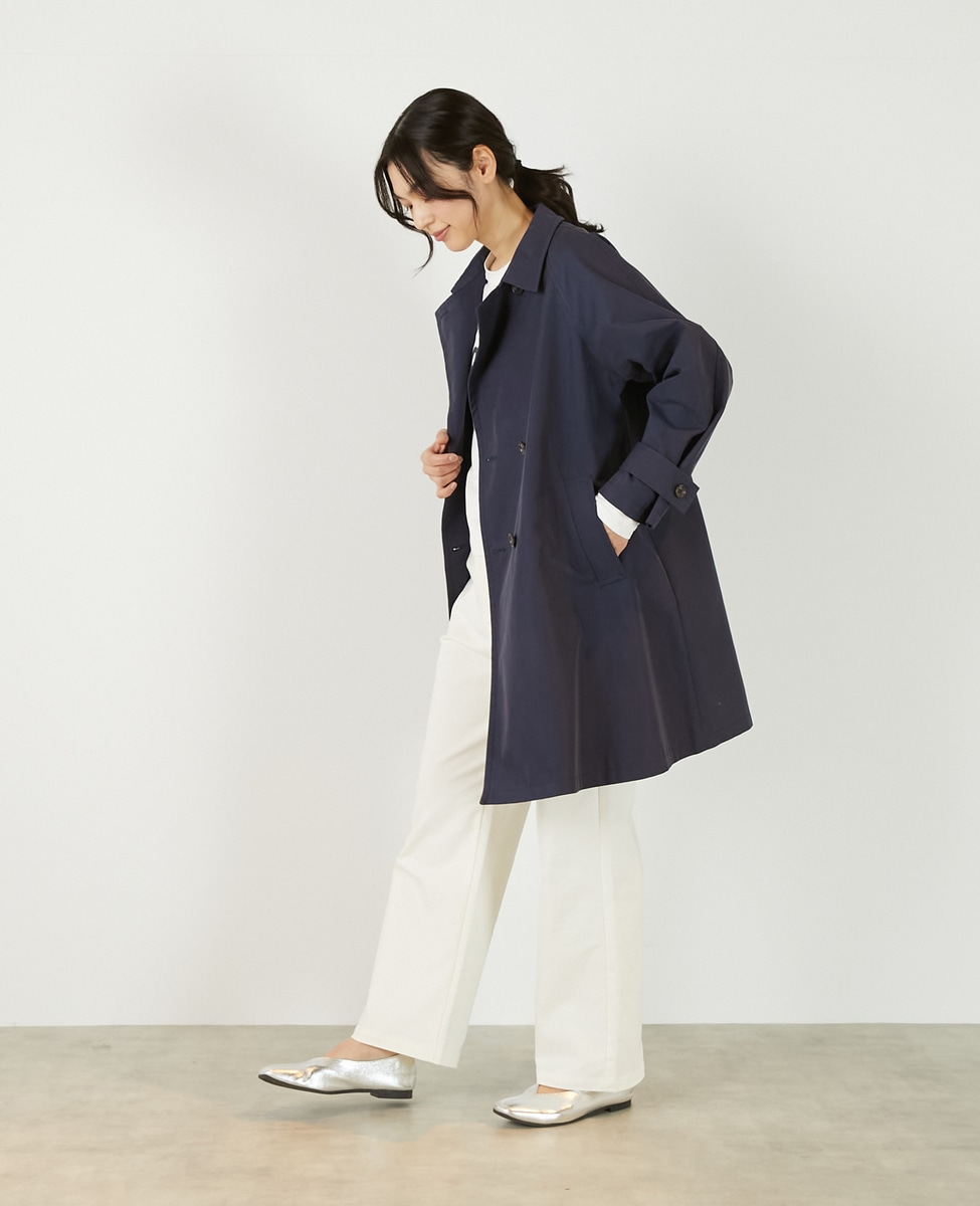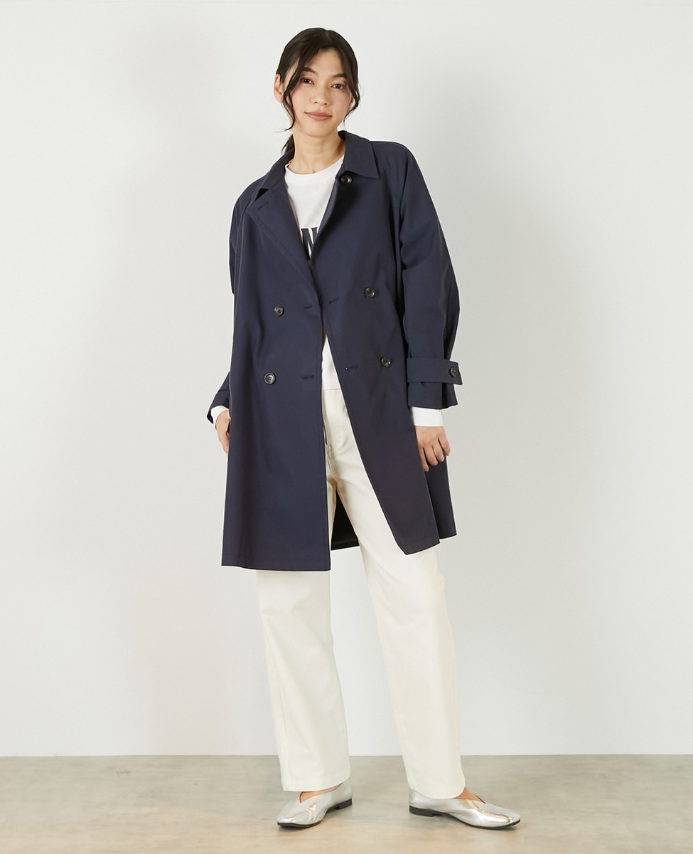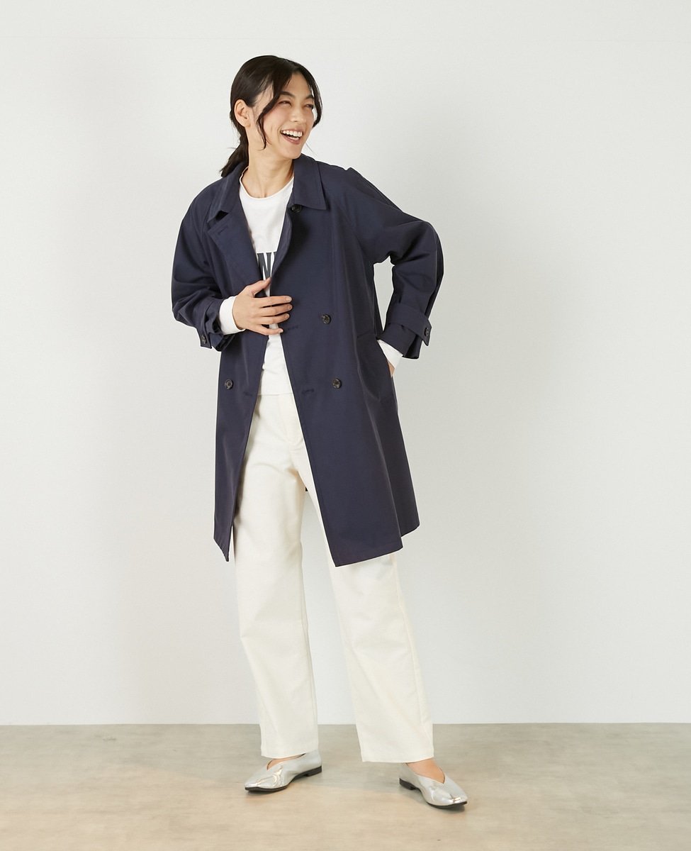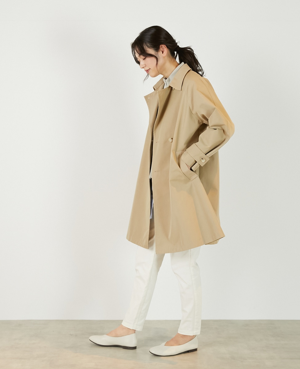 上品でさりげない光沢感のあるコットン×ポリエステルギャバジン素材で作ったトレンチ風のダブルのコート。着こなしやすいミドル丈と裾にむかって広がりのあるテントシルエットでカジュアルにもきれい目にもすっと馴染んでくれる魅力的な1枚です。袖口のタブの向きを変えることでアレンジ可能。総裏仕立て。