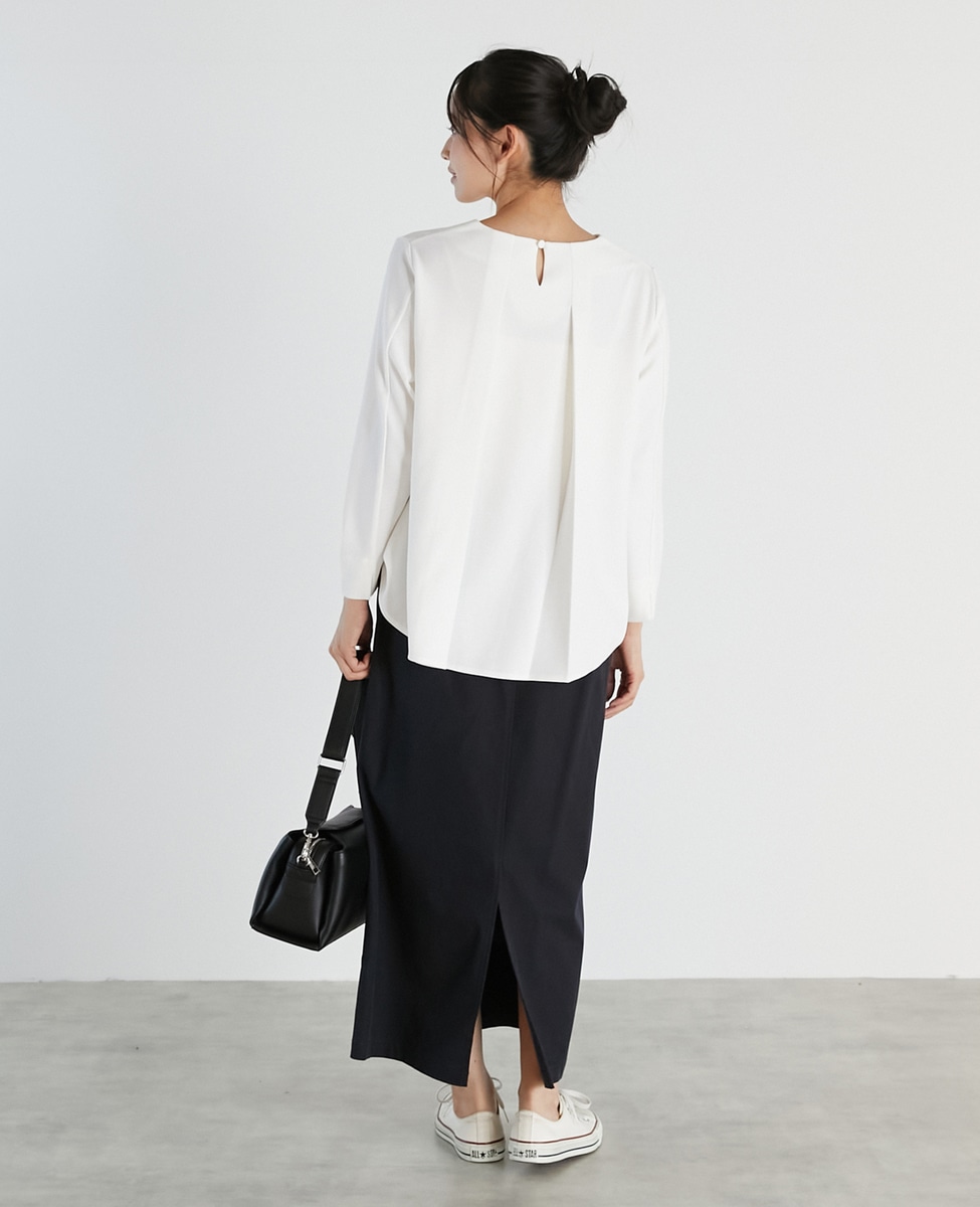 ラウンドネックのシンプルなフロントにバックテールでタックフレアーを施したデザインのカットブラウス。
