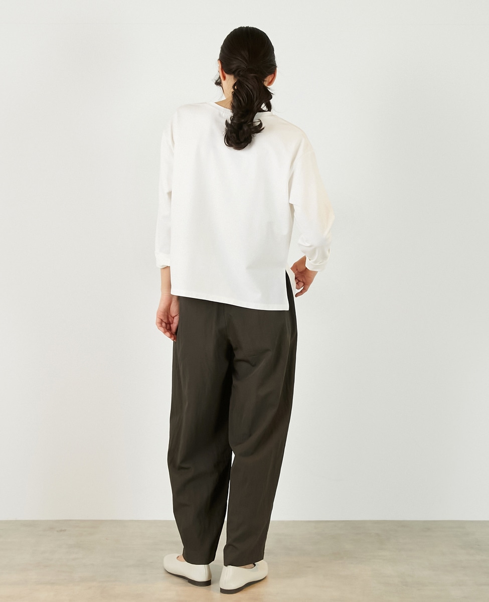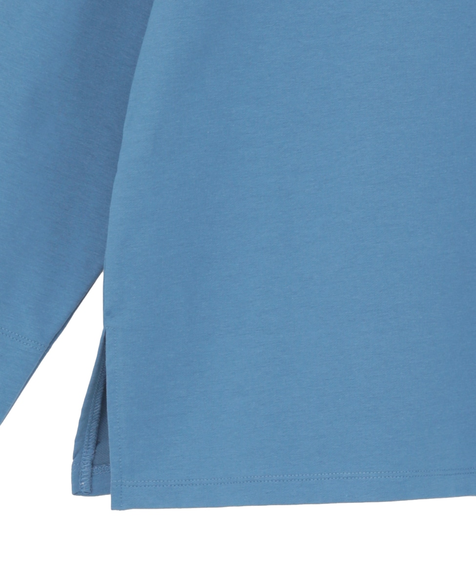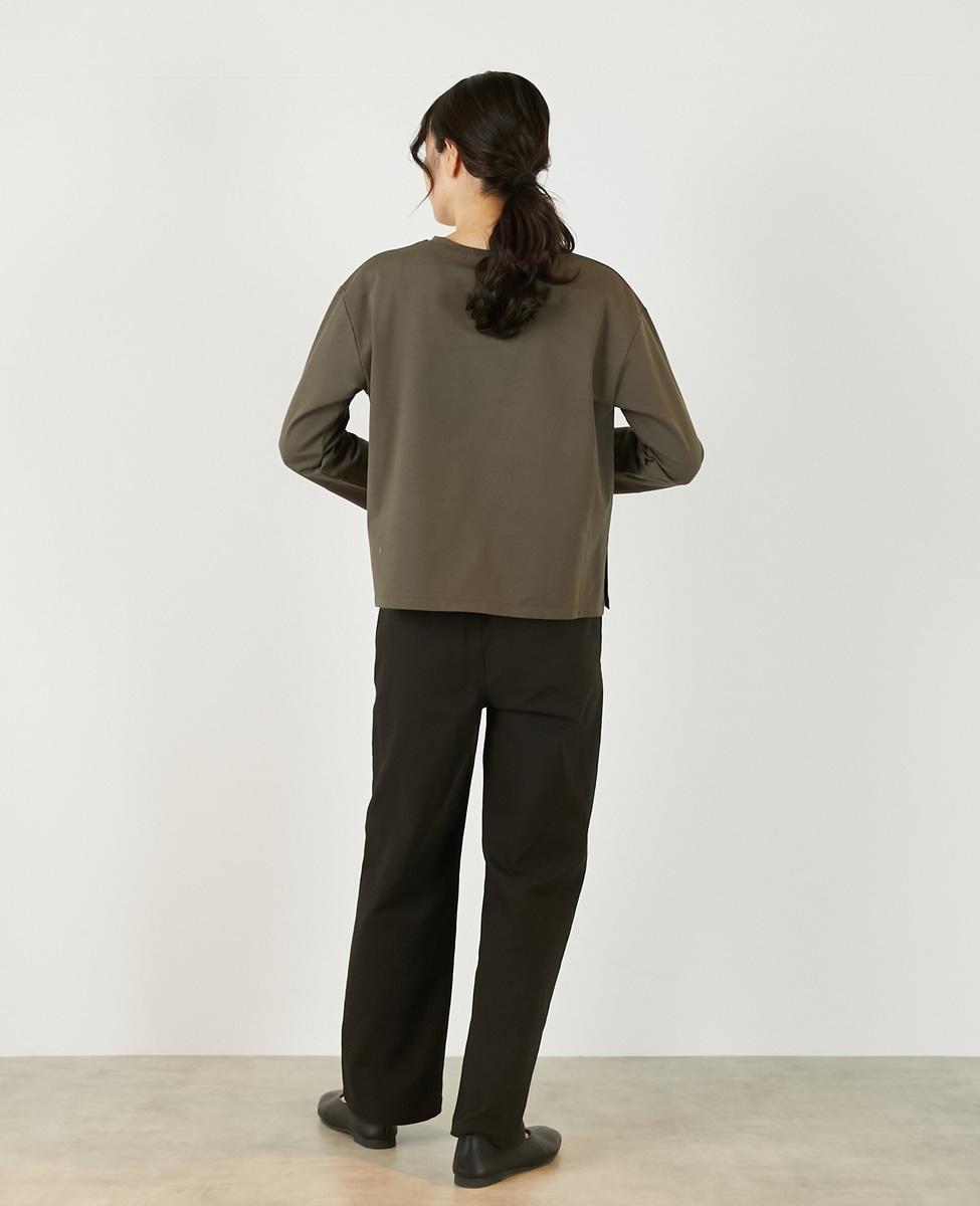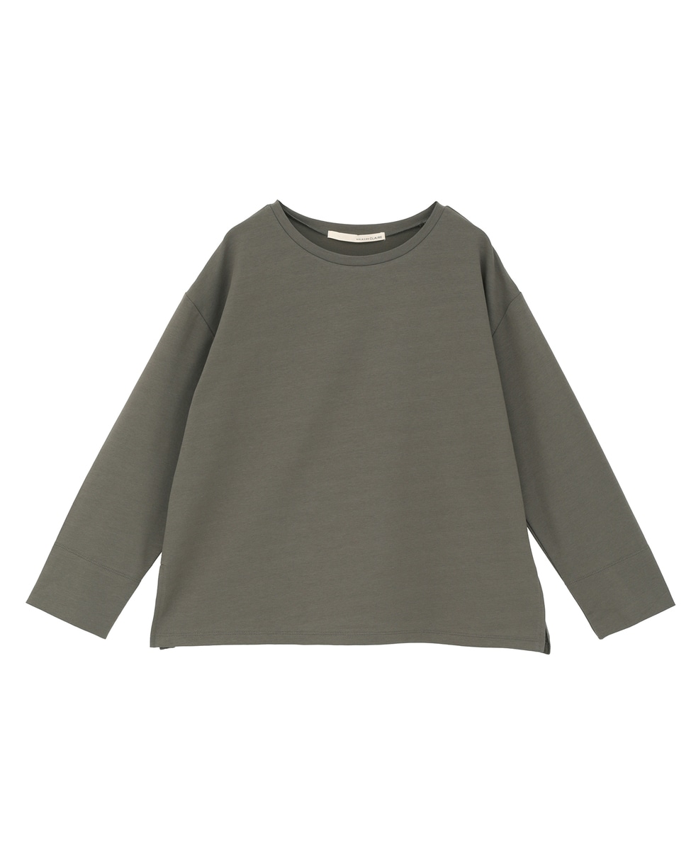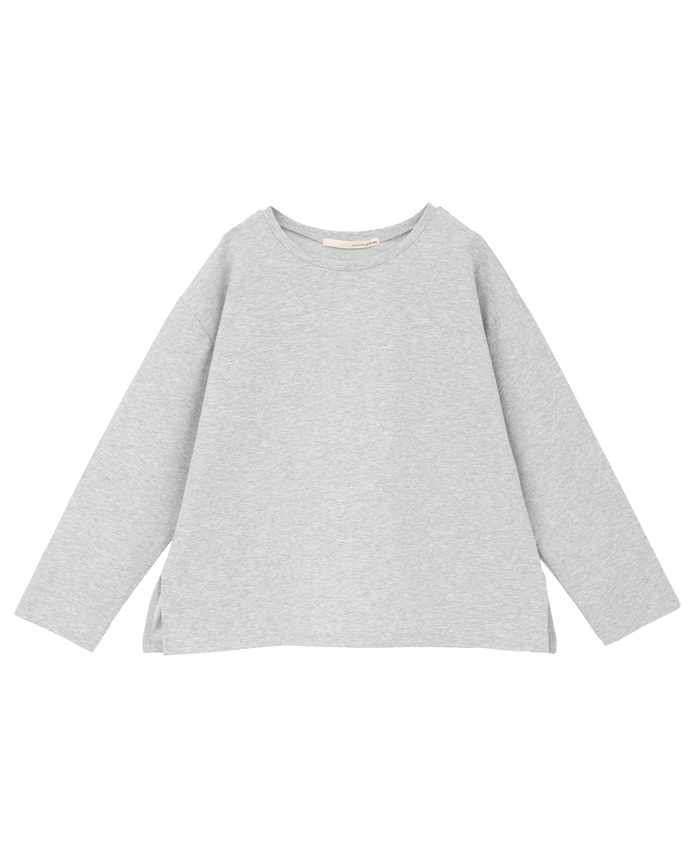 裏毛未満、天竺以上の程よい生地感でベスト合わせやレイヤードインナー合わせに便利な一枚。サイドに深めに入れたスリットがスタイリングし易く、袖口の縫い代深めなので折って着用していただける仕様になっています。