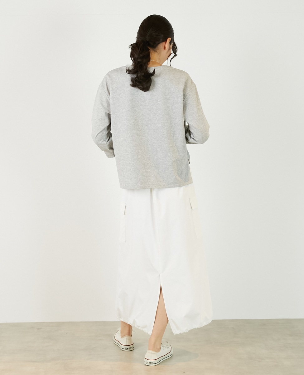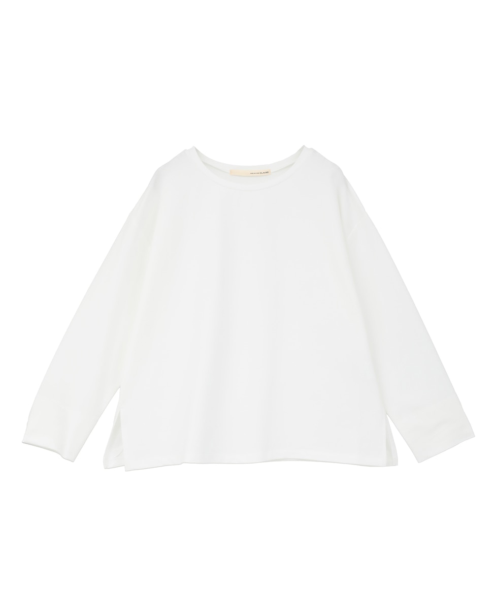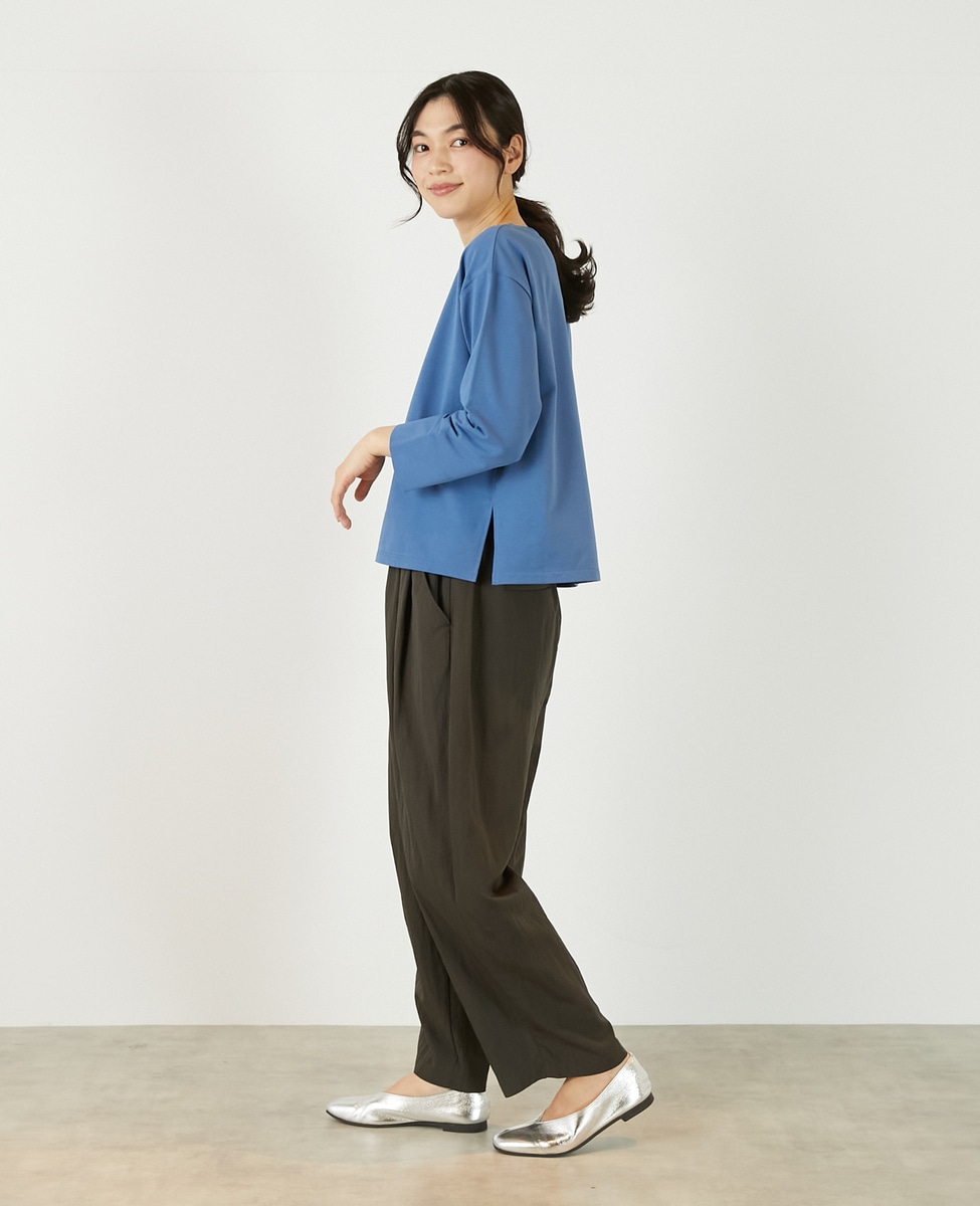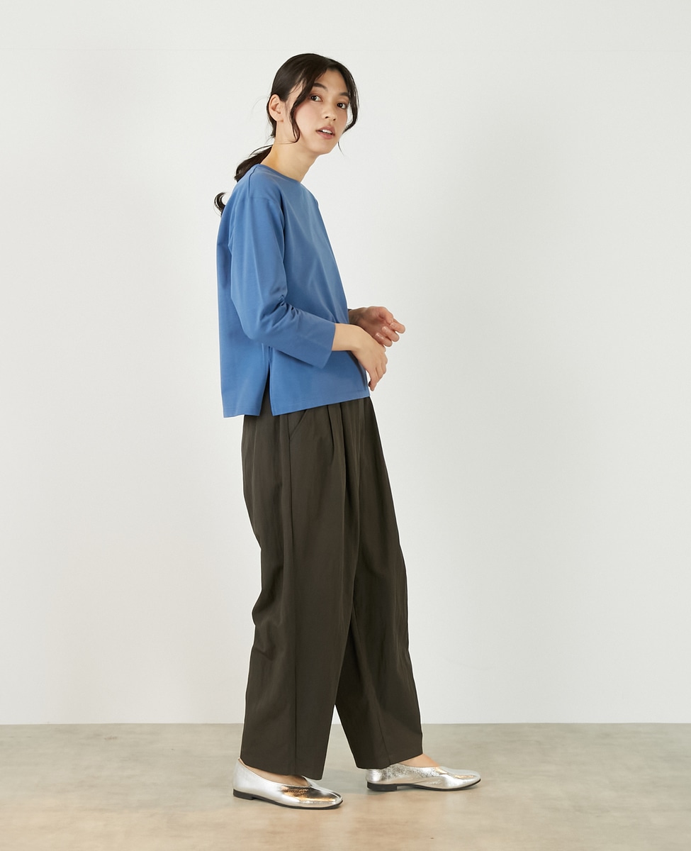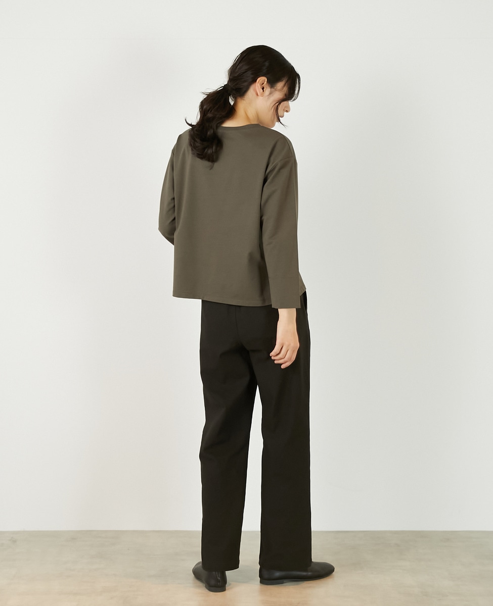 裏毛未満、天竺以上の程よい生地感でベスト合わせやレイヤードインナー合わせに便利な一枚。サイドに深めに入れたスリットがスタイリングし易く、袖口の縫い代深めなので折って着用していただける仕様になっています。