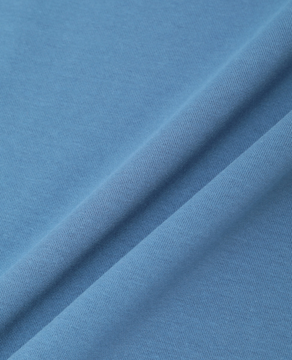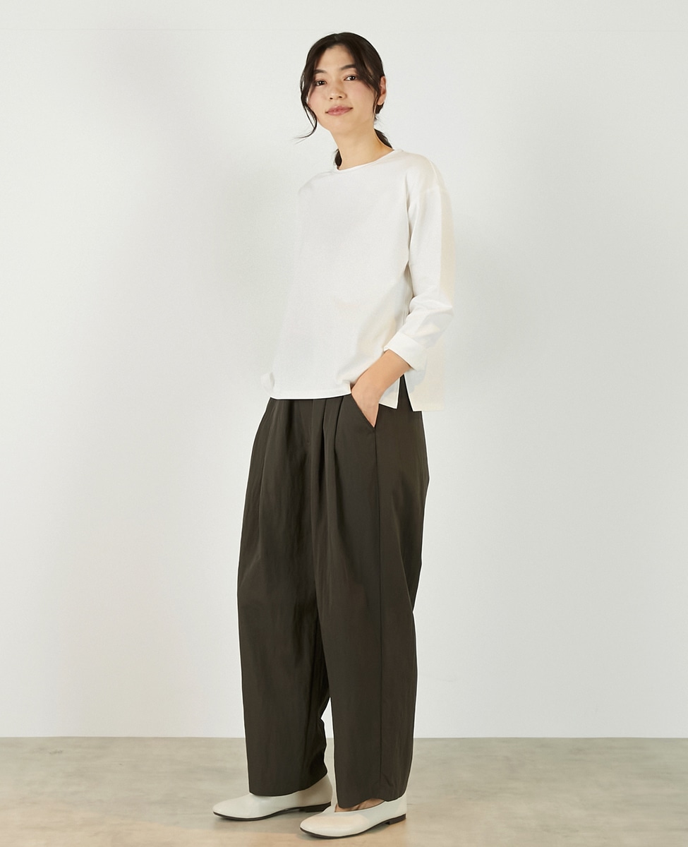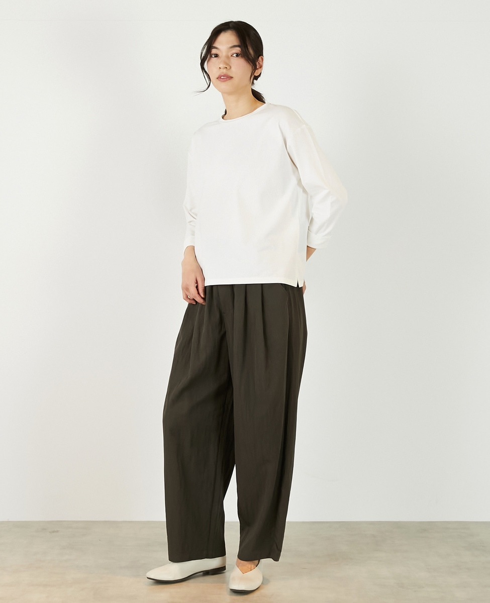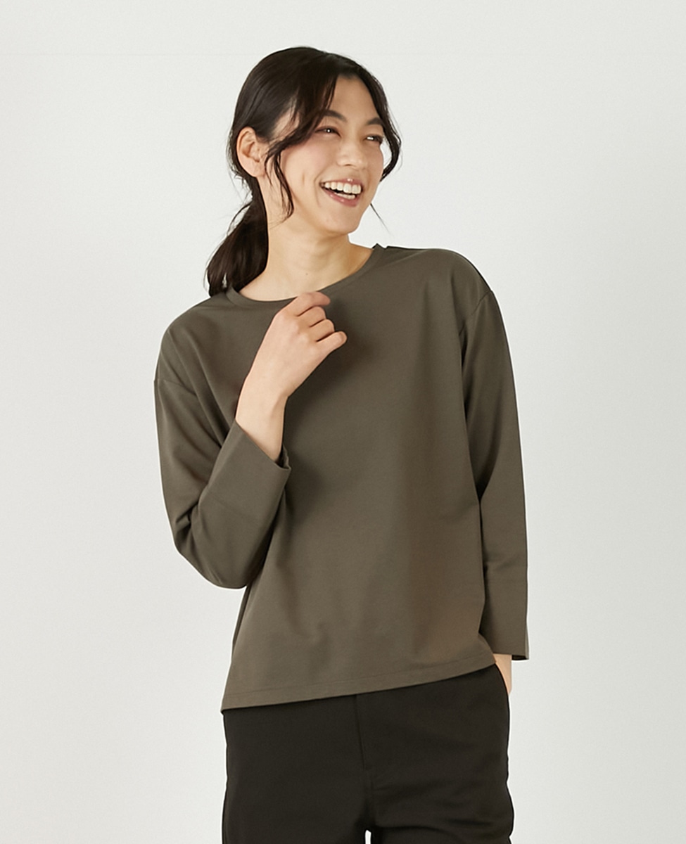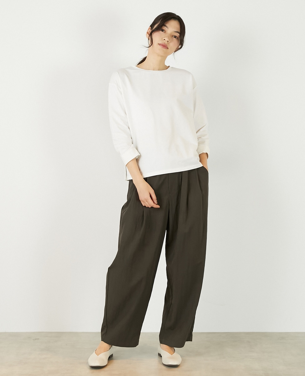裏毛未満、天竺以上の程よい生地感でベスト合わせやレイヤードインナー合わせに便利な一枚。サイドに深めに入れたスリットがスタイリングし易く、袖口の縫い代深めなので折って着用していただける仕様になっています。