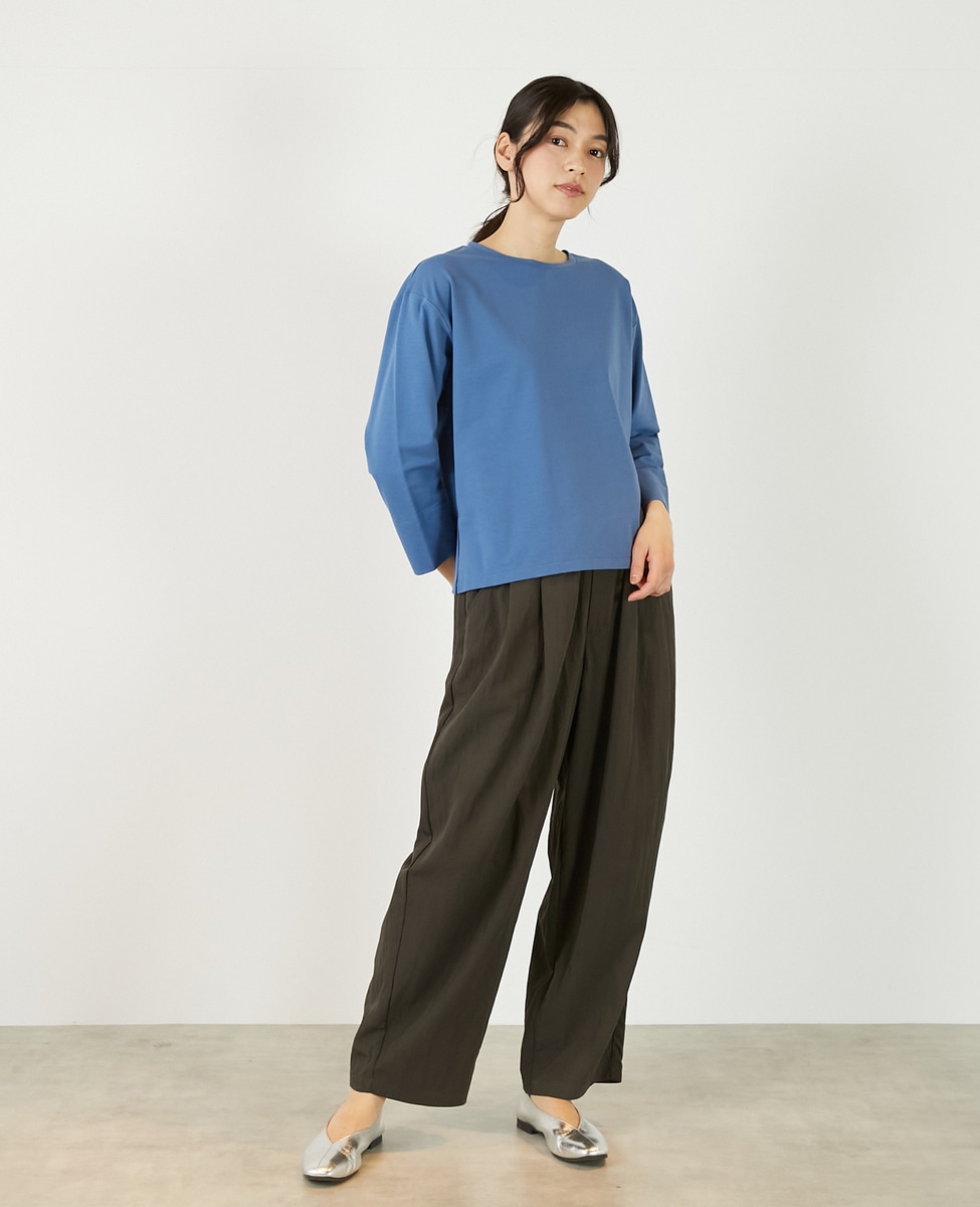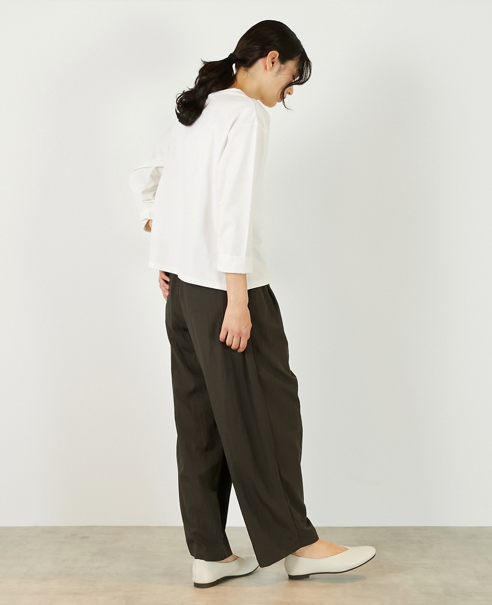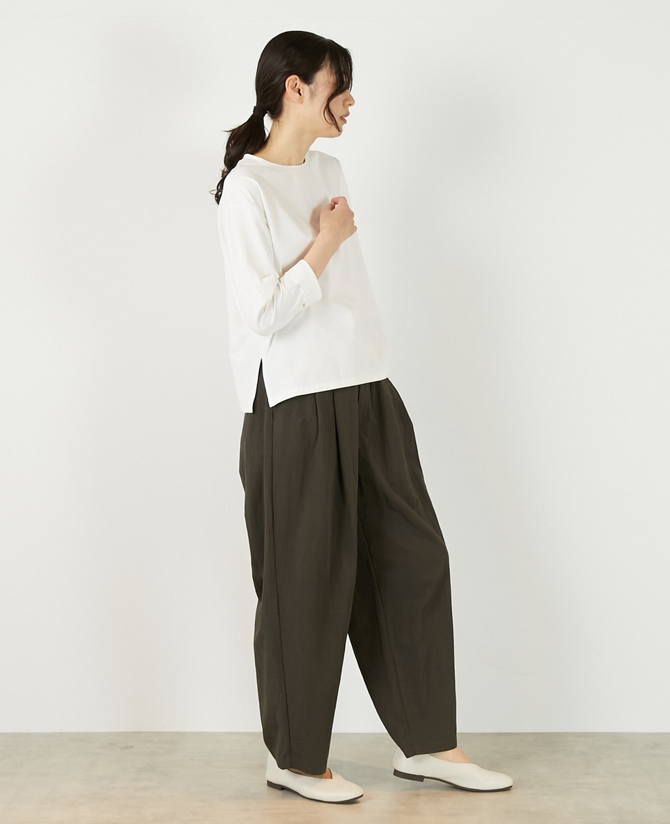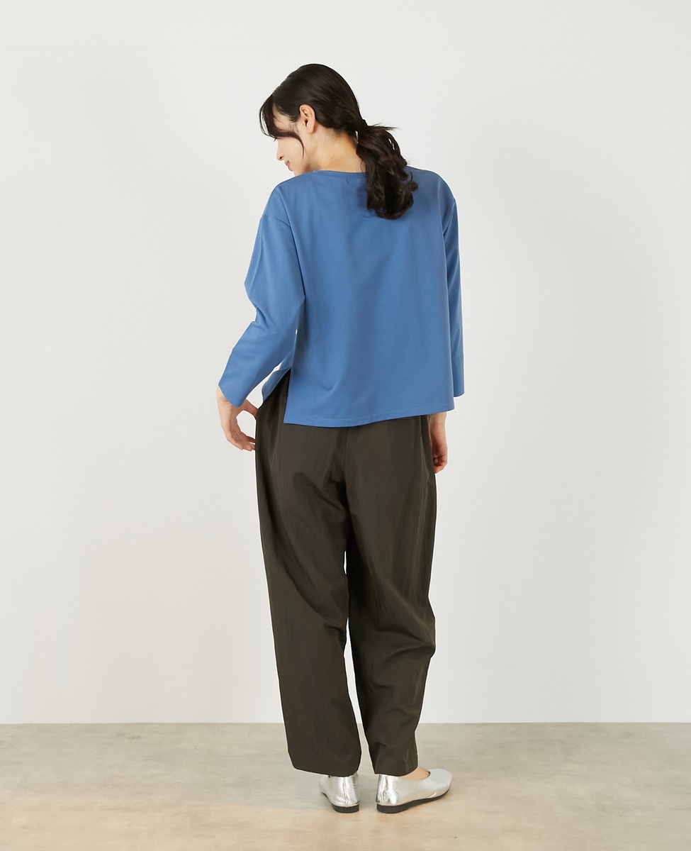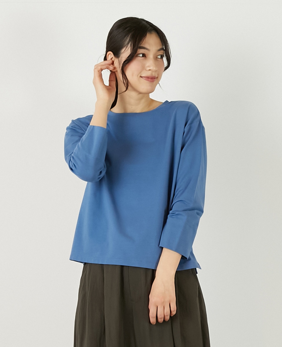 裏毛未満、天竺以上の程よい生地感でベスト合わせやレイヤードインナー合わせに便利な一枚。サイドに深めに入れたスリットがスタイリングし易く、袖口の縫い代深めなので折って着用していただける仕様になっています。