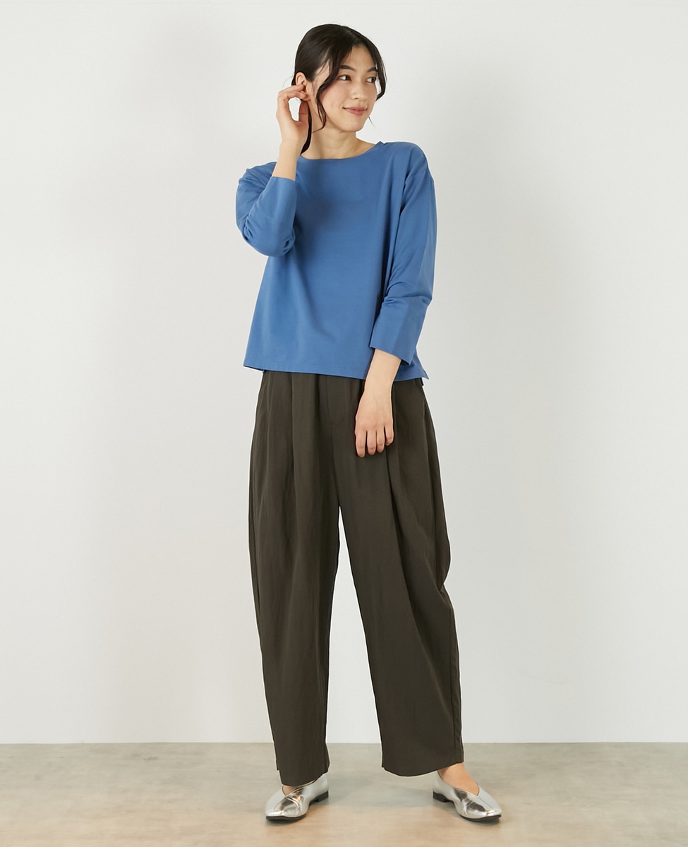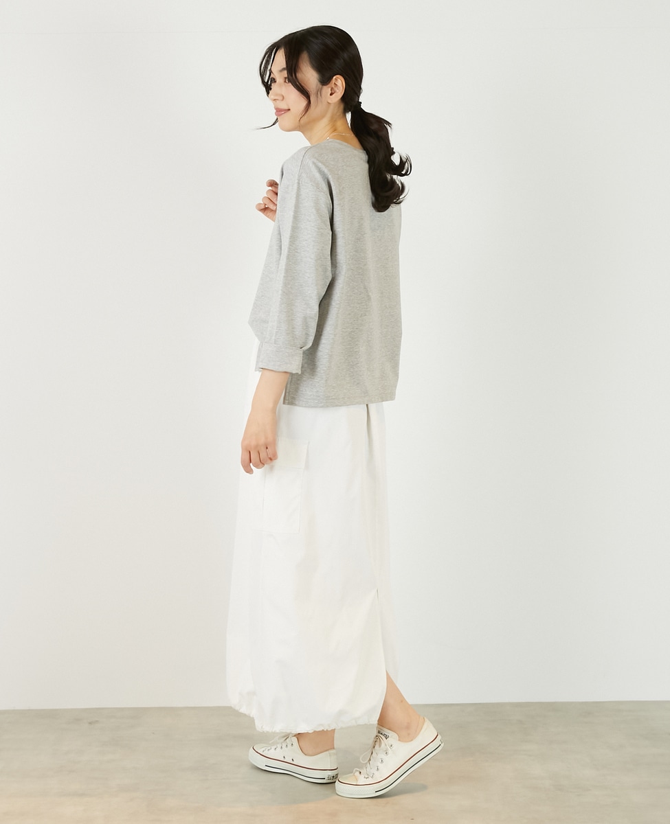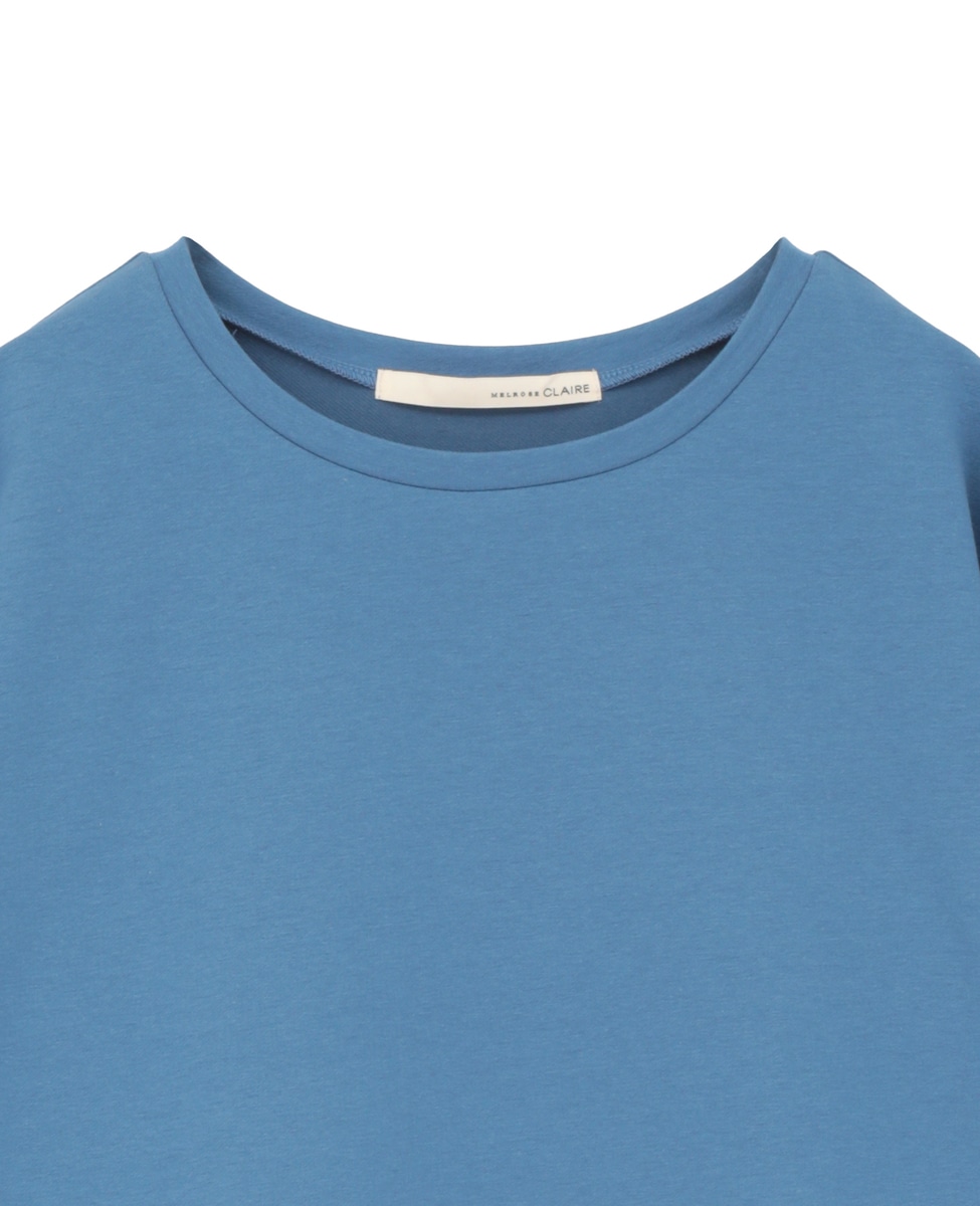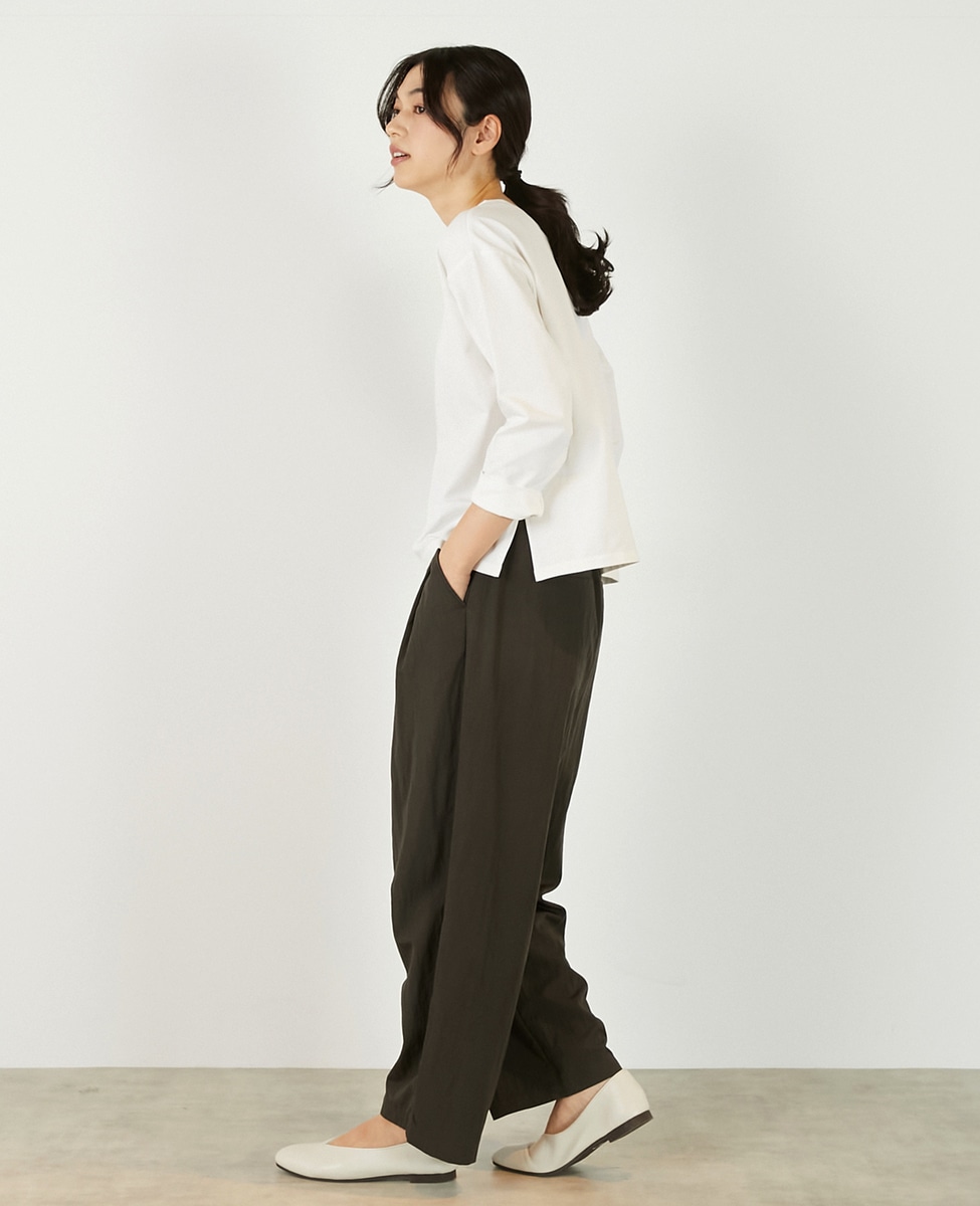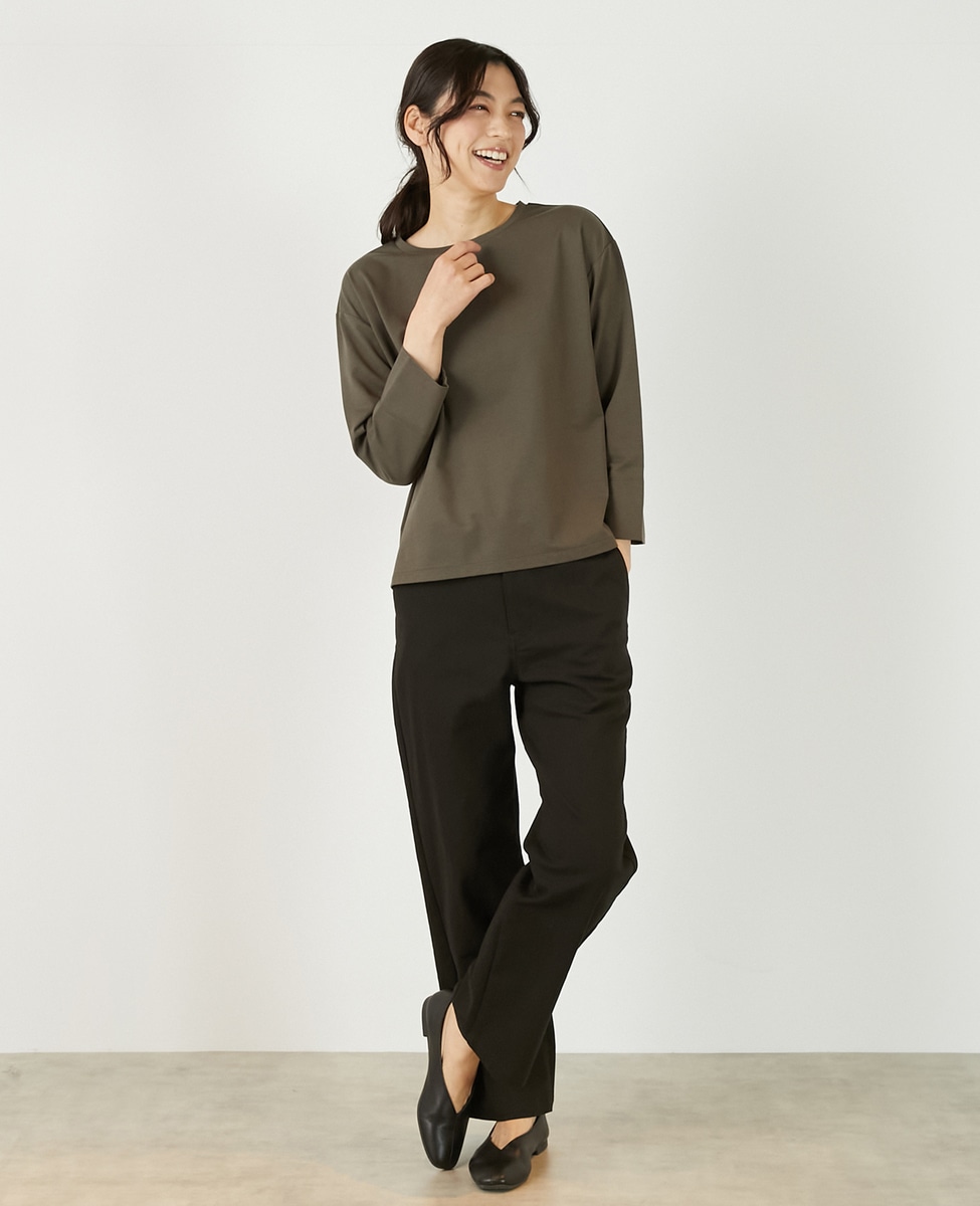 裏毛未満、天竺以上の程よい生地感でベスト合わせやレイヤードインナー合わせに便利な一枚。サイドに深めに入れたスリットがスタイリングし易く、袖口の縫い代深めなので折って着用していただける仕様になっています。