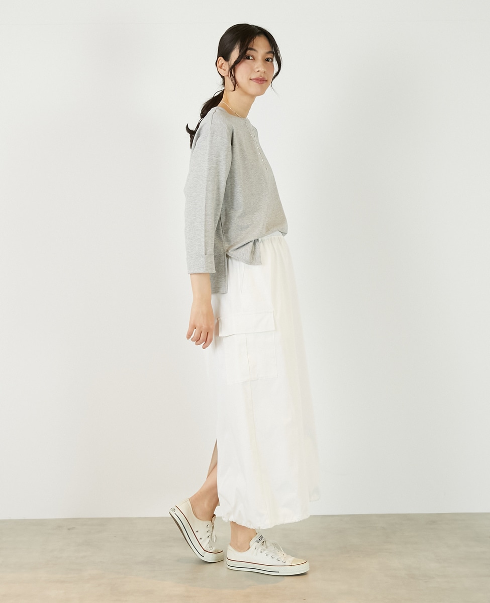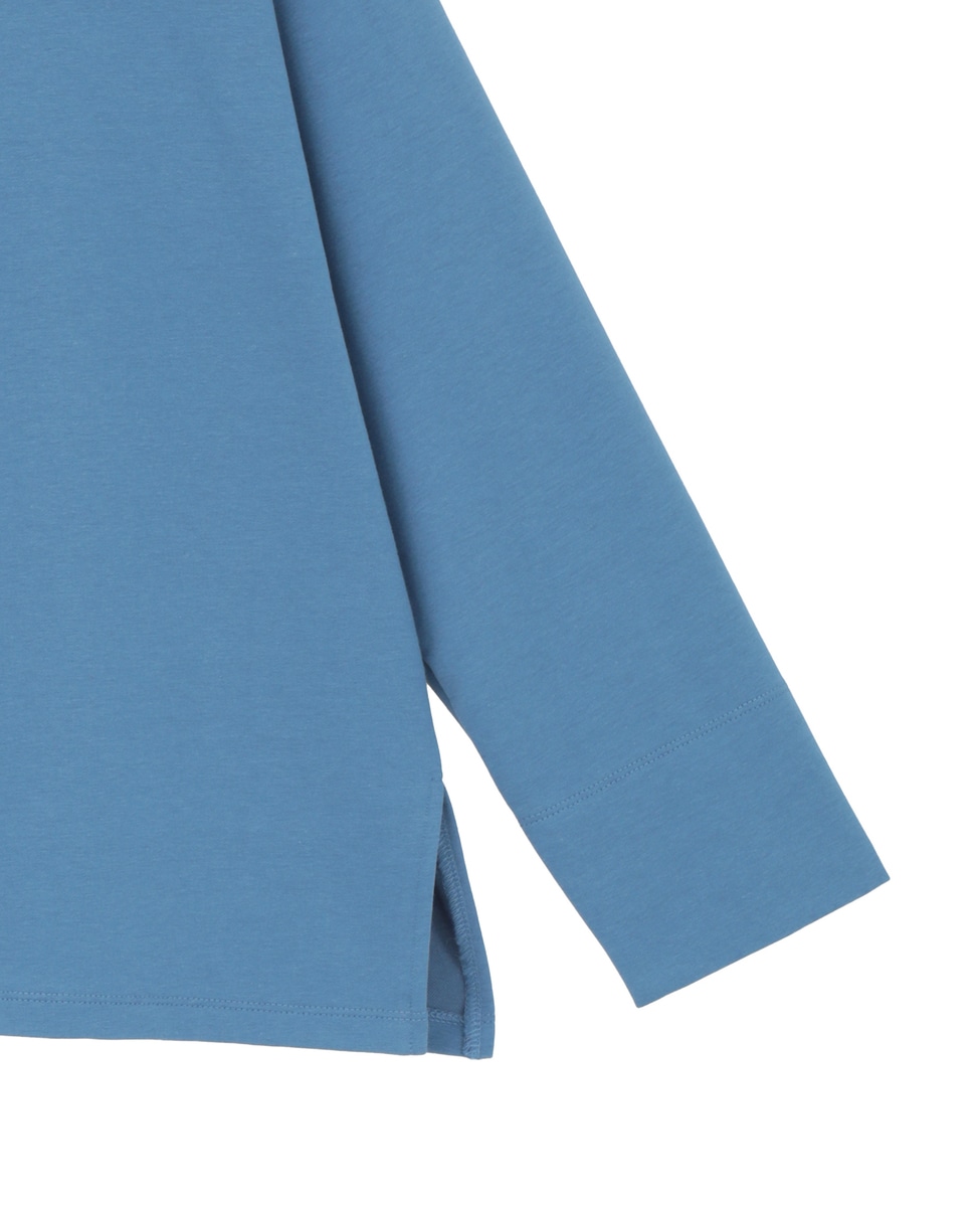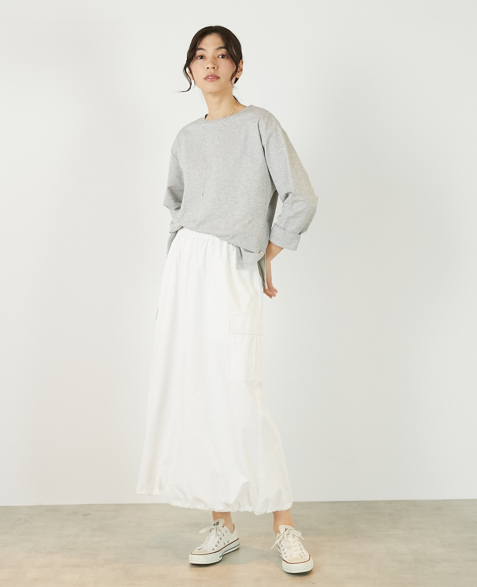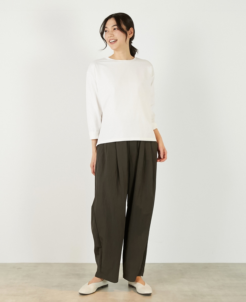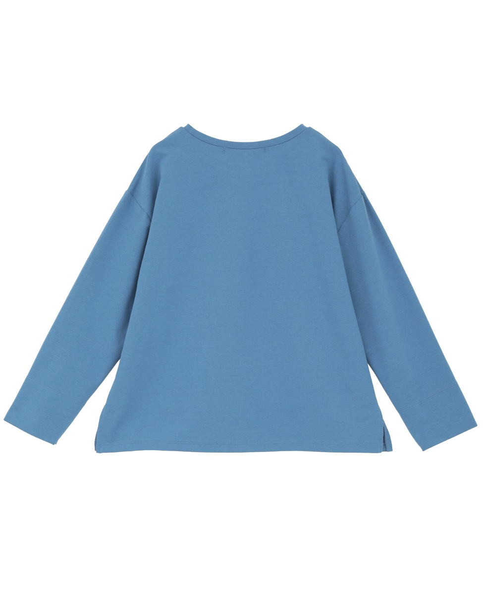 裏毛未満、天竺以上の程よい生地感でベスト合わせやレイヤードインナー合わせに便利な一枚。サイドに深めに入れたスリットがスタイリングし易く、袖口の縫い代深めなので折って着用していただける仕様になっています。
