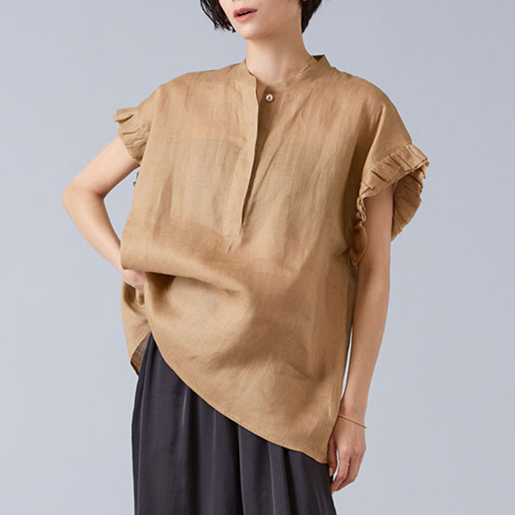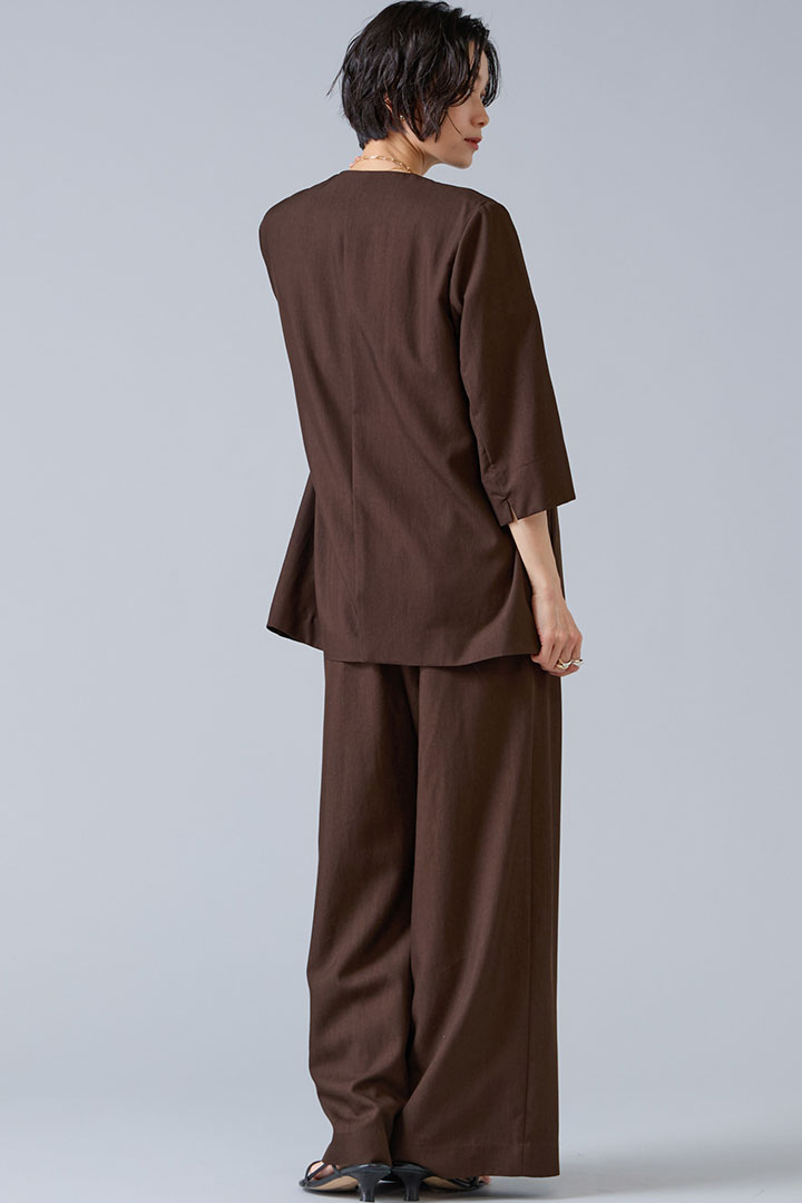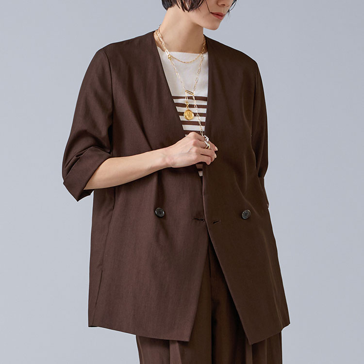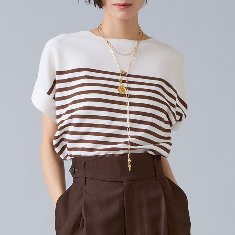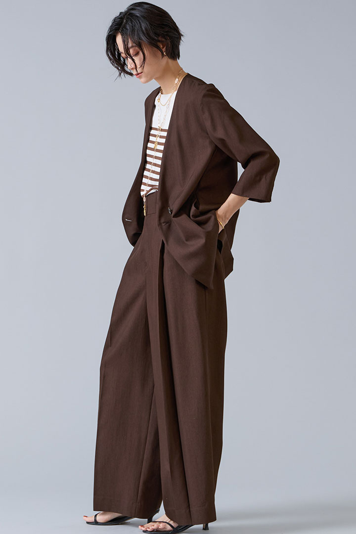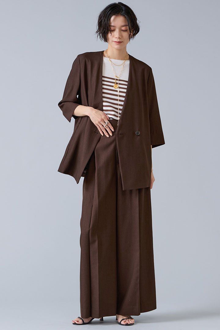 落ち感とシャリっとした清涼感のあるタッチの生地は、きちんと感がありながら抜け感を演出。 カラートーンを揃えたボーダーをインナーにしてカチッとしすぎずトレンド感をプラス。