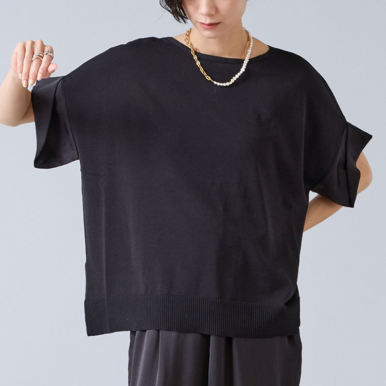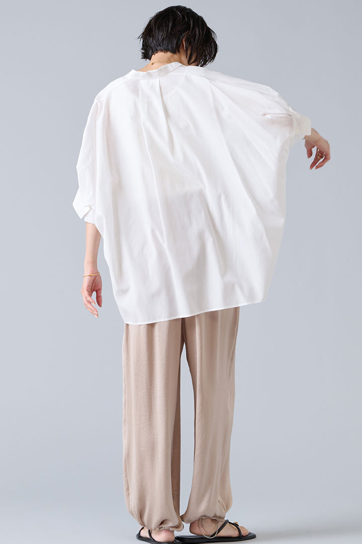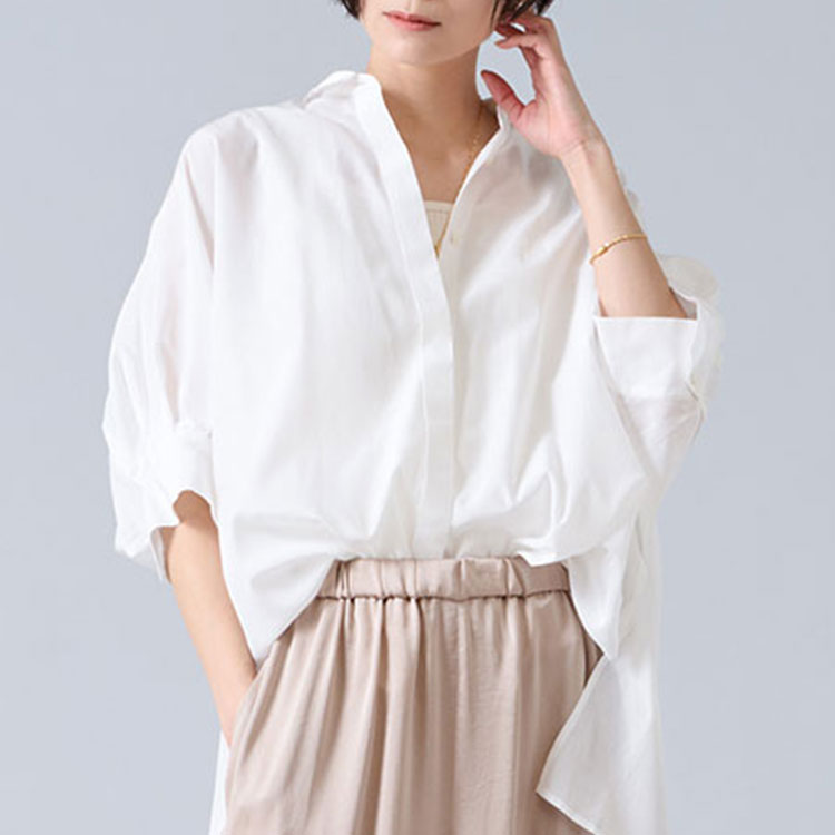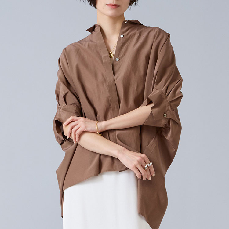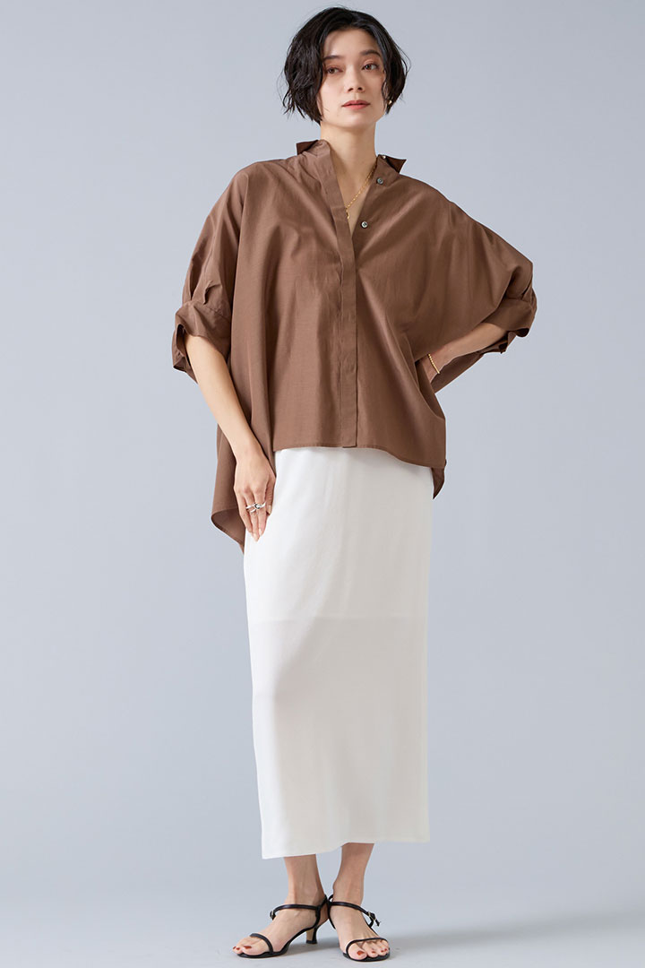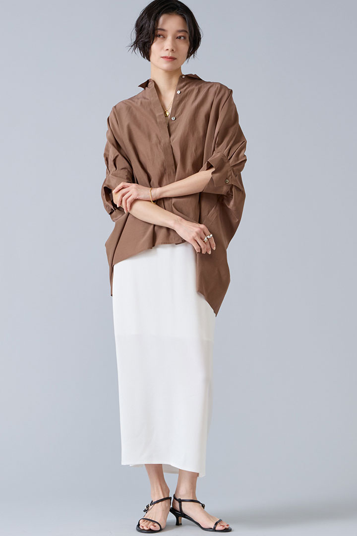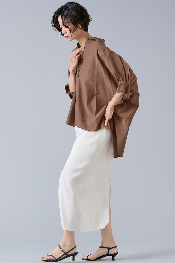 ボクシーラインが特徴のドルマンスリーブシャツ。素材感やシルエットにこだわった1着は、重ねるだけで今季らしいバランスを演出してくれます。ストレッチの効いたバックサテンIラインスカートに合わせて、楽なのに女らしいスタイルに。