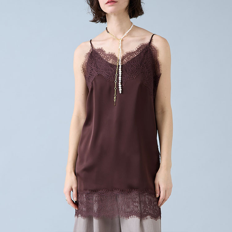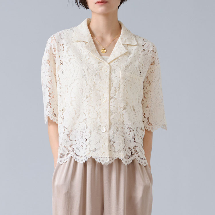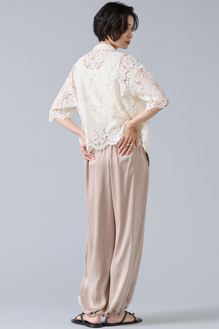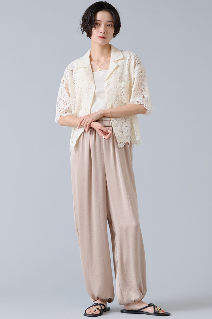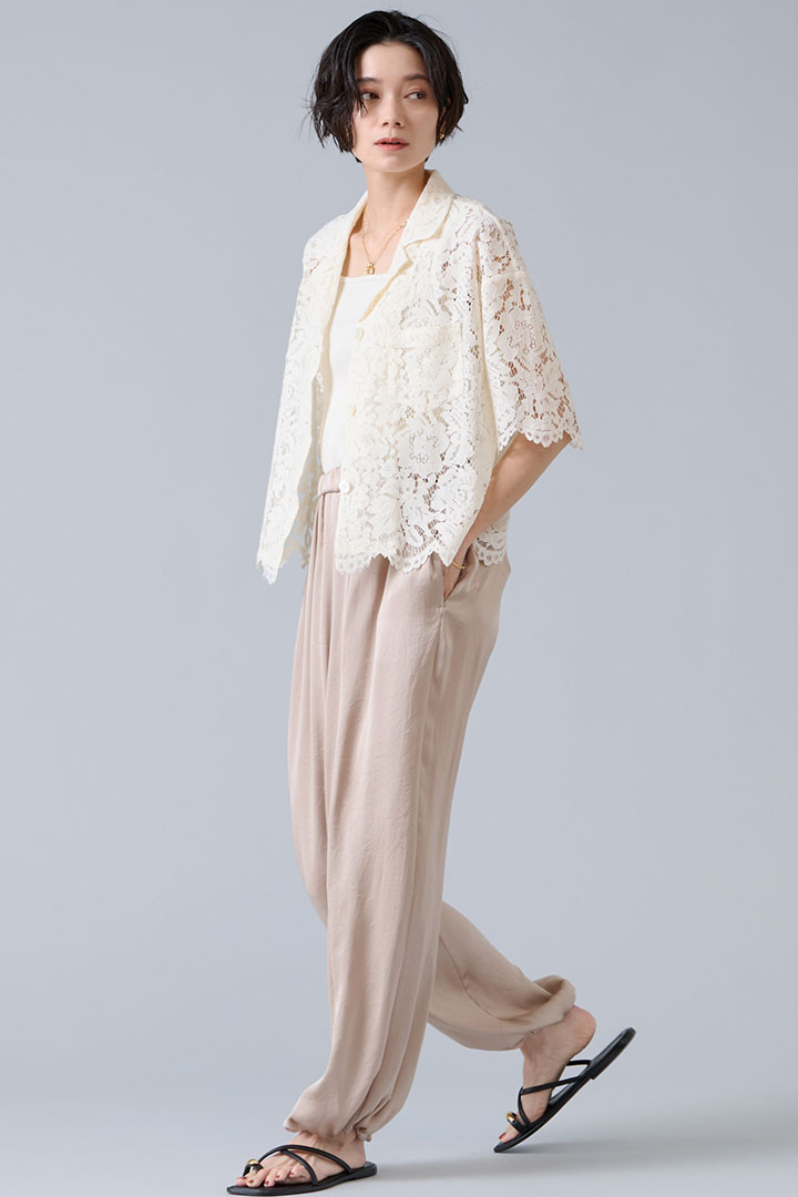 レースのシャツはフラワーモチーフながら甘すぎない高級感があるのでコーデに取り入れやすです。落ち感のあるサテンパンツに合わせて動きのあるフォルムが今季の気分。タンクをインナーにヘルシーな肌みせで大人のスタイルにこなれ感をプラスしてくれます。