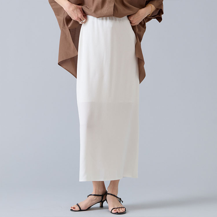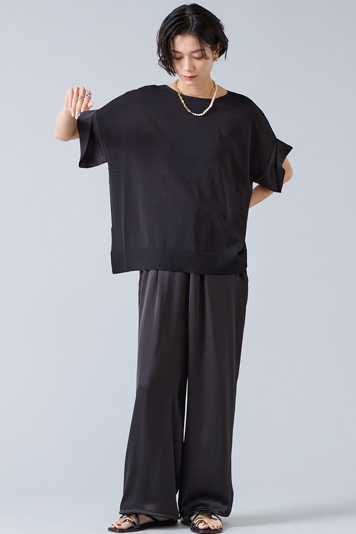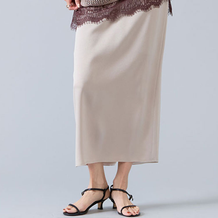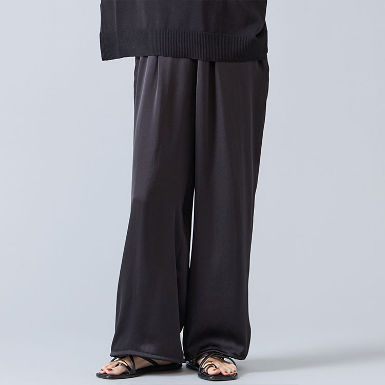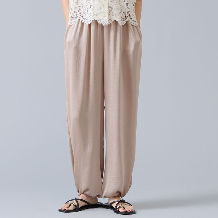 リエス人気のサテンシリーズ。ボトムスがNEWシルエットで登場。薄手のサテンならではのしなやかな光沢と美しいドレープ性があり、薄くても透けにくくシワになりにくい、手洗い可能なイージーケア素材で汗ばむ時期にもピッタリ。