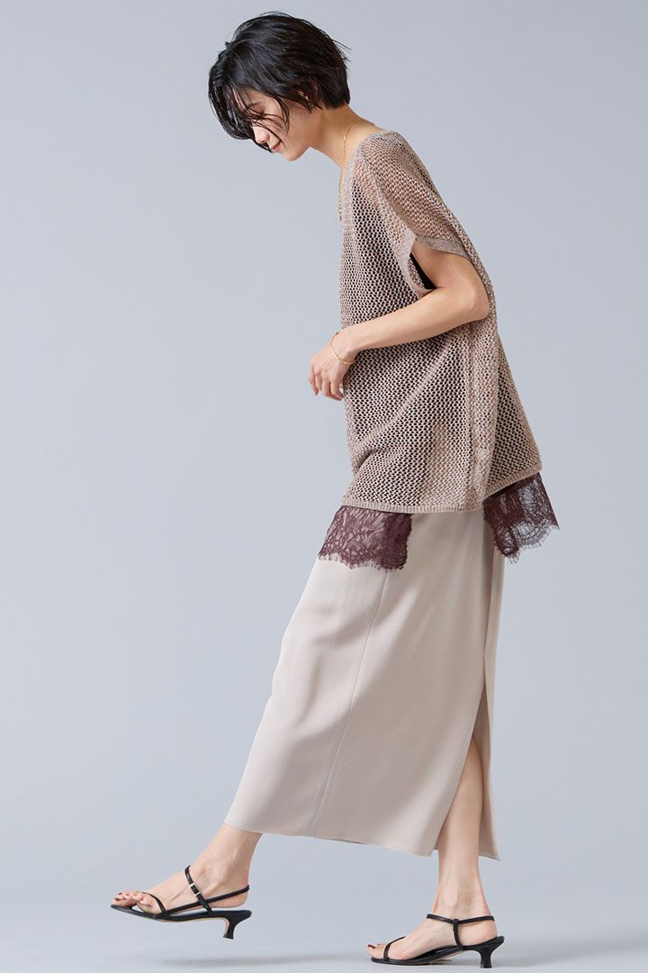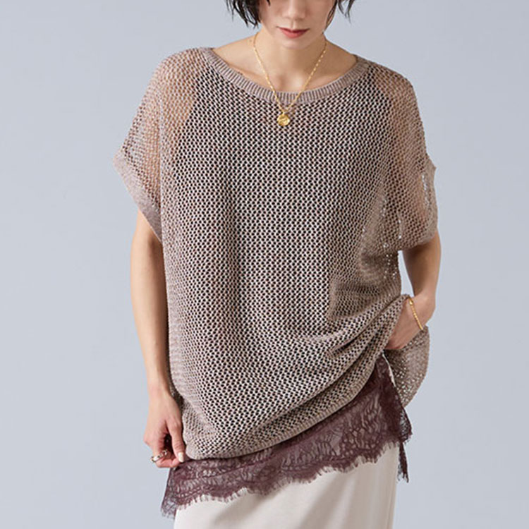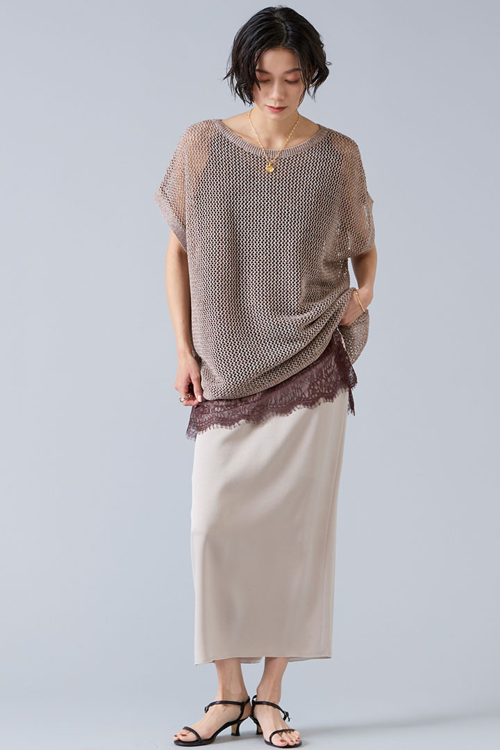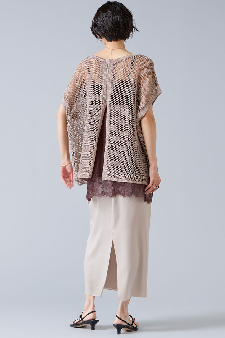 ゆるりとしたシルエットが魅力のメッシュオーバープルオーバーは着るだけで印象が決まるデザイントップス。 光沢のあるレースキャミをインナーに華やぎを添え、きちんと感とトレンド感の両立を叶えます。インナー次第で様々なコーディネートが楽しめます。