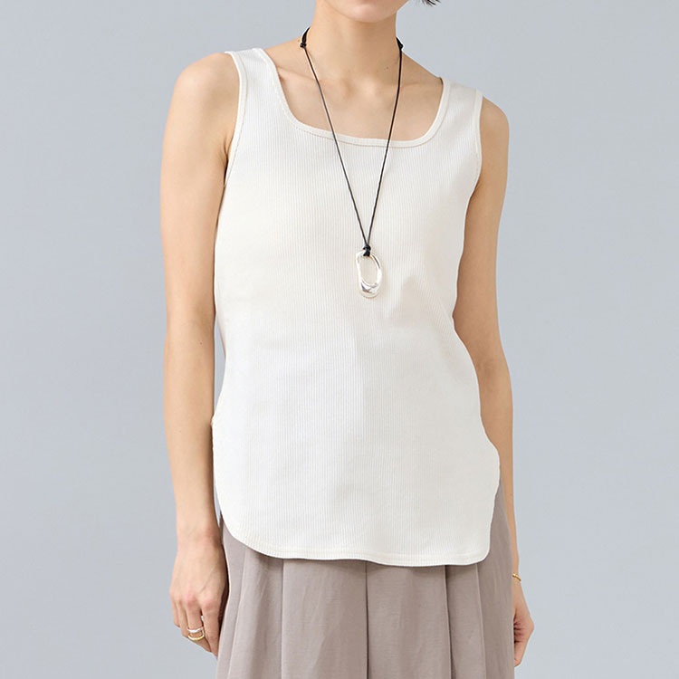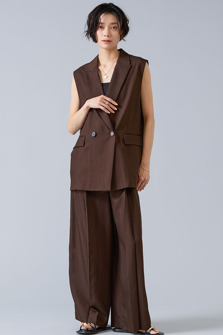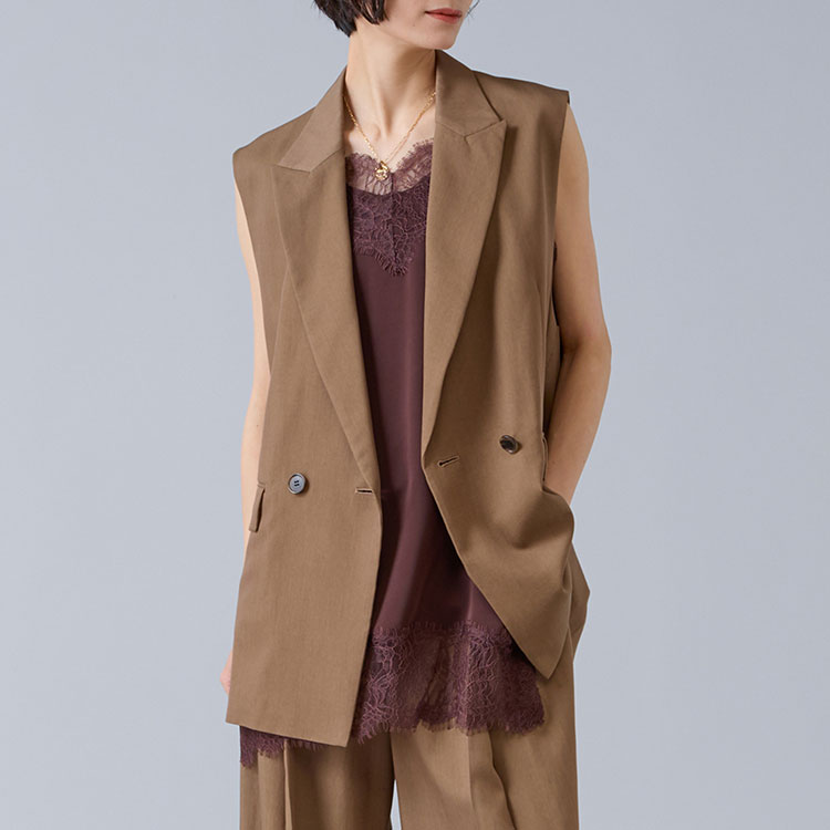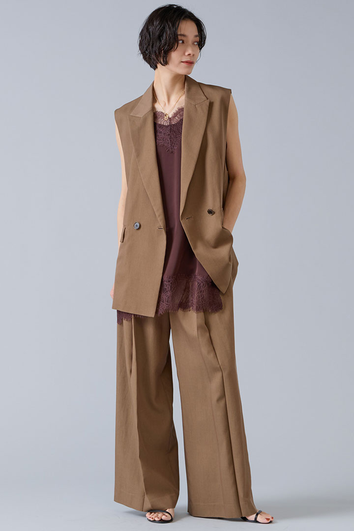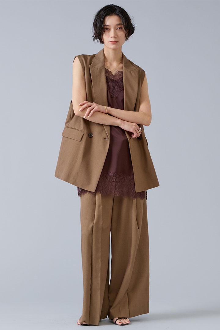 すぐにおしゃれコーデにしてくれるジレのセットアップ。インナーにレースキャミを忍ばせて、シンプルな着こなしも一気に今季顔に。