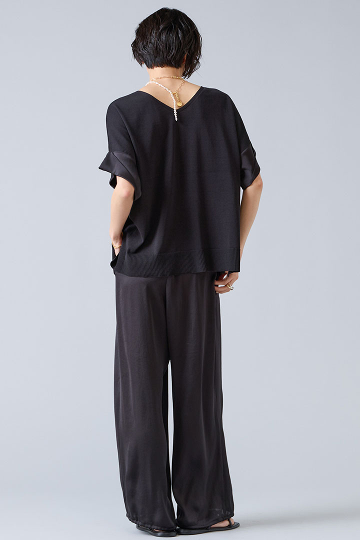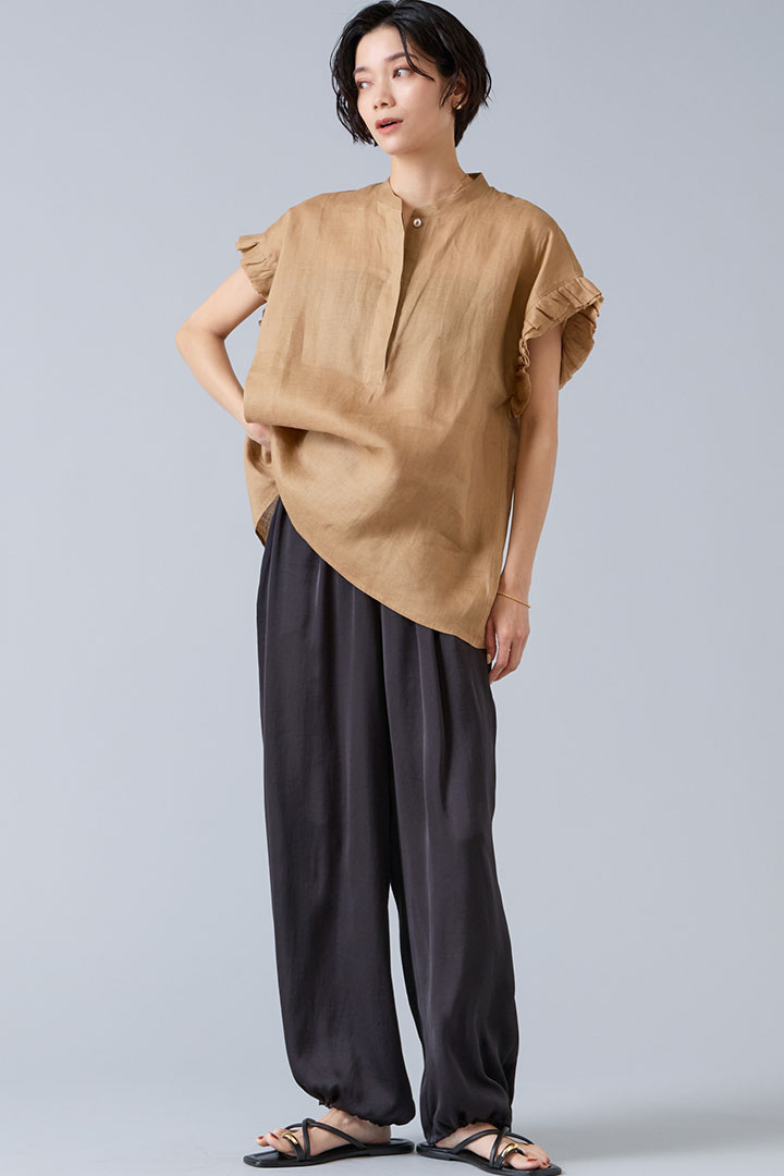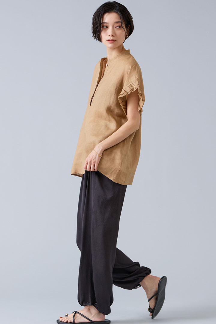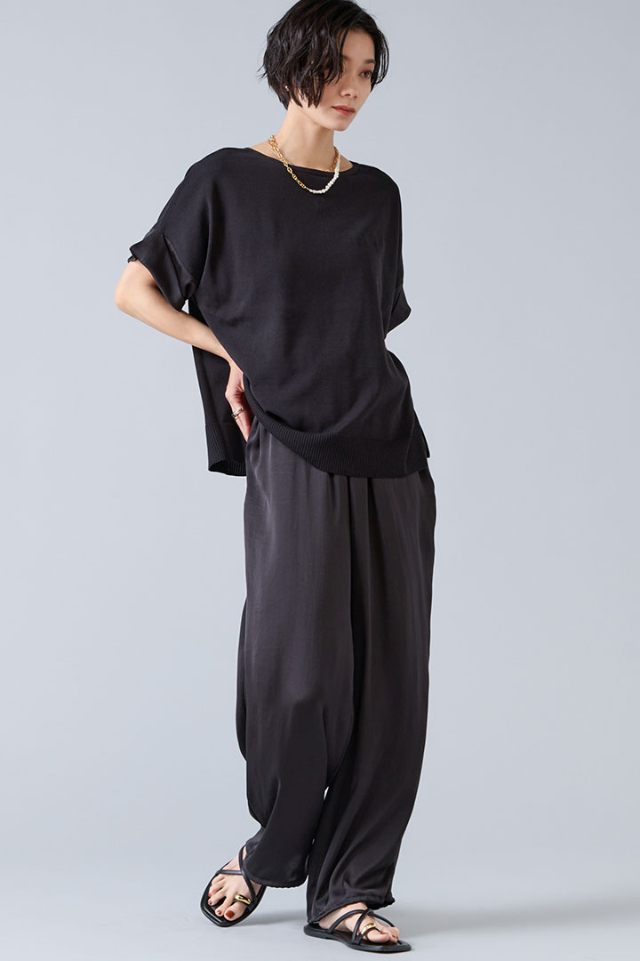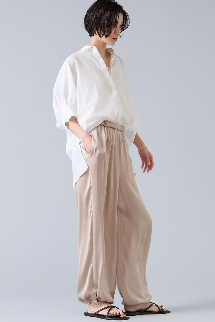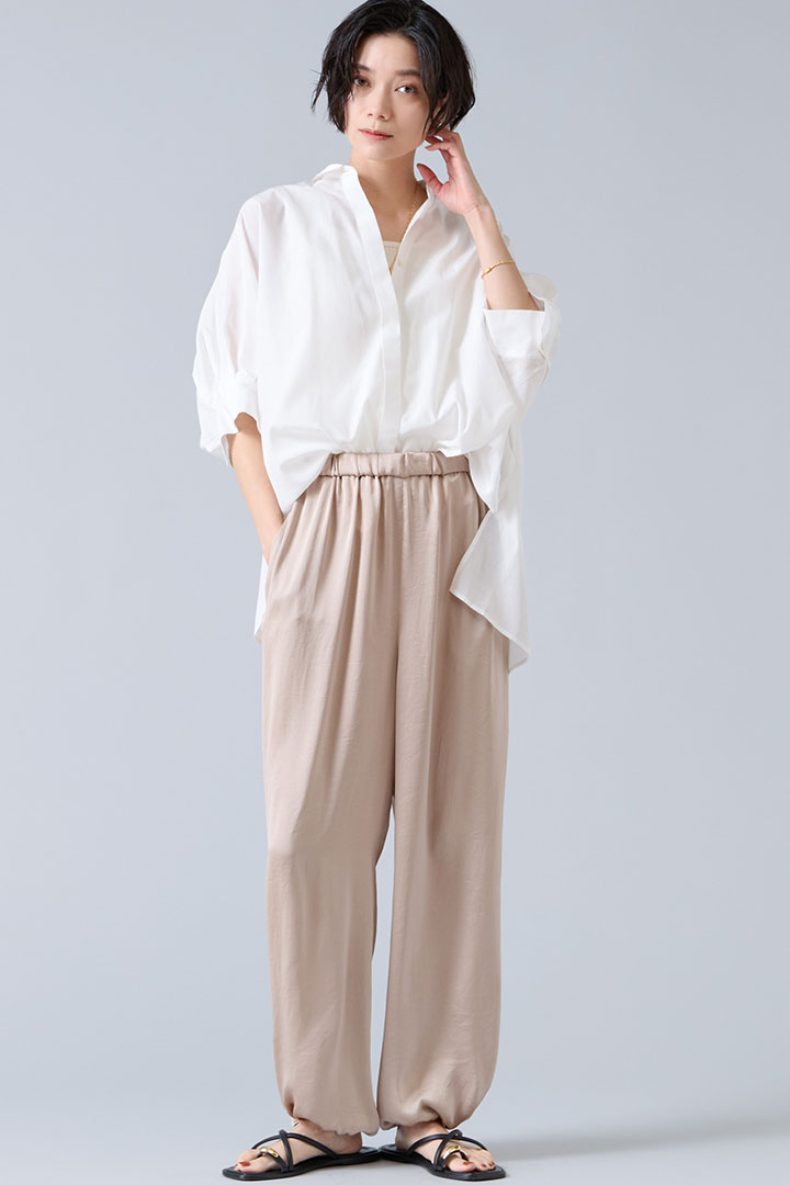 大人気ブラウスには、裾が絞れる今年らしいサテンの2wayイージーパンツを合わせて大人リラックスコーデに。毎日のコーデにひとさじの“トレンド”を加えて褒められスタイルに。