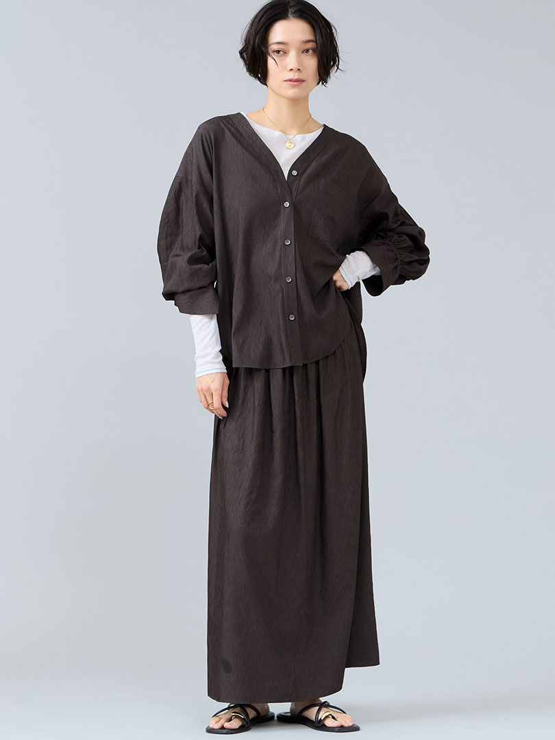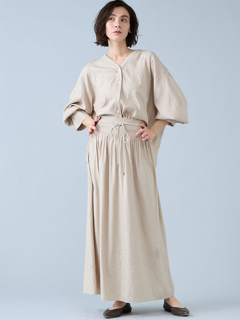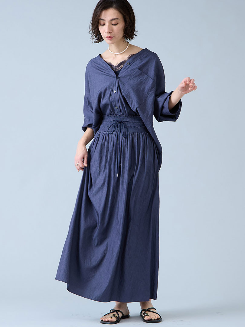 落ち感のある素材感&たっぷりのギャザーで大人気のセットアップ。 適度な縦シボ感が軽やかな素材で、抜け感のある印象を演出します。 デニム見えのネイビーは特に人気。首回りスッキリ&縦のラインが目立つスカートで素敵に見えます。さらりとした肌触りで着心地も快適&ご自宅で手洗いできるイージーケアなので汗ばむ時期にも重宝。