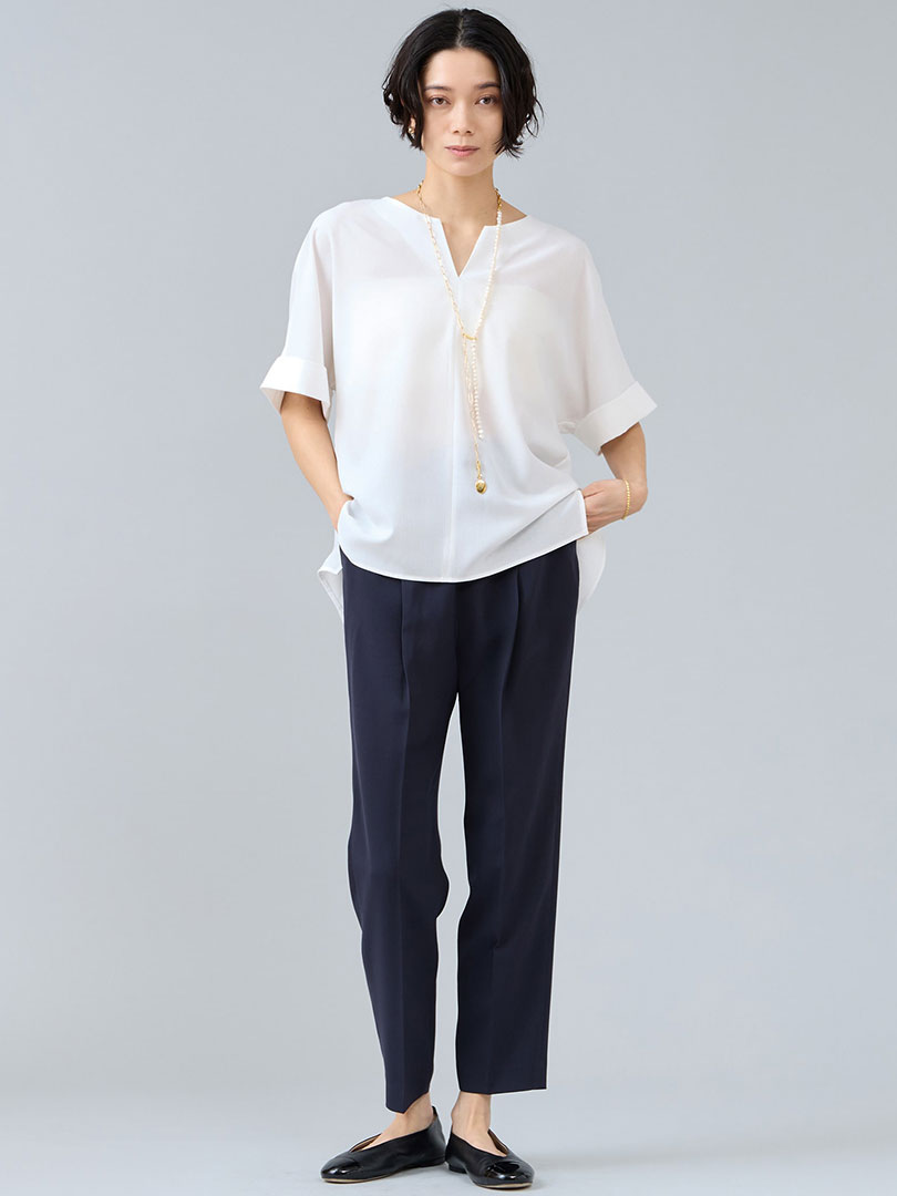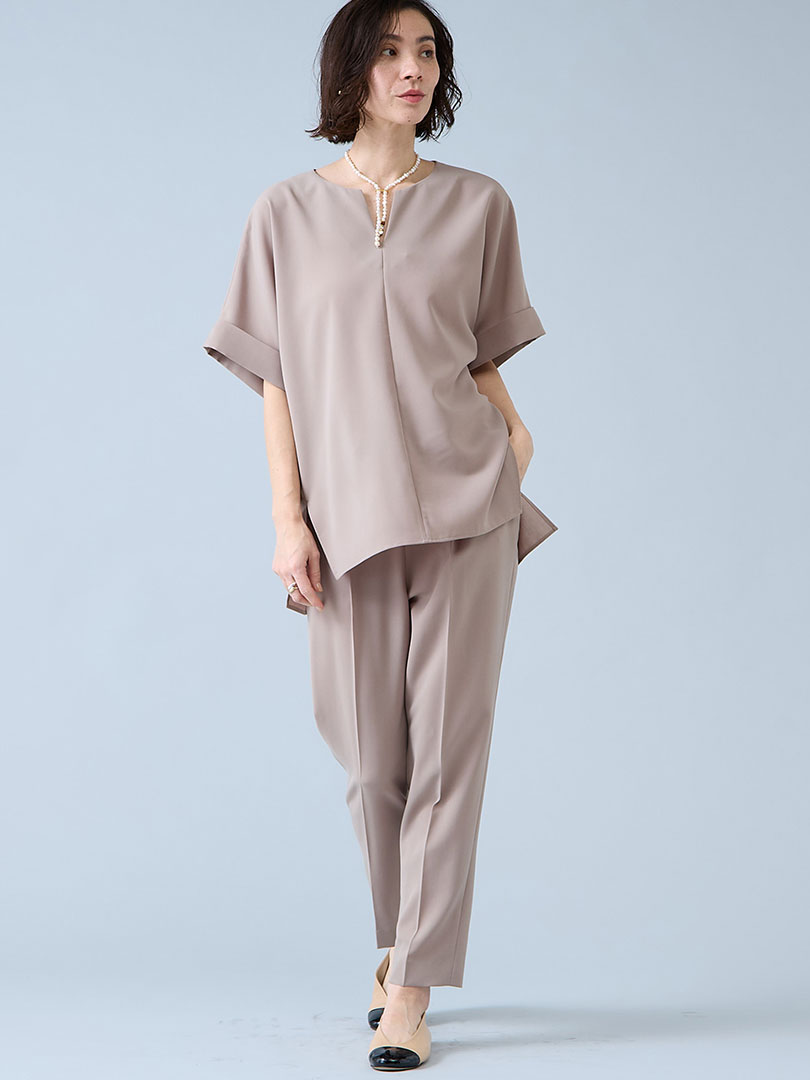 マット上品な質感と軽やかな着心地が存在感抜群のアイテム。 品の良さがあるのでお仕事着にもマッチ。長年愛されるリエス定番アイテムは、細見えを叶えるブラウスと美脚ラインのテーパードパンツ。きれいめなスタイルをキープしながら、イージーケアで快適さと実用性を兼ね備えたセットアップです。